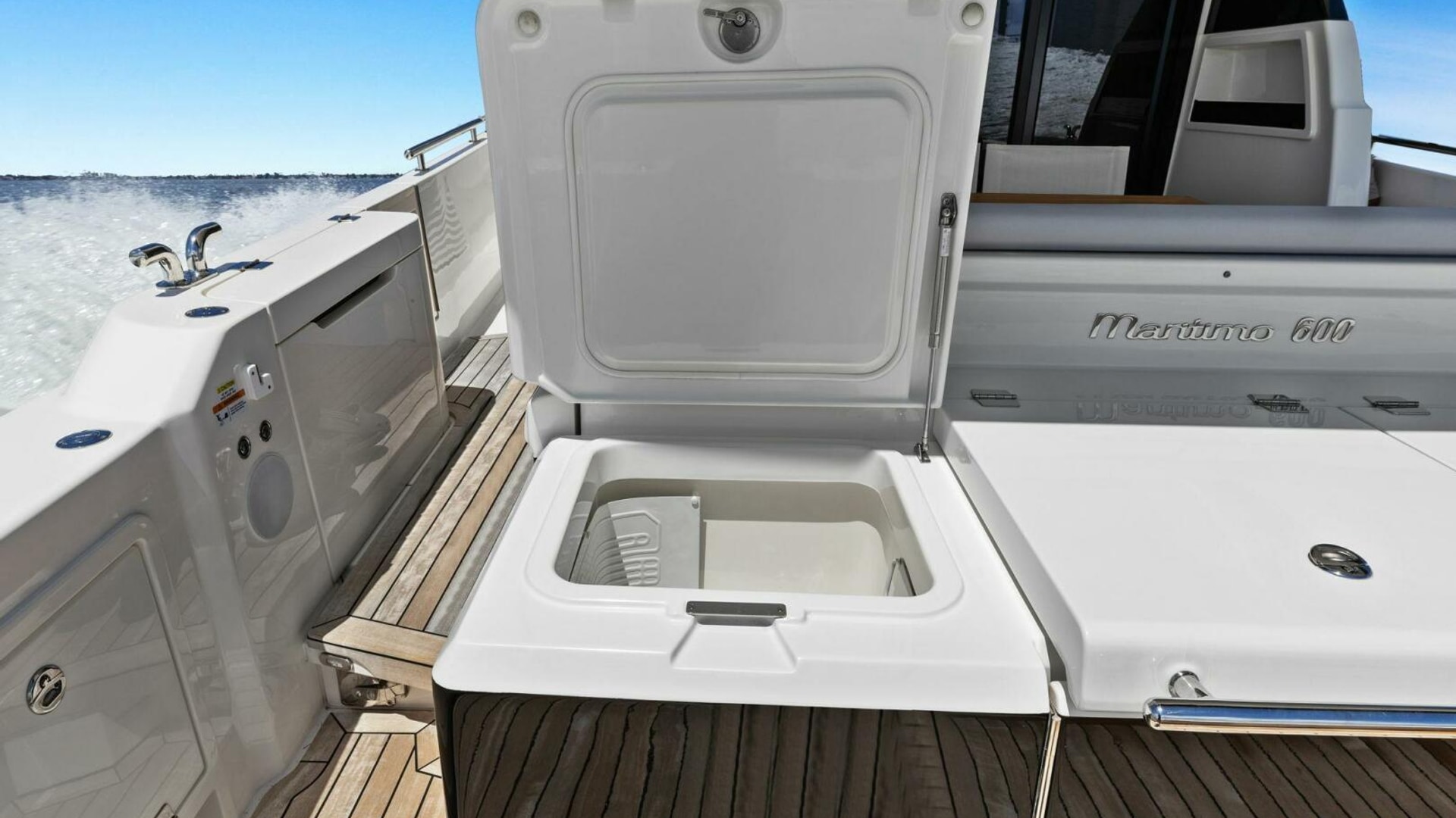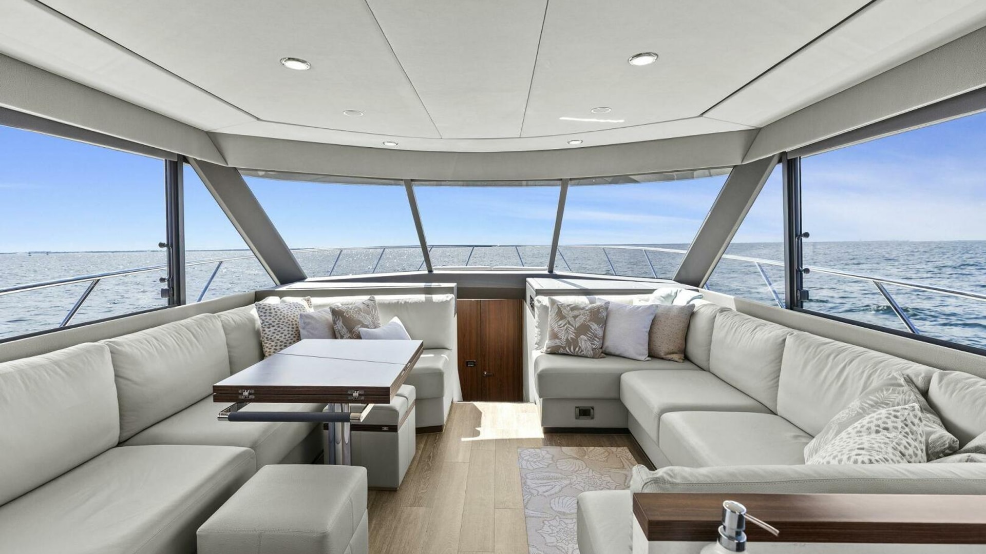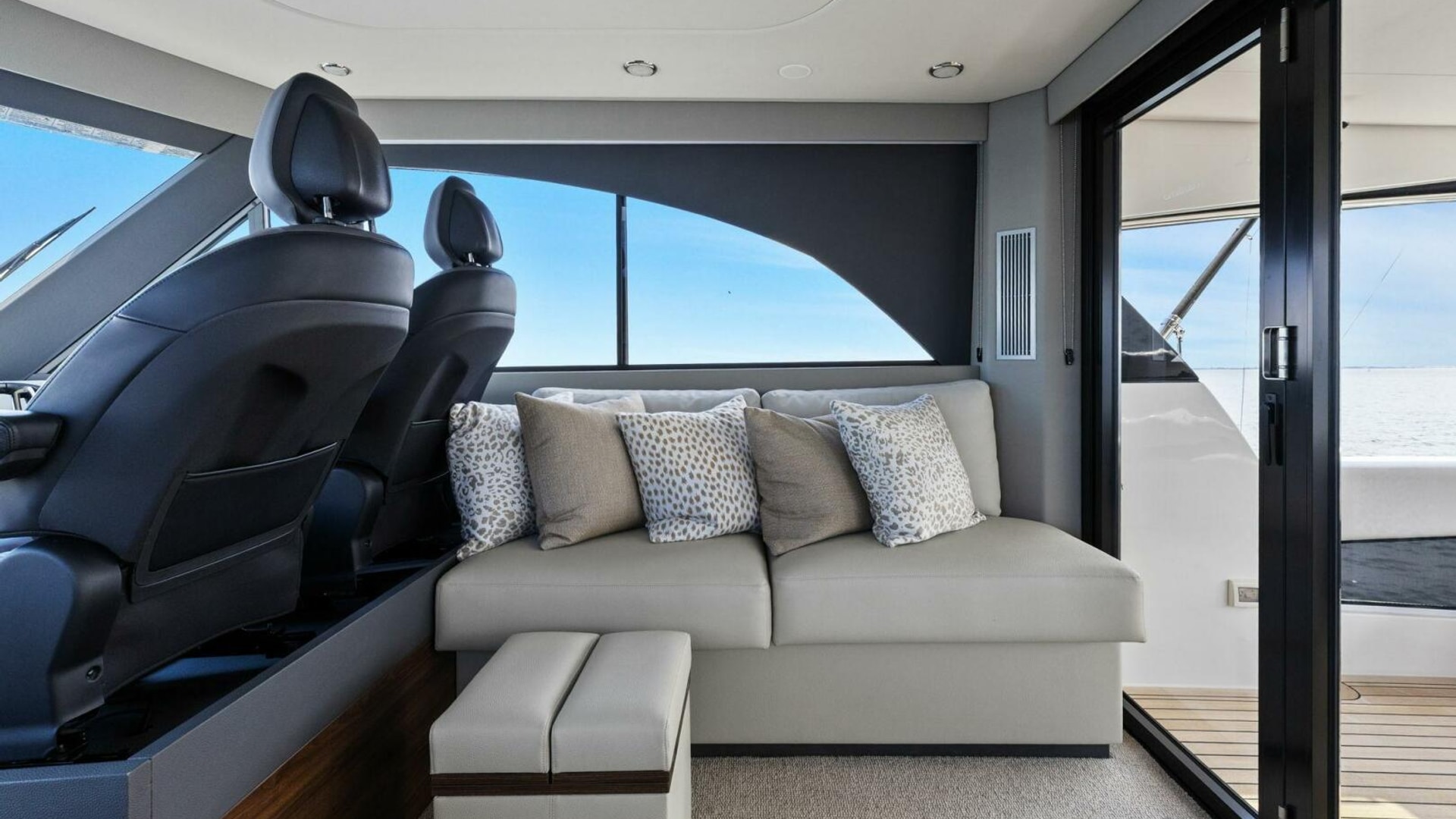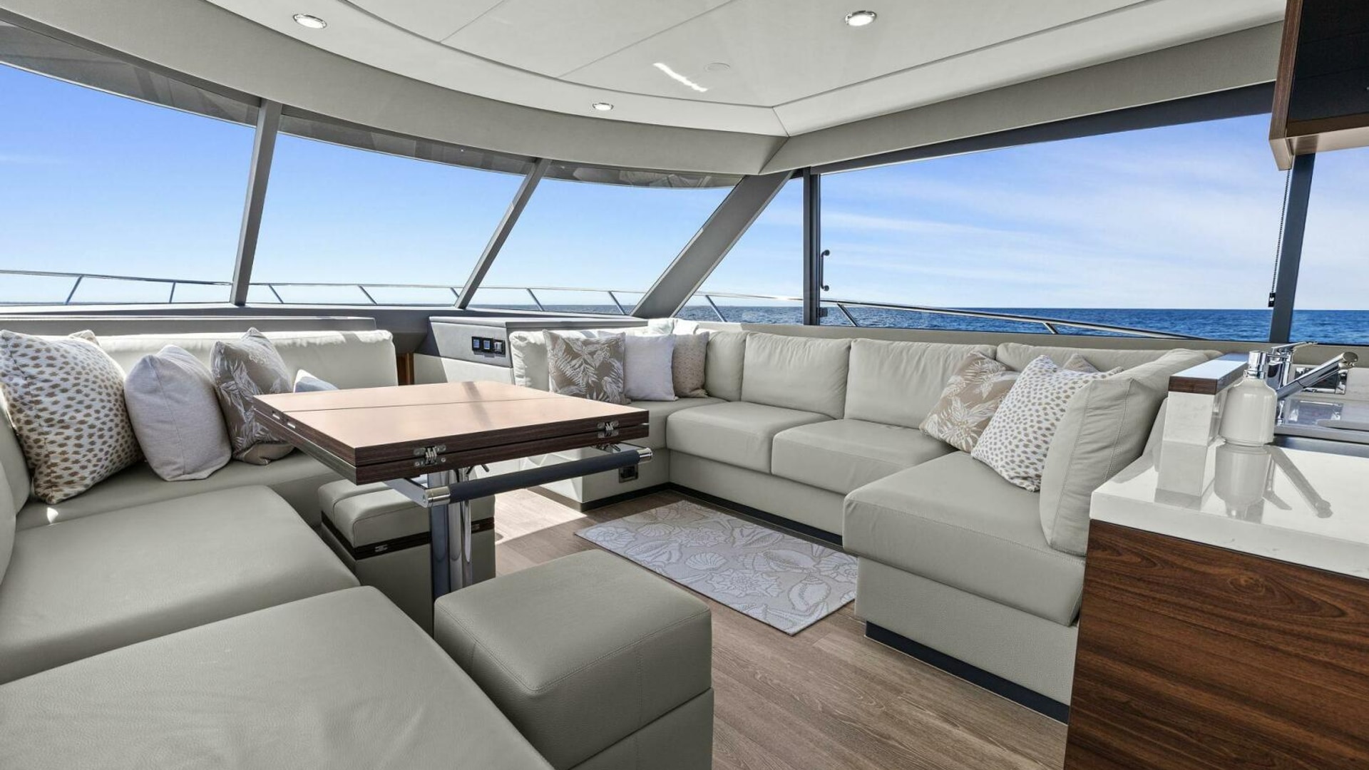 - Windows & Doors: Maritimo panoramic sliding windows (salon & flybridge), bi-fold doors to galley