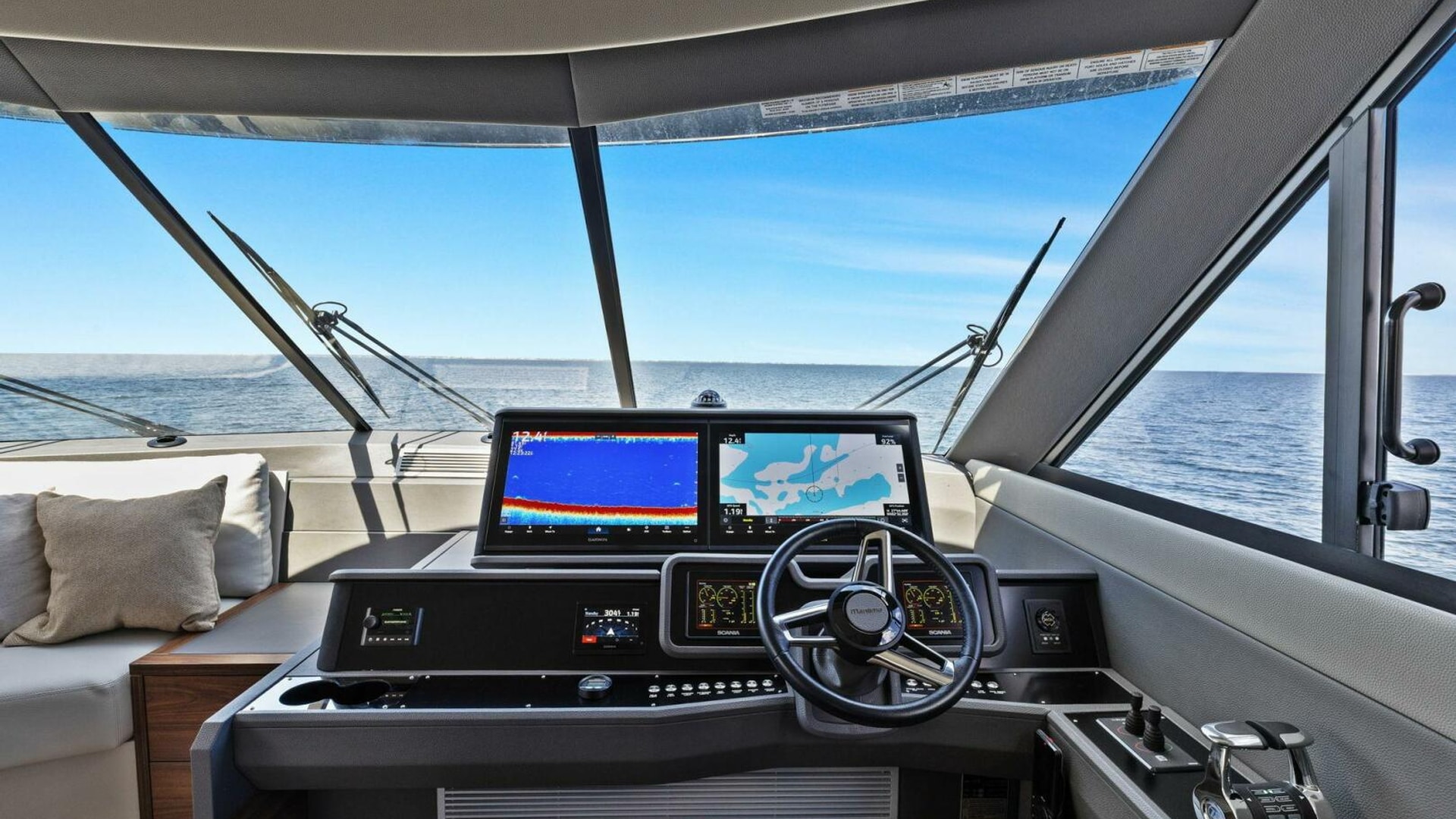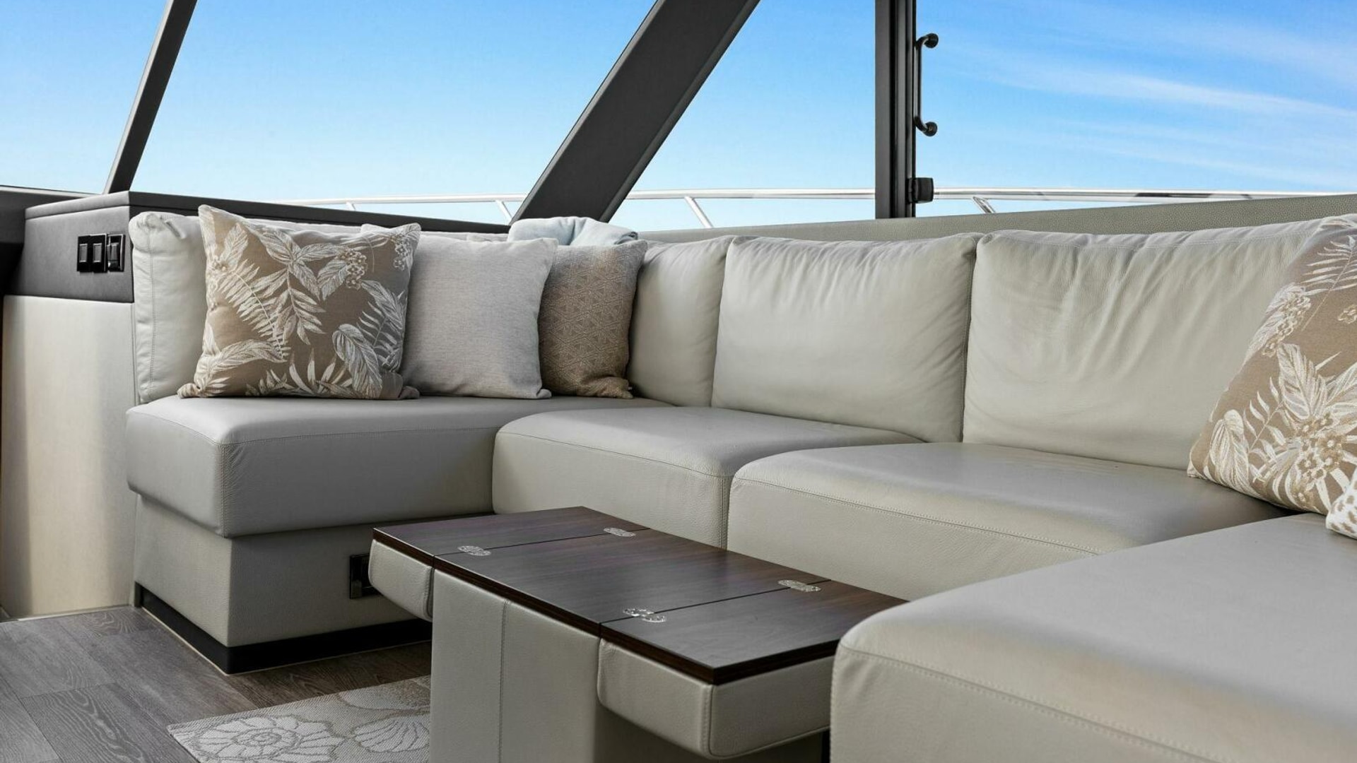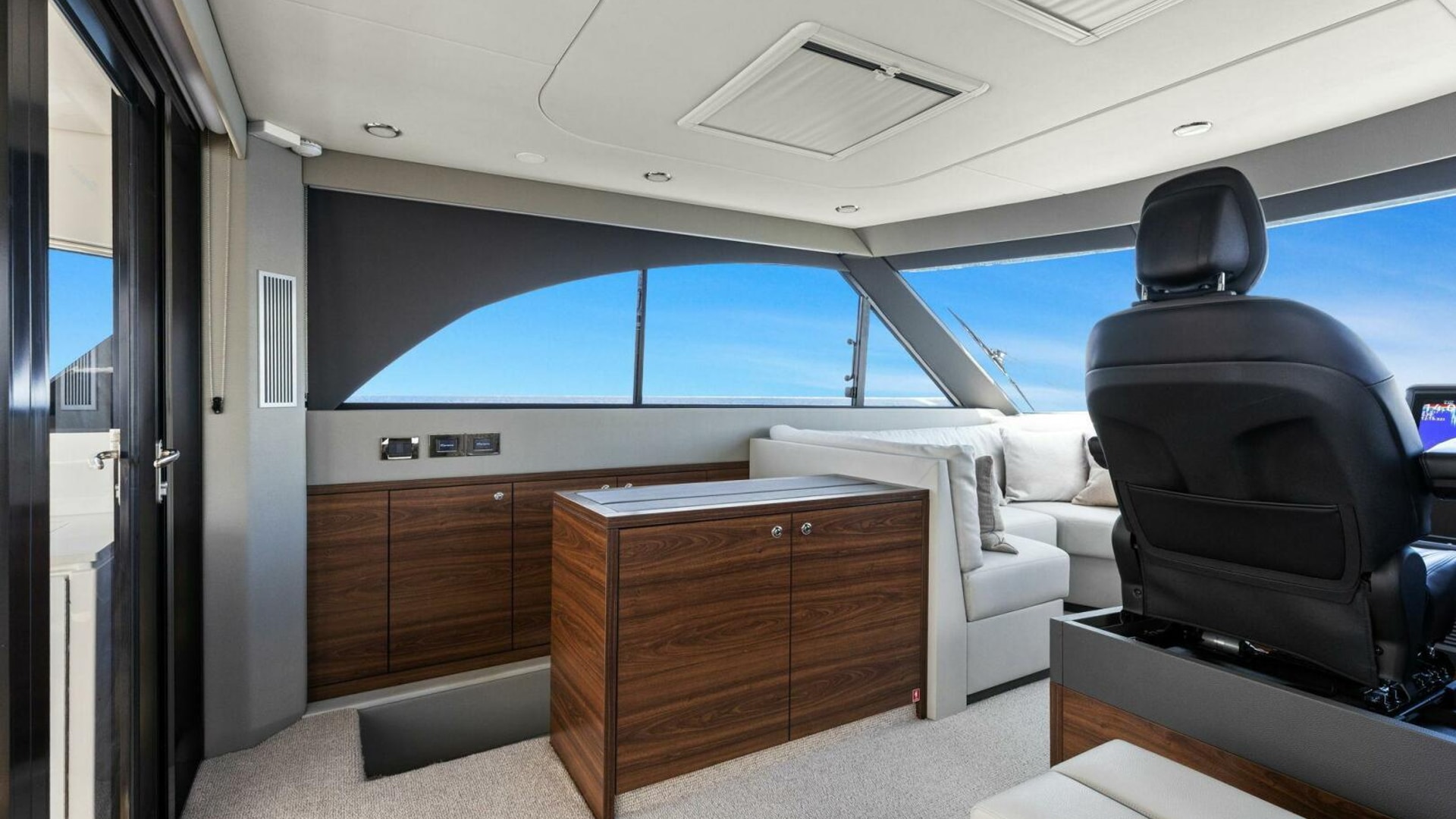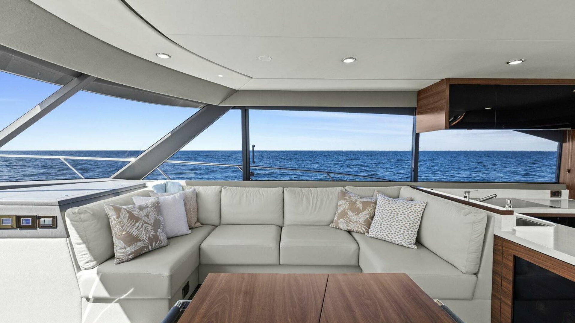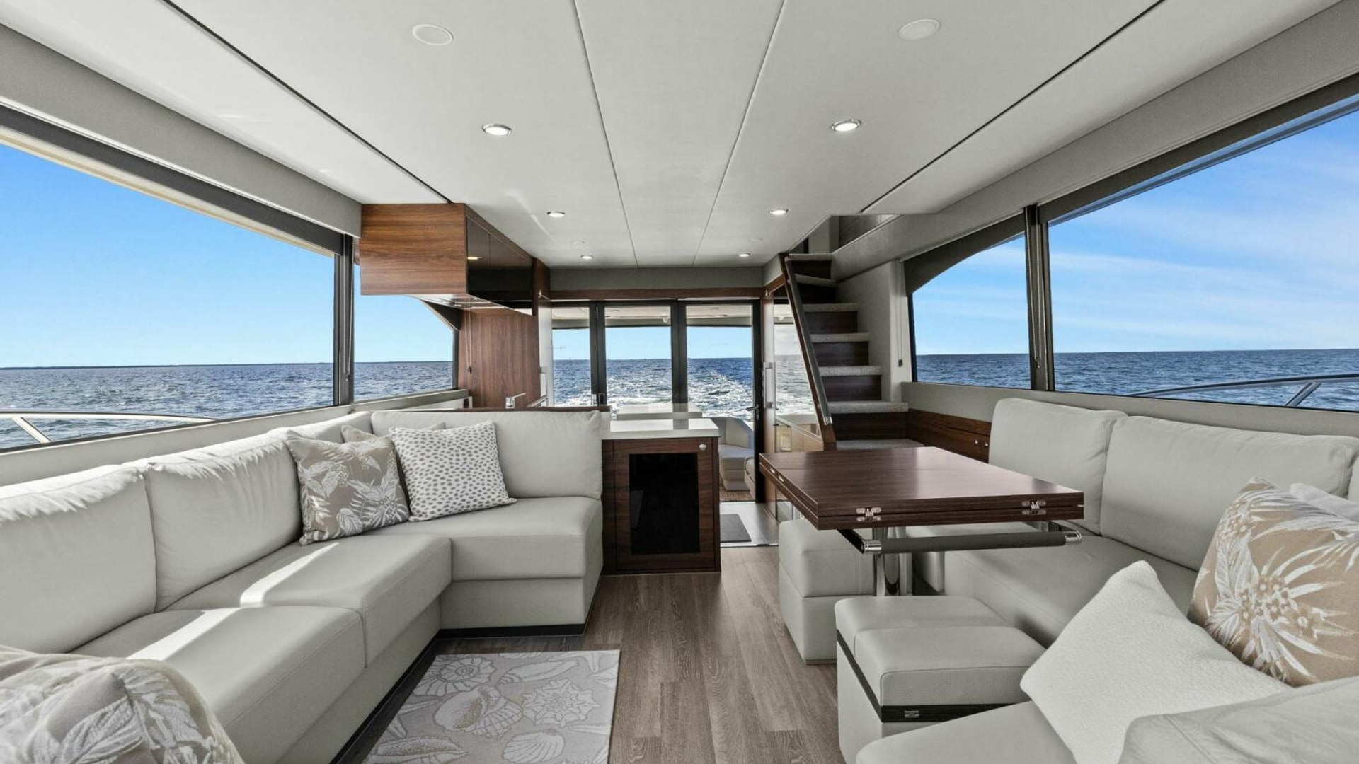 - Windows & Doors: Maritimo panoramic sliding windows (salon & flybridge), bi-fold doors to galley