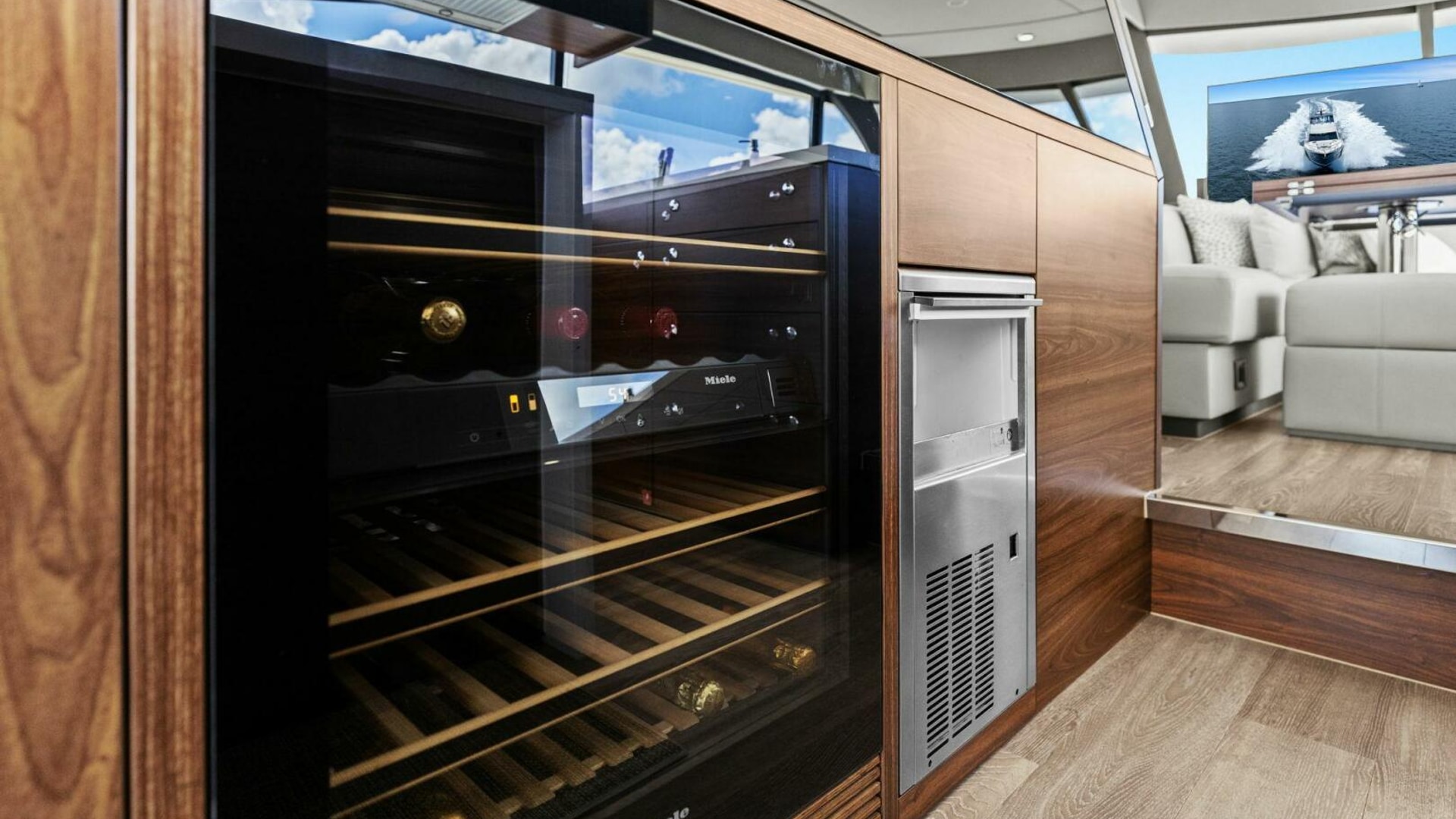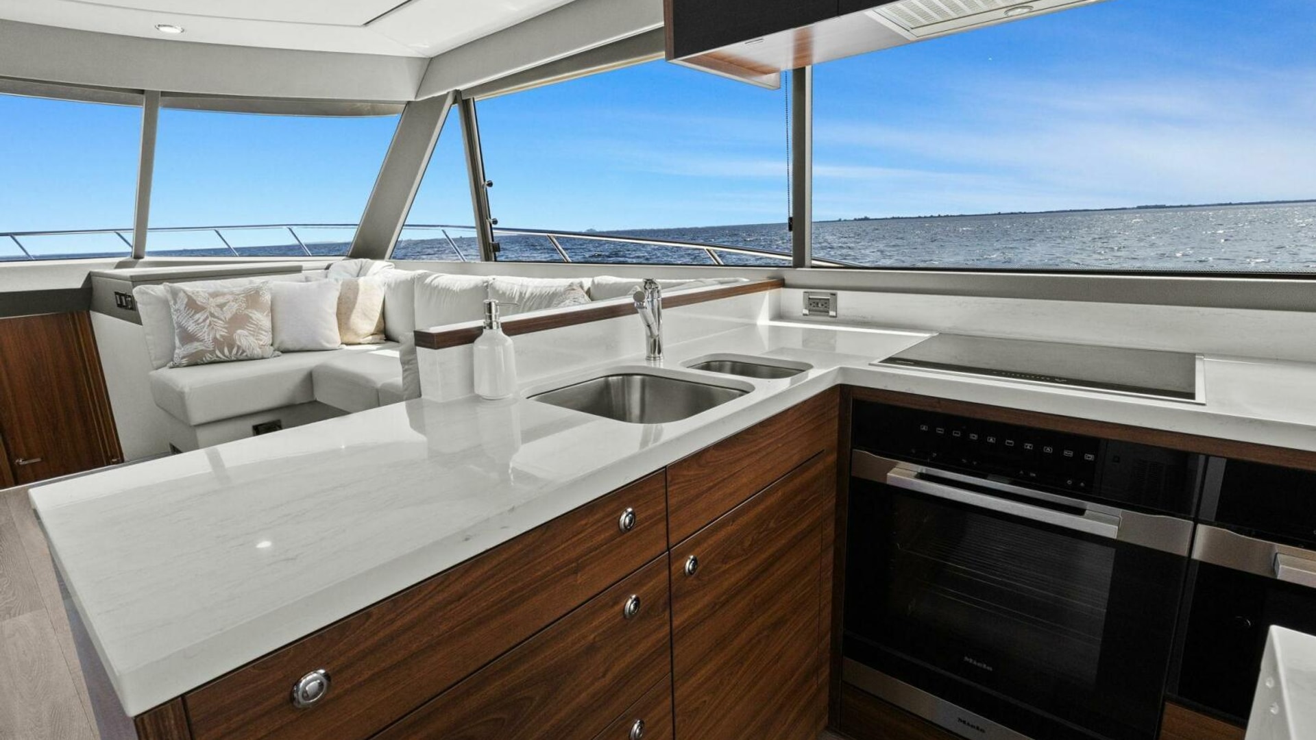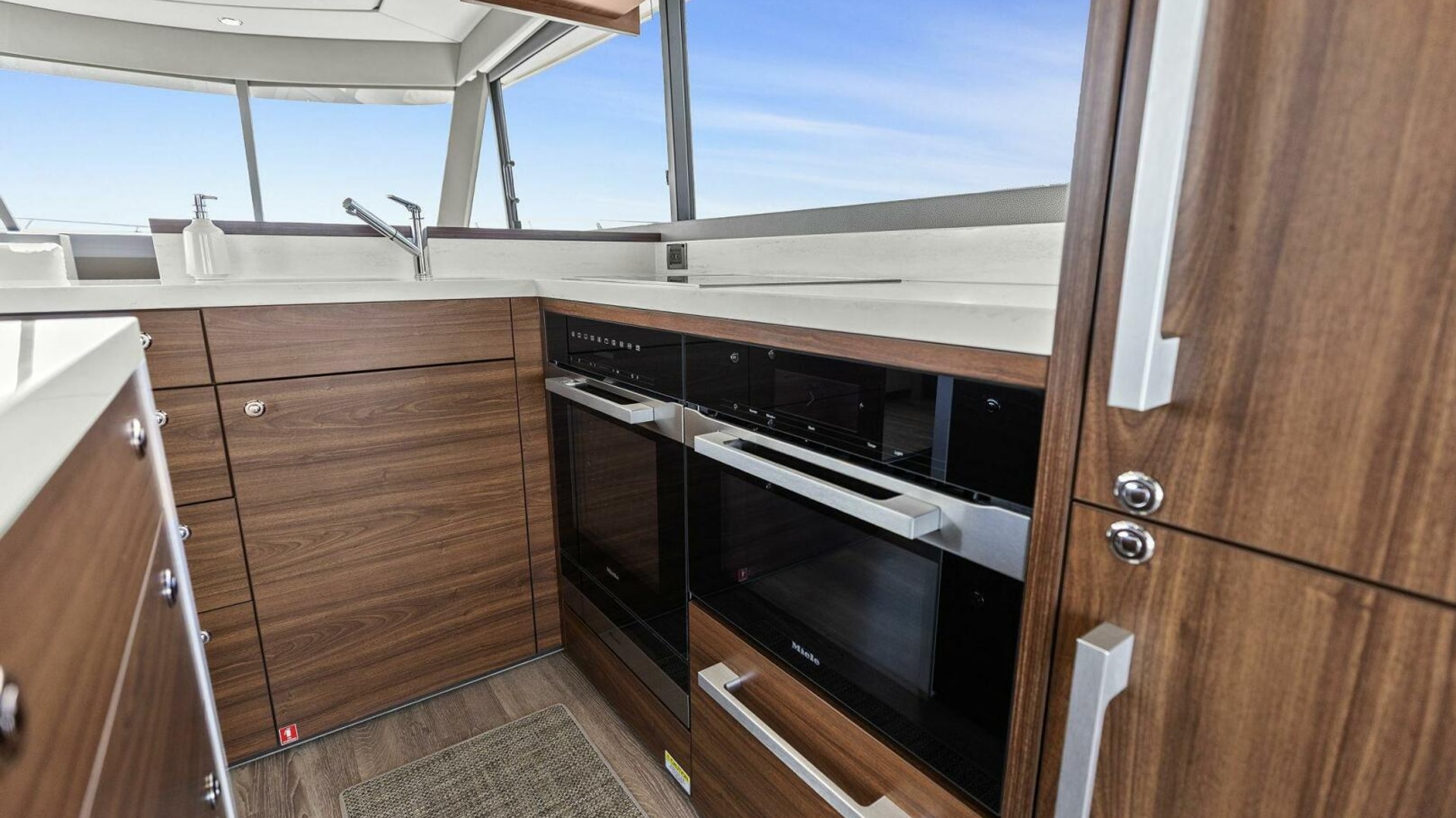 - Galley Upgrades: Miele package with two-door fridge, convection microwave, range hood, 4-burner cooktop, and wine fridge