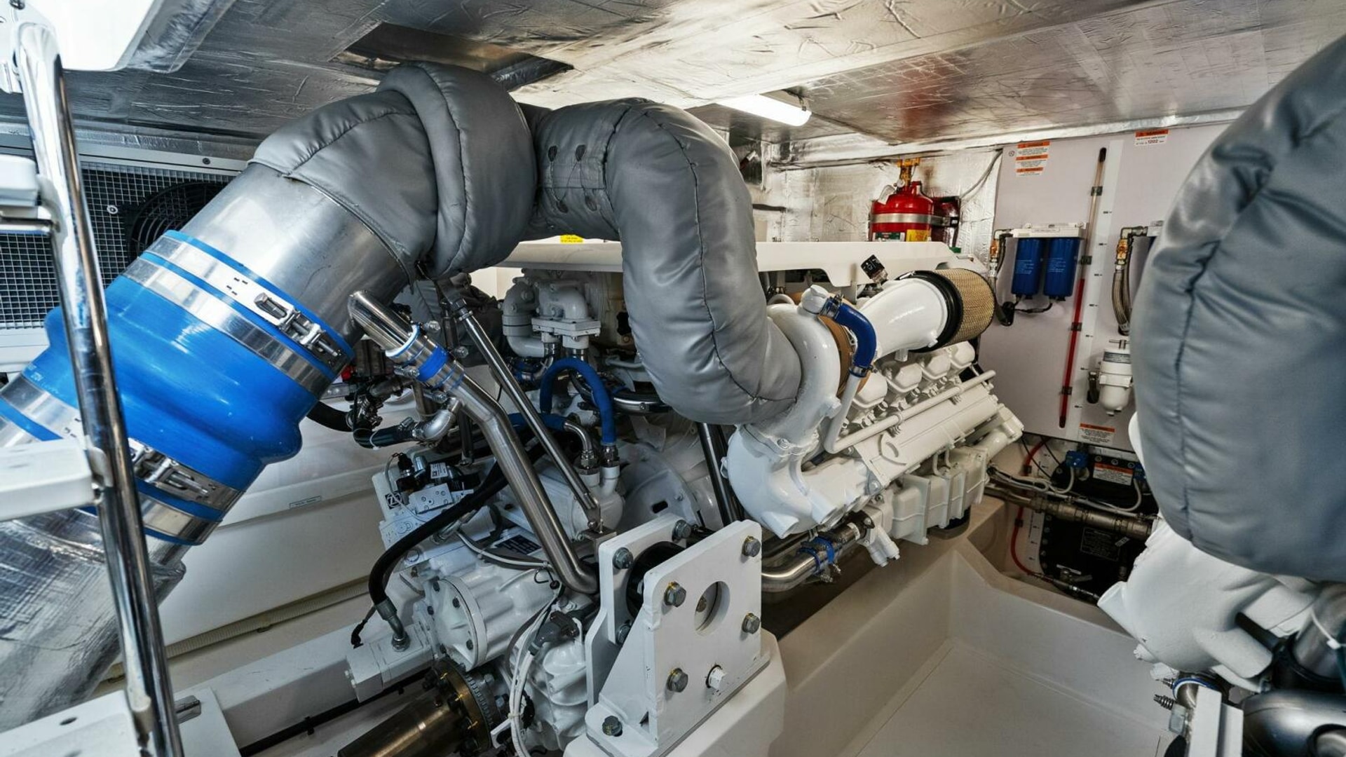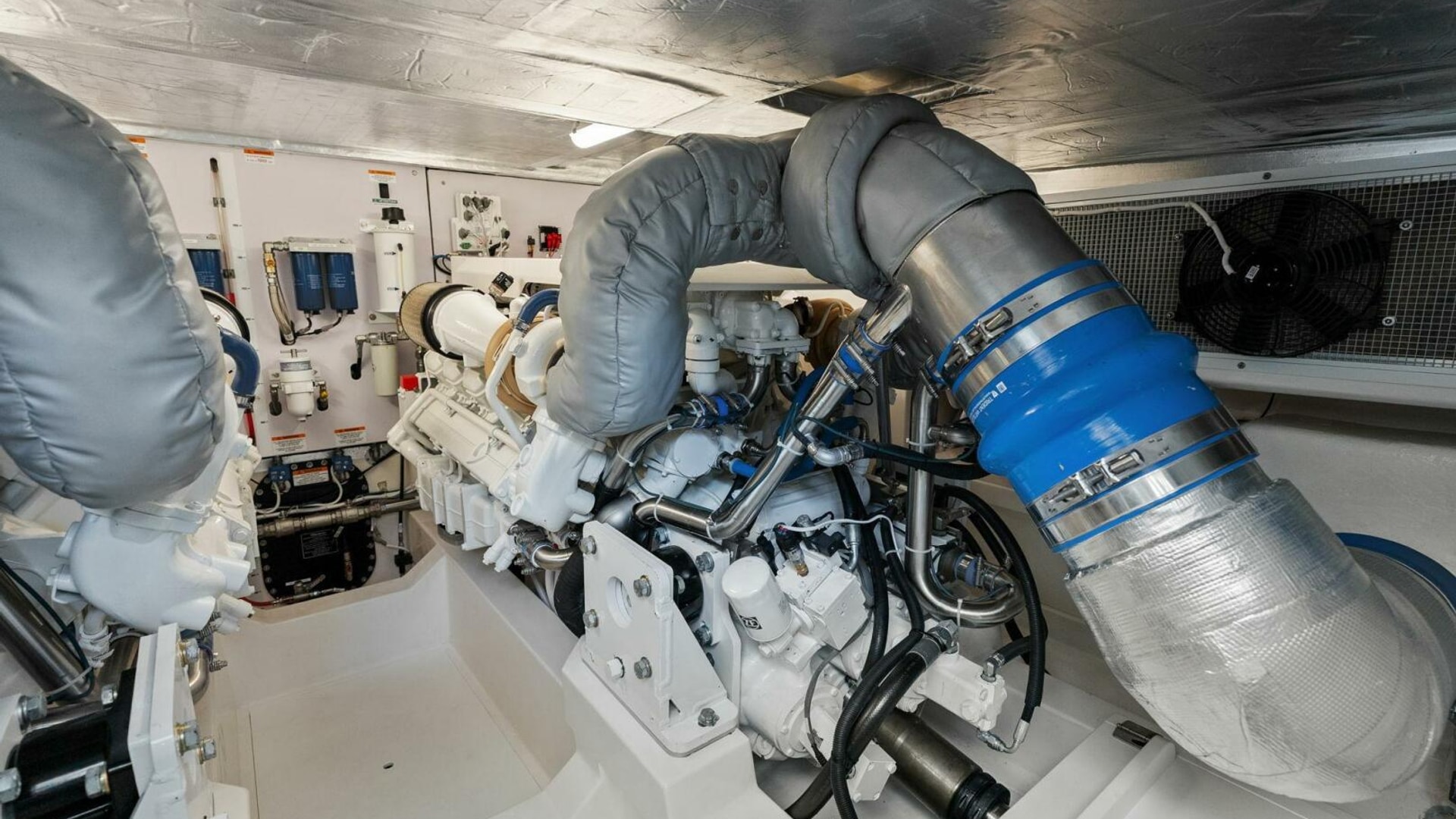 - Continuous fan ducted to lazarette and engine room light switch, additional waterproof 110V outlet on flybridge along with a water spigot for easy washdowns