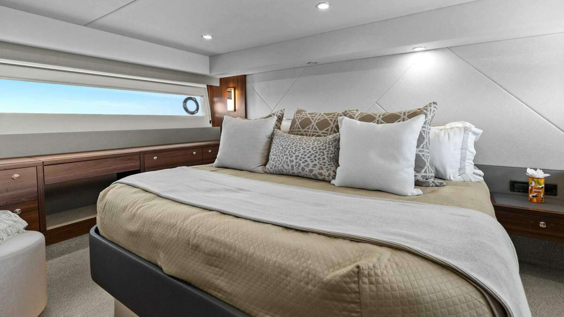 - Interior Comfort: Custom Ottomans, upgraded Cavalier Bremworth carpet, Shangri-La blinds with reflective blockouts, master stateroom safe.