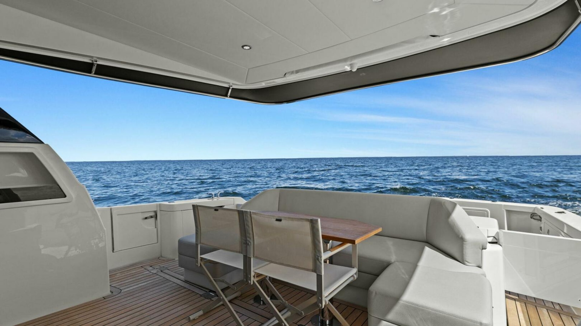 - Cockpit: Extended, Custom U-shaped seating with table, chaise lounge ottomans, side boarding gates, thruster and engine controls, aft drop cover