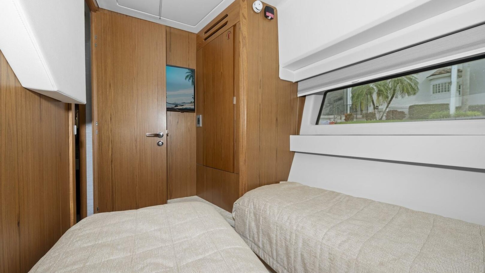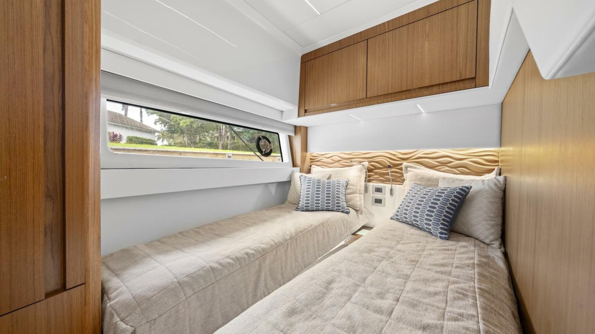 - Port and starboard insulated cockpit floor storage/fish wells with macerators, 80 gallons each