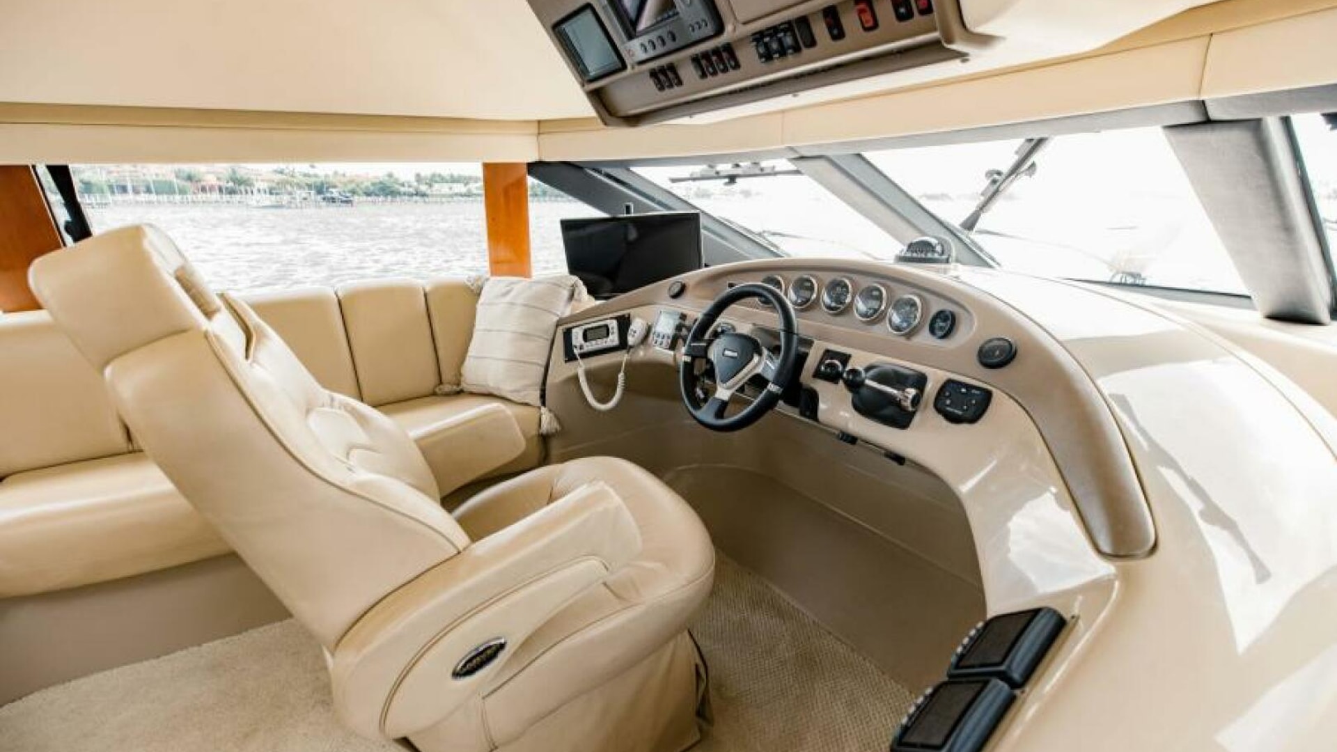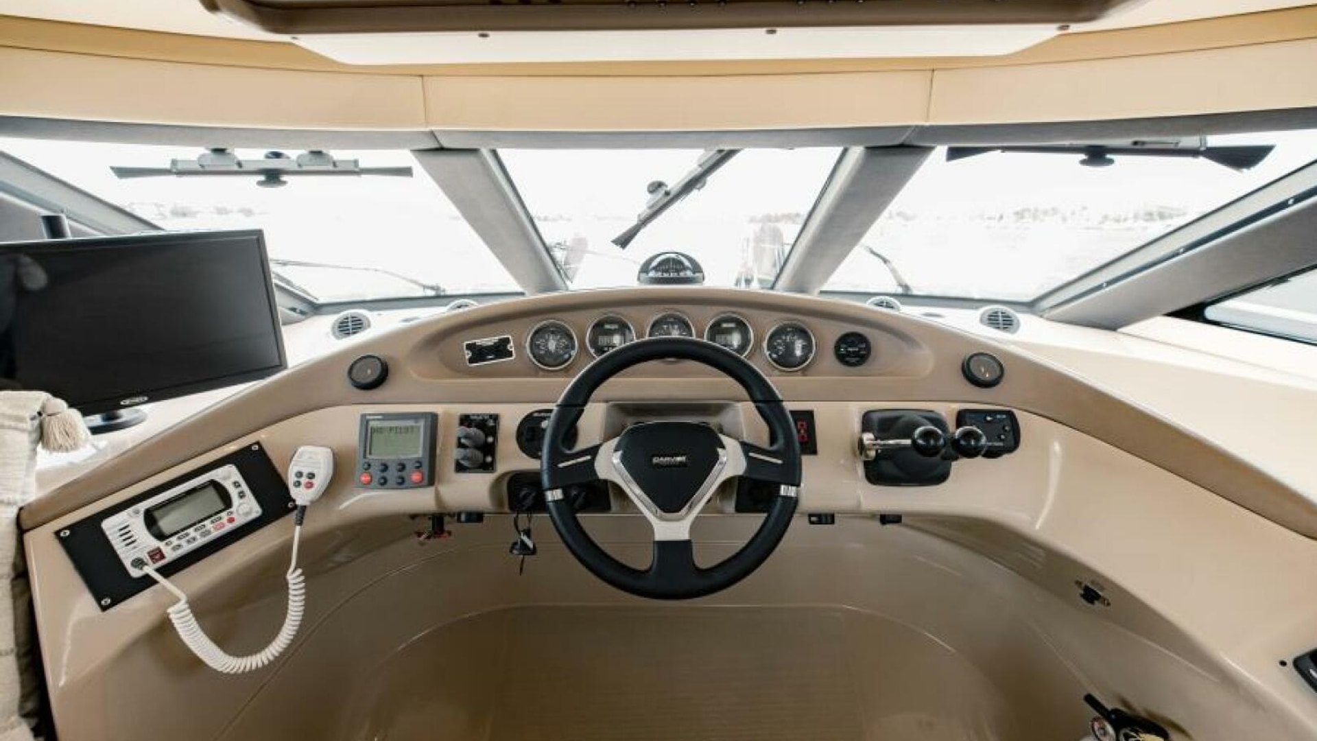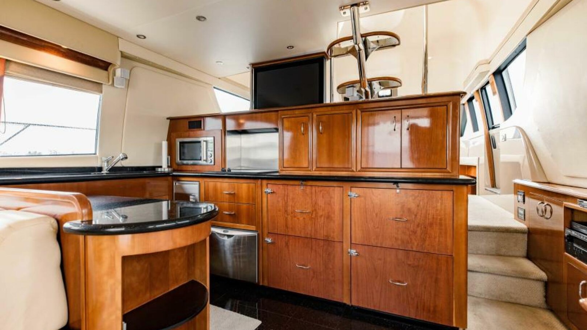 A top-selling boat, the Carver 560 Voyager is a stretched version of the Carver 530 Voyager, but with a revised main salon/galley and minor exterior styling updates, including distinctive hull side windows. A heavily built yacht designed for extended cruising, the Voyager’s modest 15’4” beam results in somewhat smaller interior spaces than many motor yachts in this size range. That said, the salon’s social area includes twin wall-hugging recliners, hi/lo cocktail table, and a comfortable L-shaped sofa to port. An entertainment system features a retractable 30” LCD TV that floats above the fully equipped galley when engaged. Big frameless windows and nearly seven feet of headroom make the Voyager’s salon seem especially open and airy. Below, the amidships master stateroom features a walkaround queen berth and an ensuite head with tub/shower. The VIP guest stateroom forward includes a queen, and the second guest stateroom to port offers over/under bunks. The flybridge can be accessed from both the cockpit and the pilothouse. Volvo 675 diesels cruise at 22-24 knots (PowerBoatGuide.com)