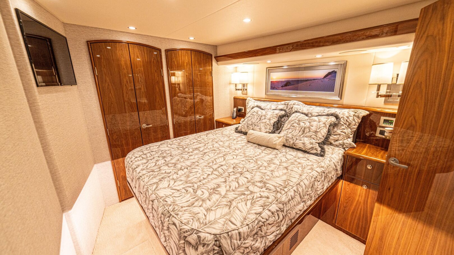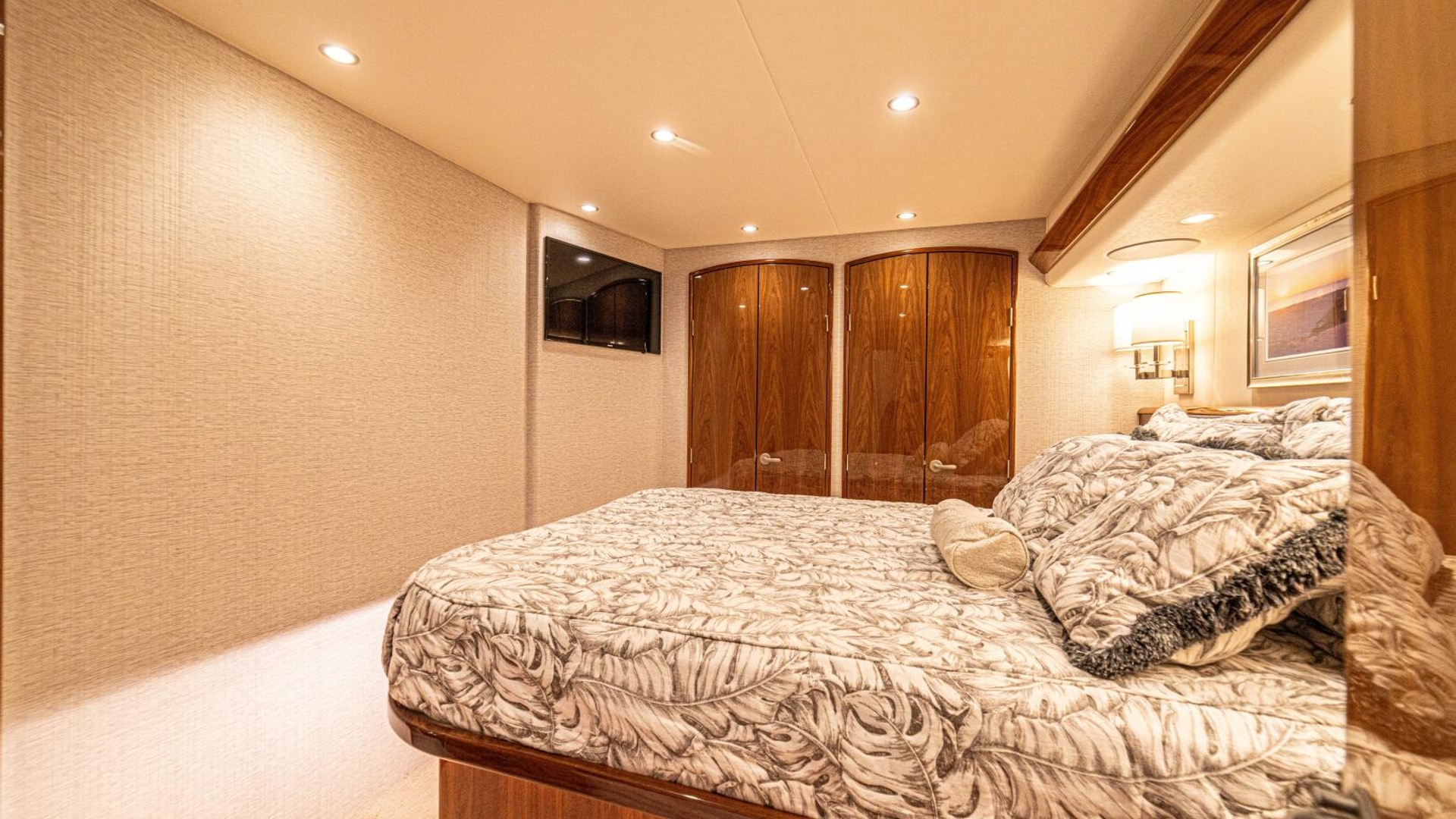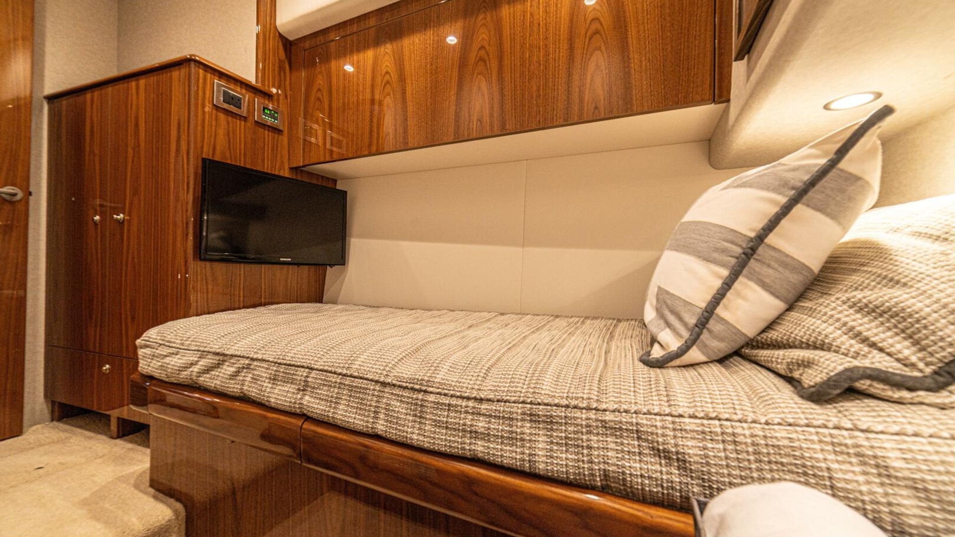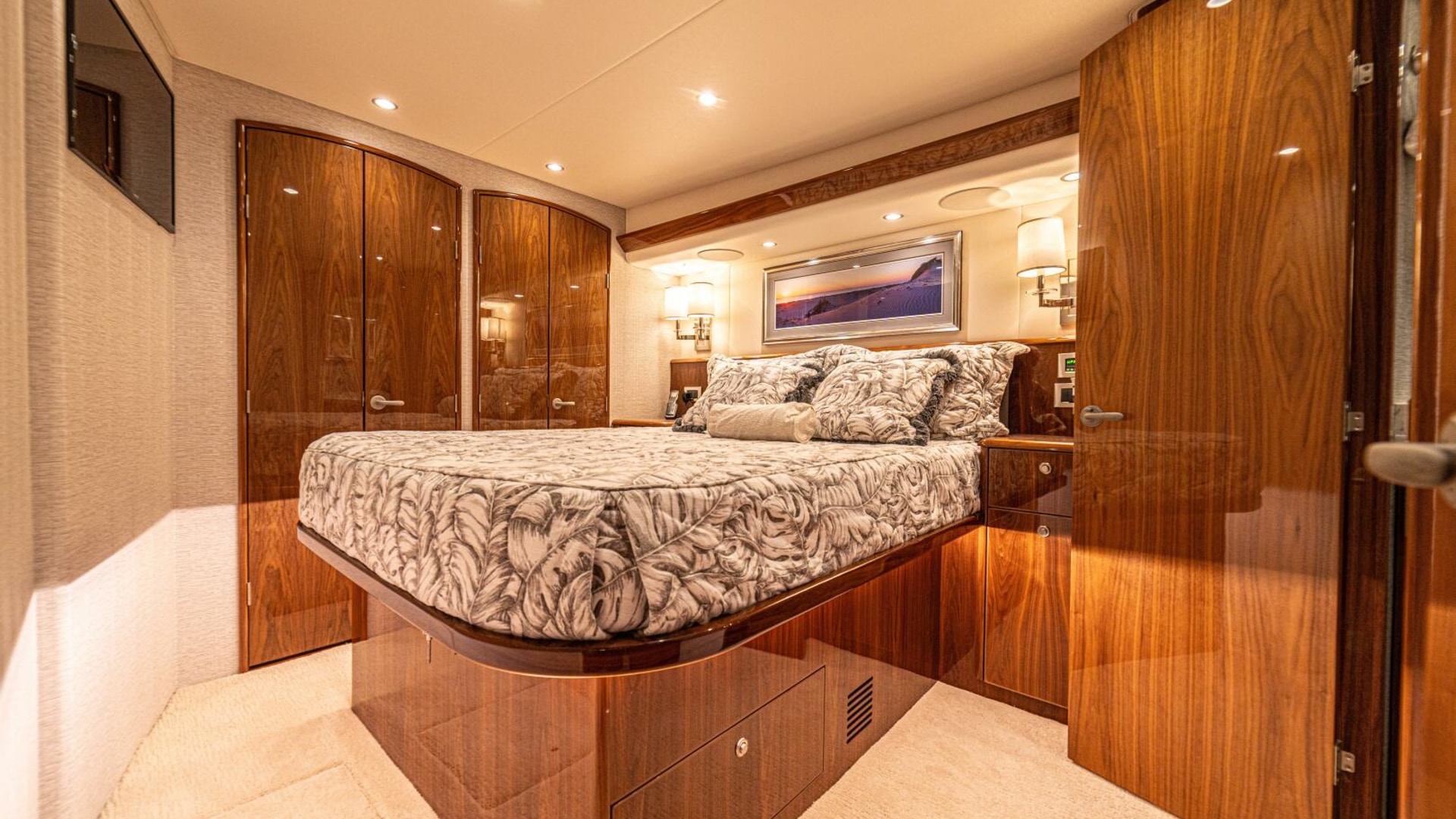 - Flat-screen TV concealed in starboard curved credenza on an electric lift