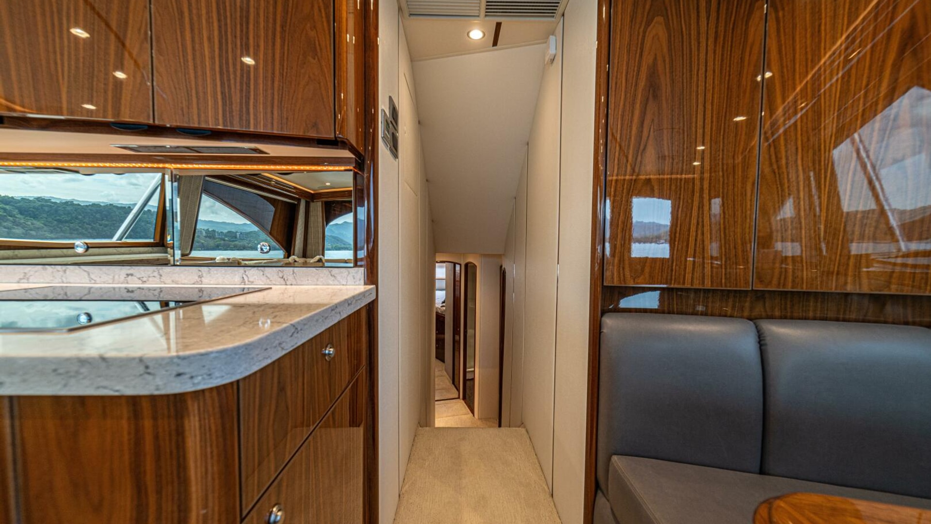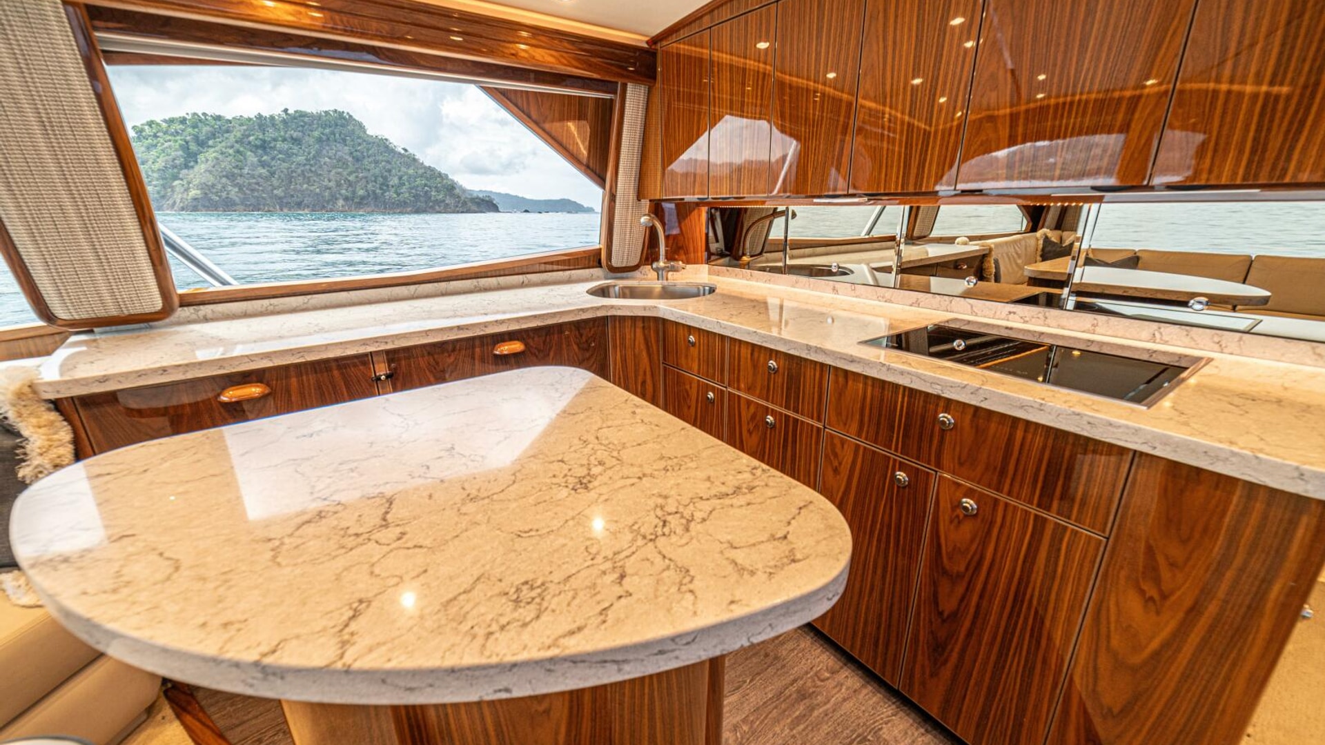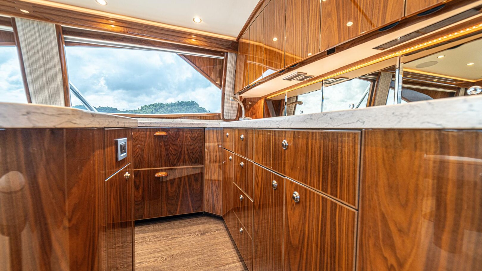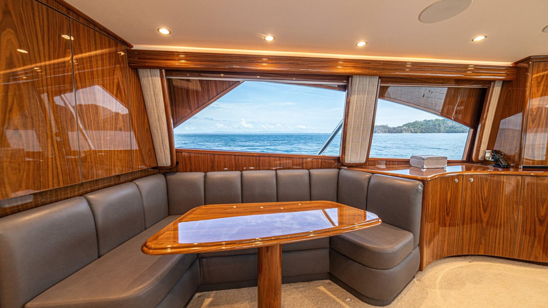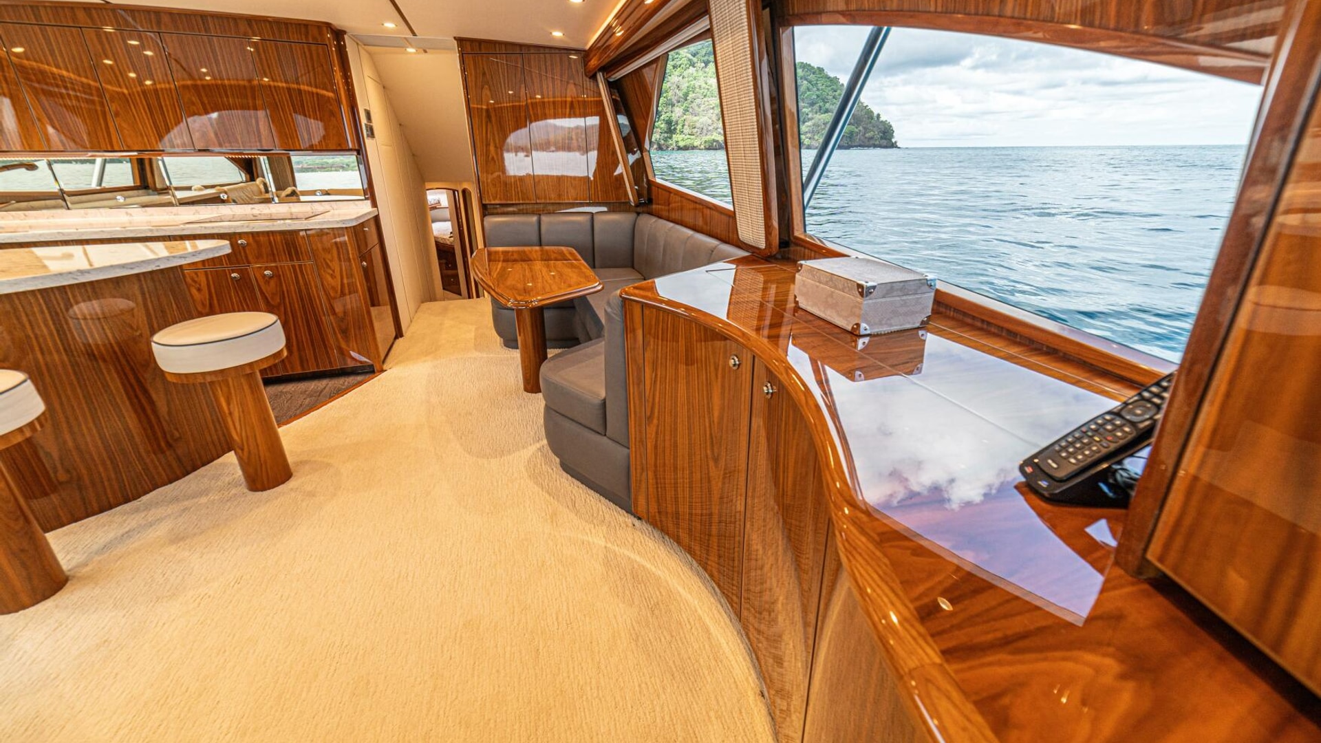 - Flat-screen TV concealed in starboard curved credenza on an electric lift