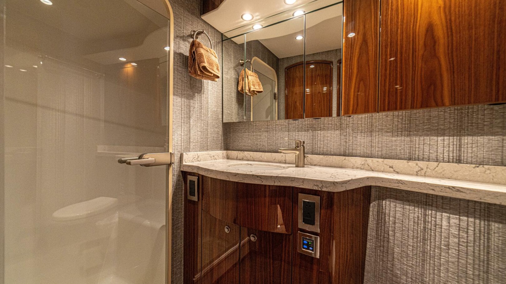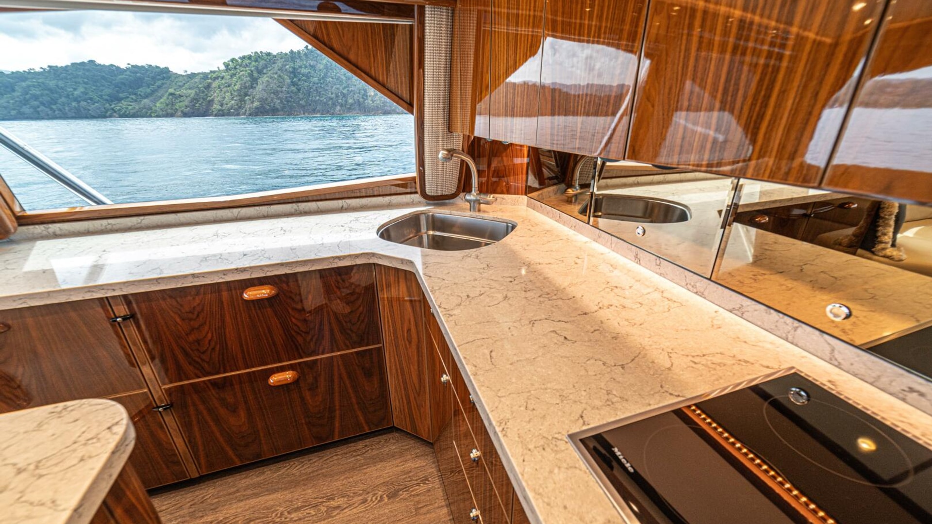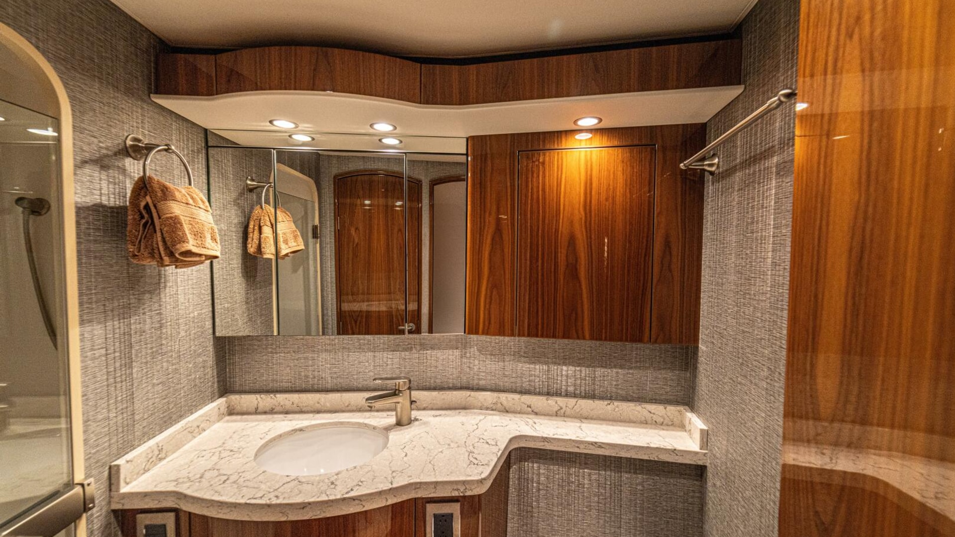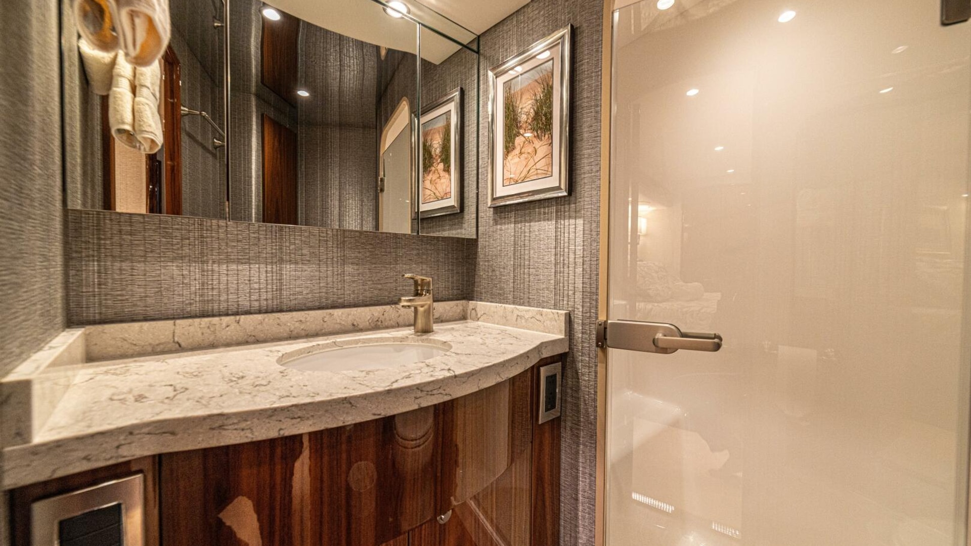 - Flat-screen TV concealed in starboard curved credenza on an electric lift