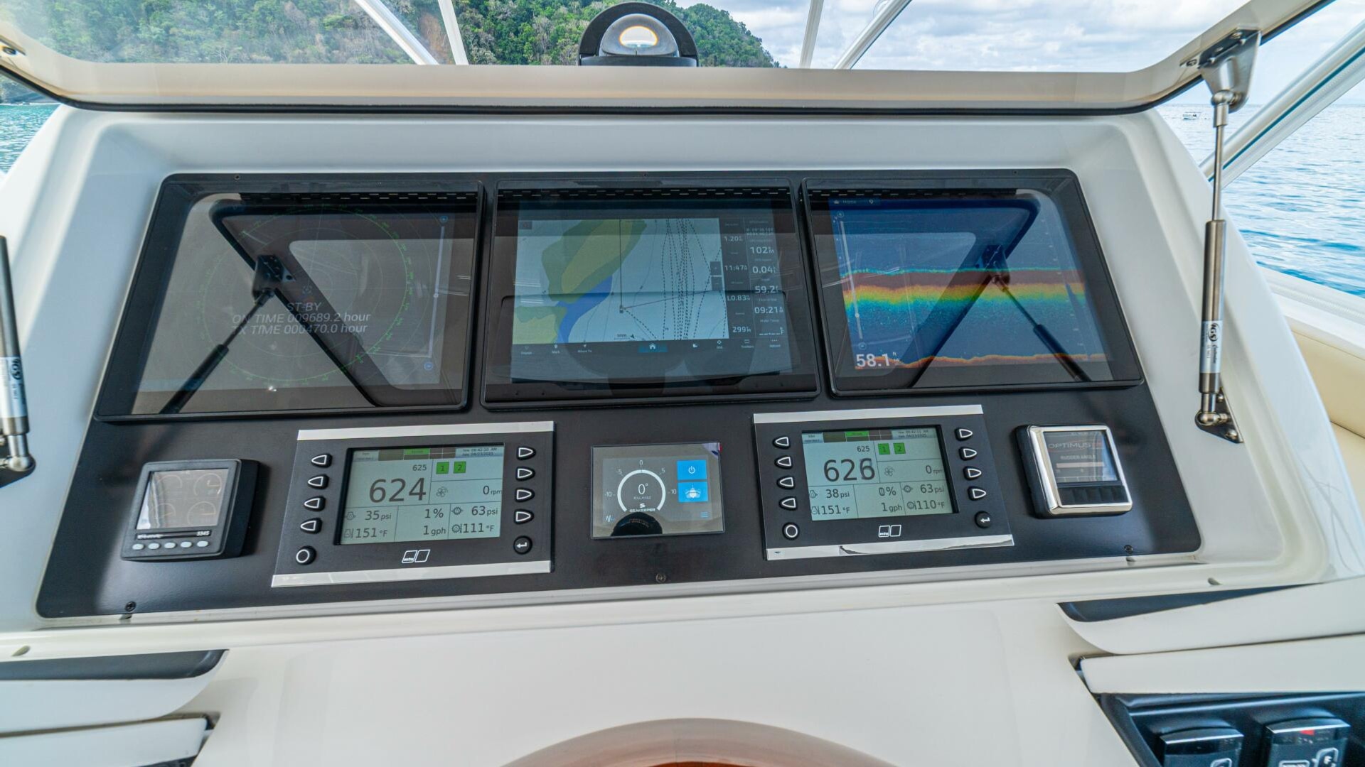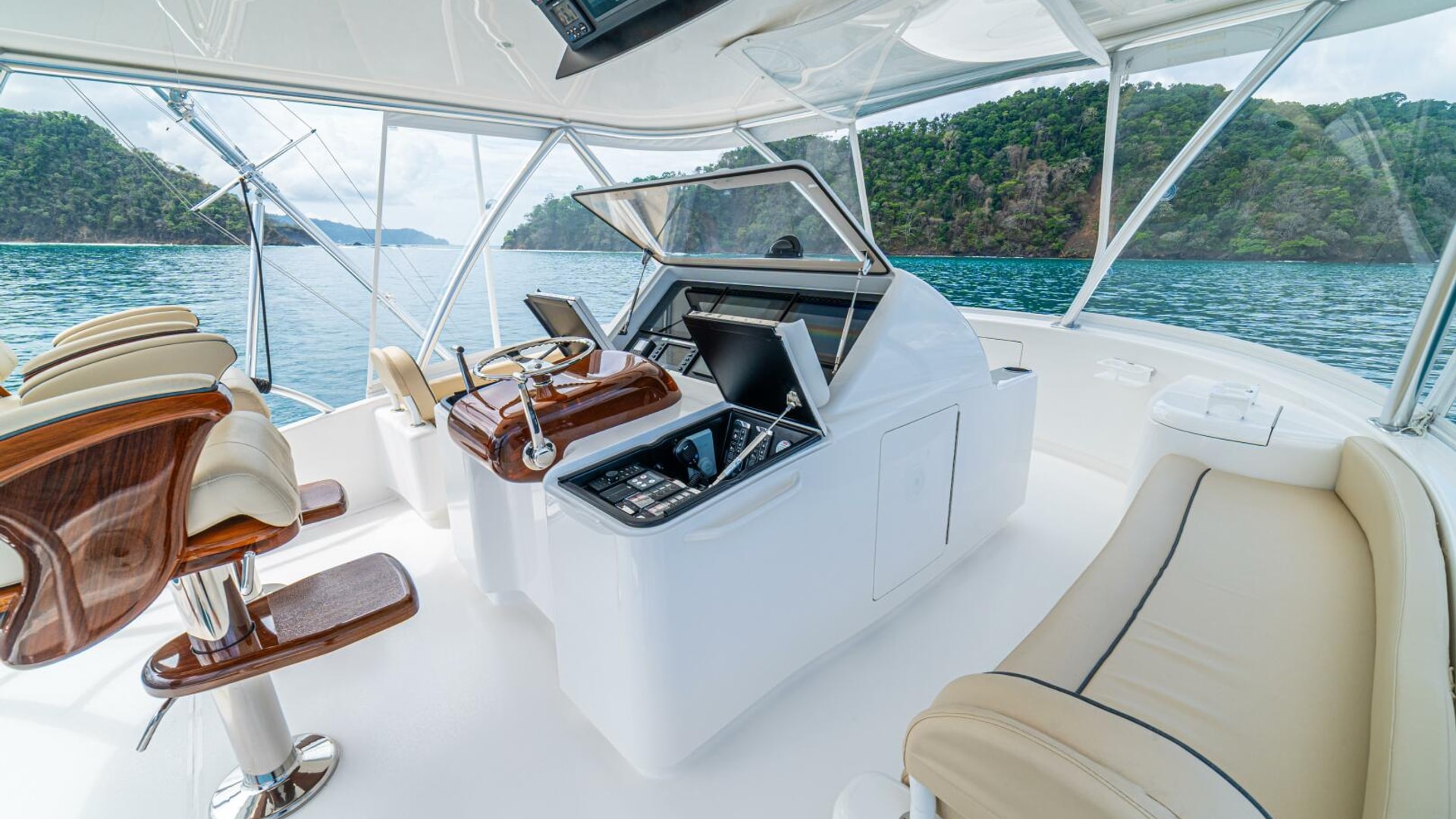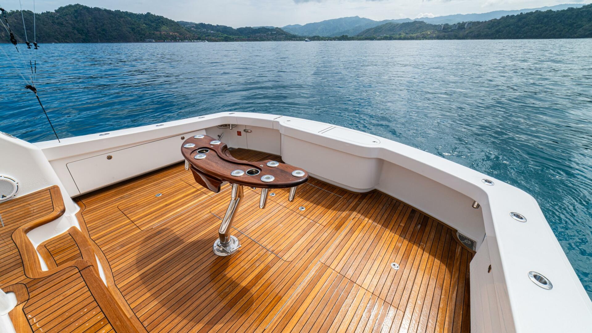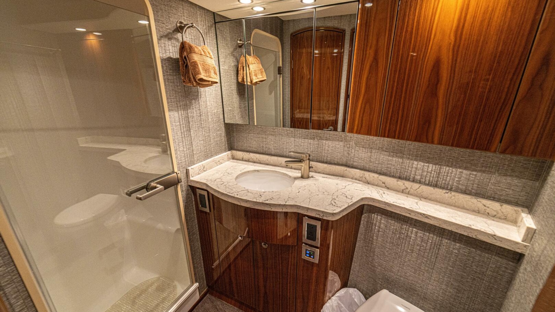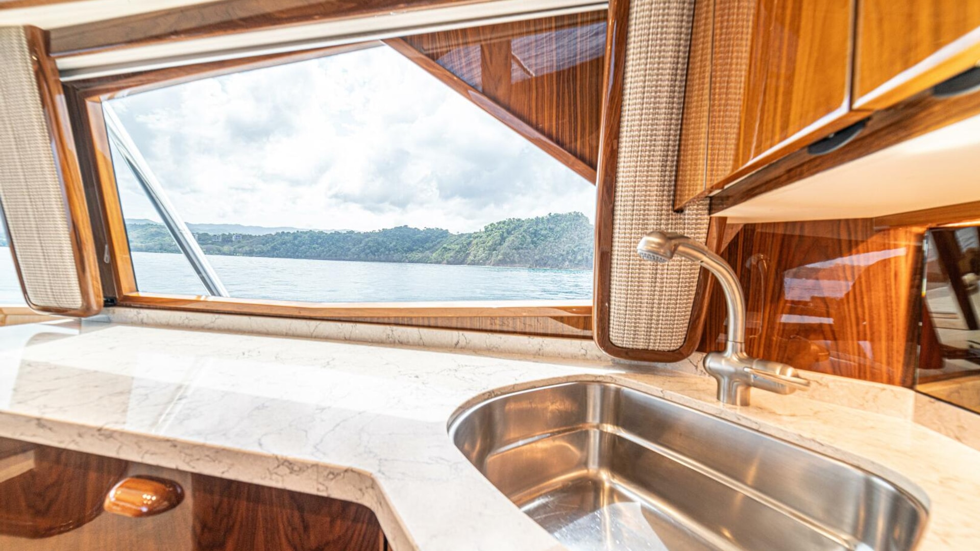 - Flat-screen TV concealed in starboard curved credenza on an electric lift