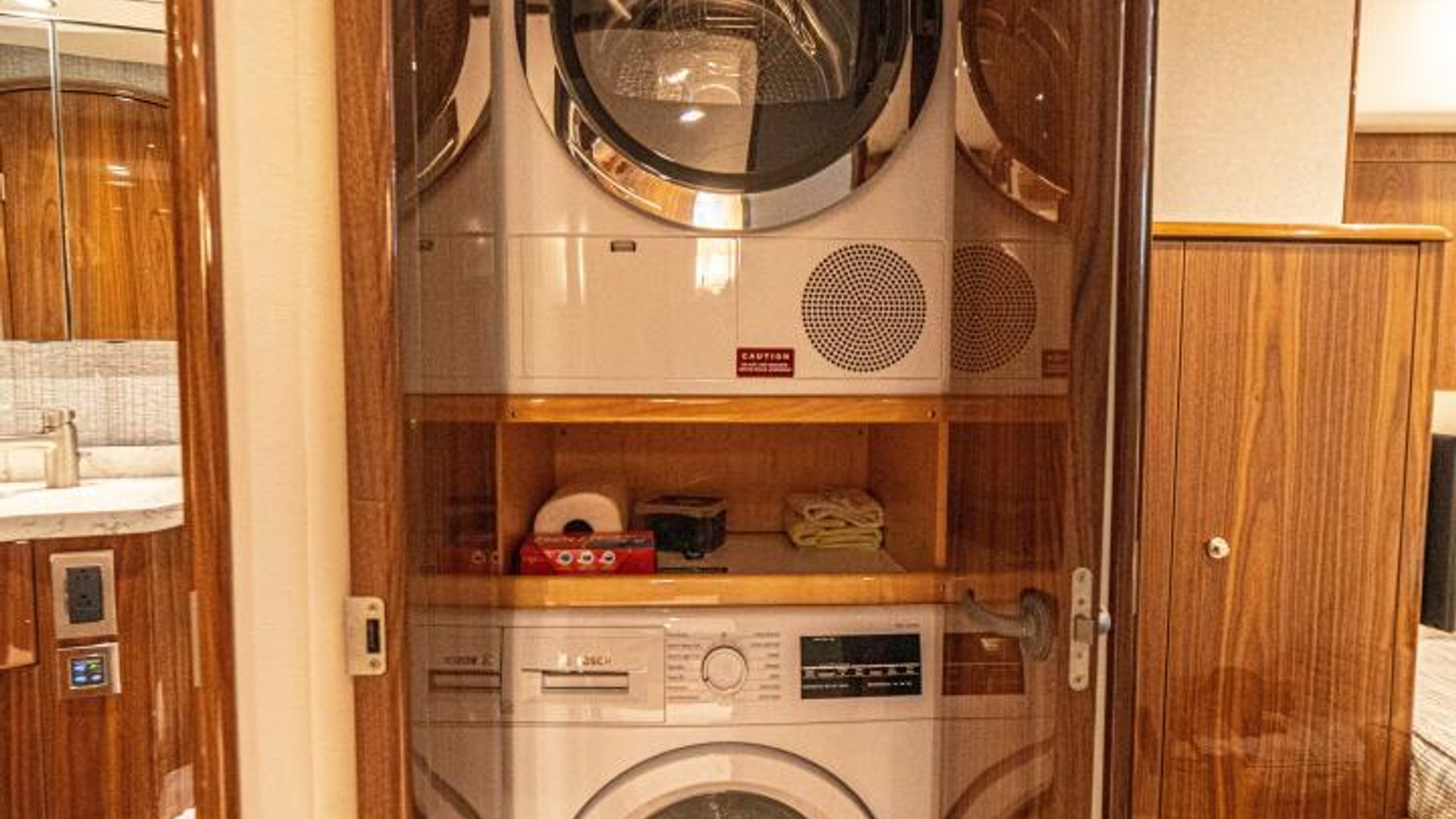 - Entertainment center cabinet to starboard behind walnut doors