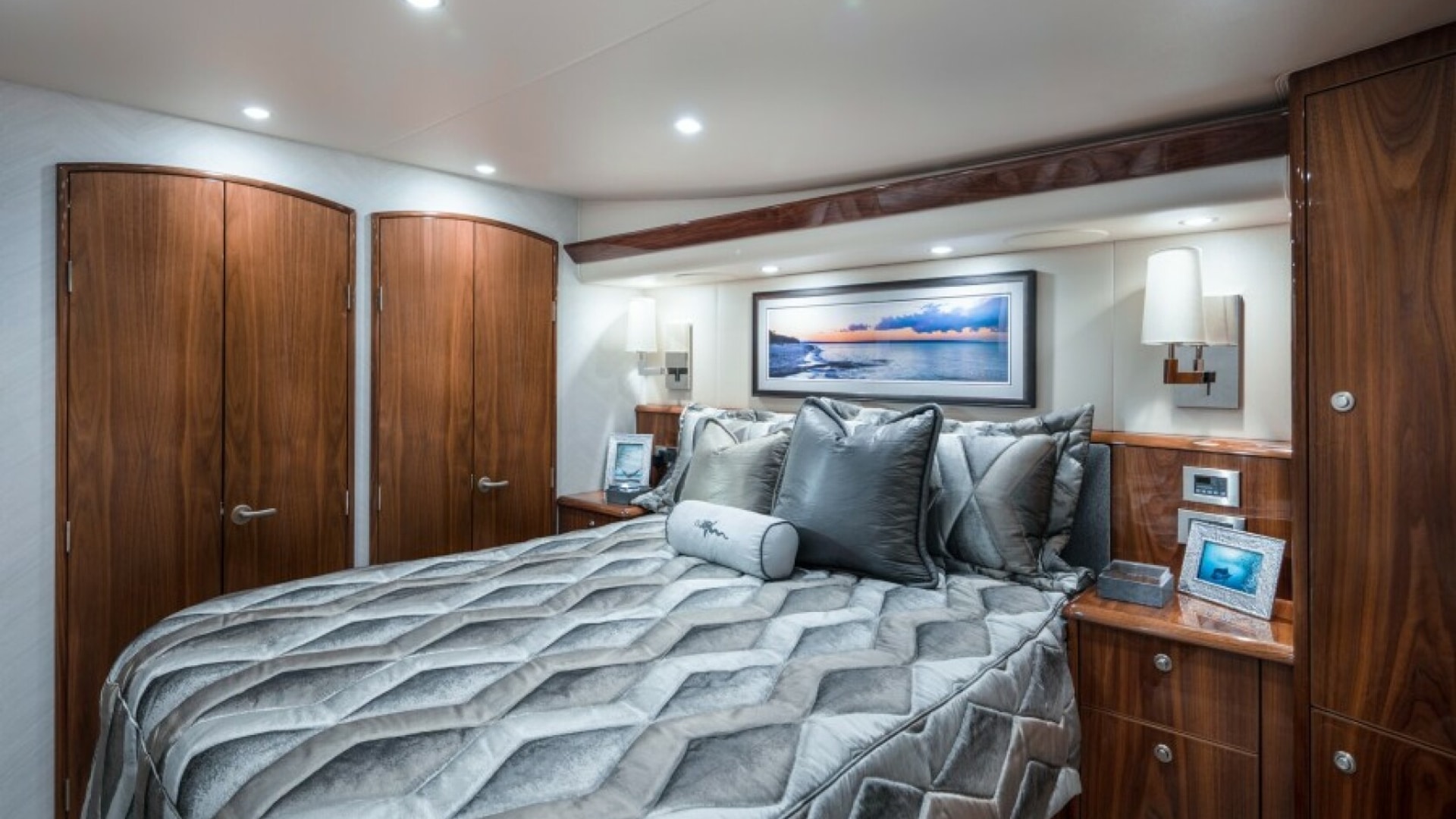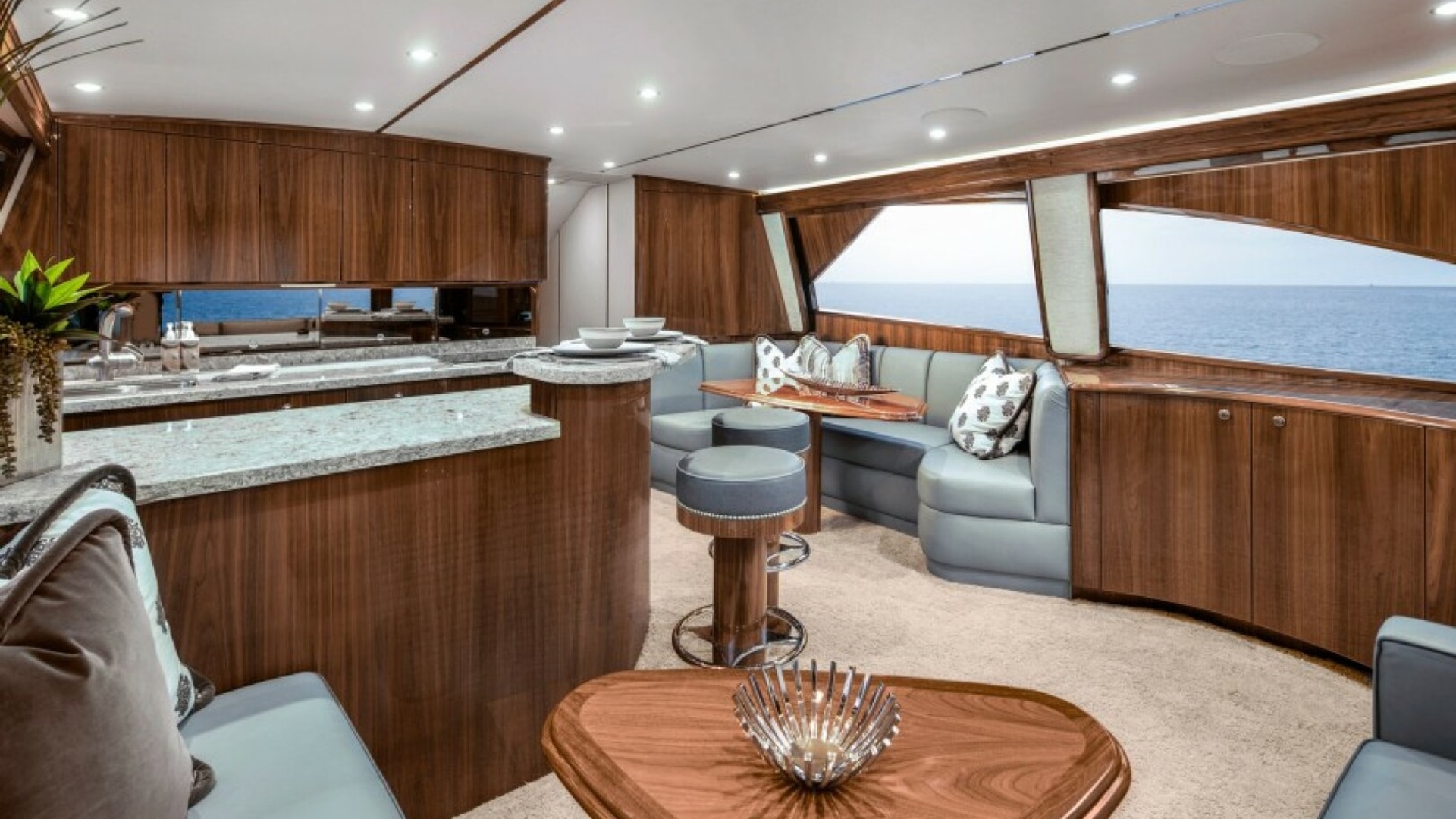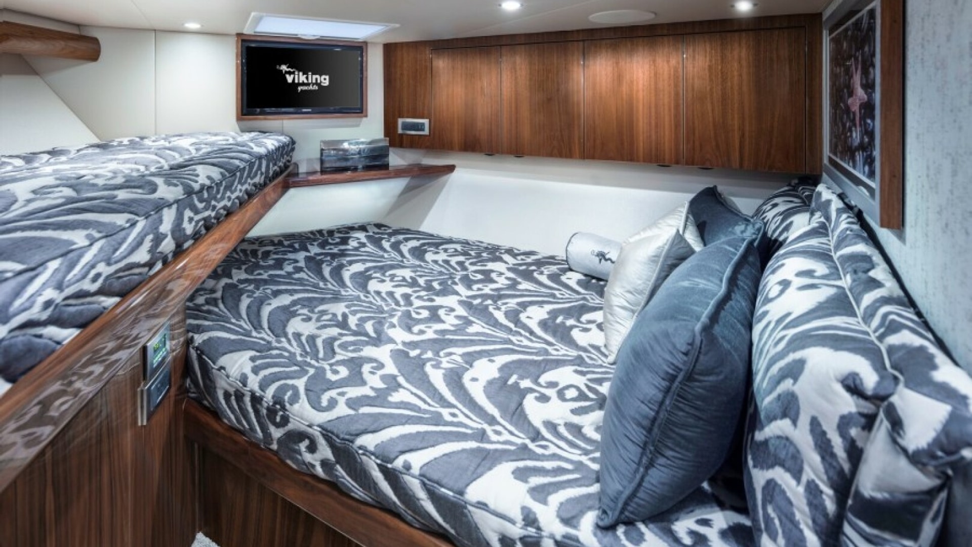 She is not only a beast, but she is a beauty too! The Viking 58C comes on strong with Viking’s signature walk-around center console flybridge helm and a 165-square-foot cockpit with a spacious observation mezzanine. The three-stateroom, two-head layout provides a comfortable arrangement while taking full advantage of the vessel’s large 17’ 9” beam. The master stateroom has an athwartship walk-around bunk with full-size his/her closets aft. The salon and galley arrangement provide the perfect mix of amenities for entertaining, relaxing or dining and boasts an open free-flowing layout with ample seating and storage.