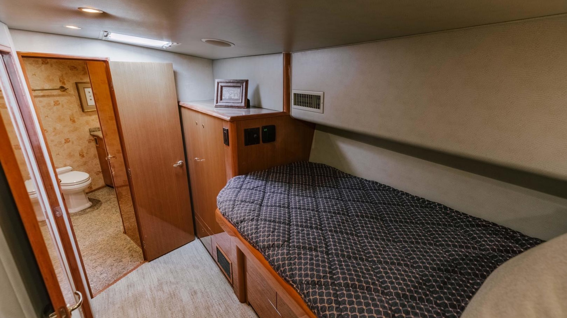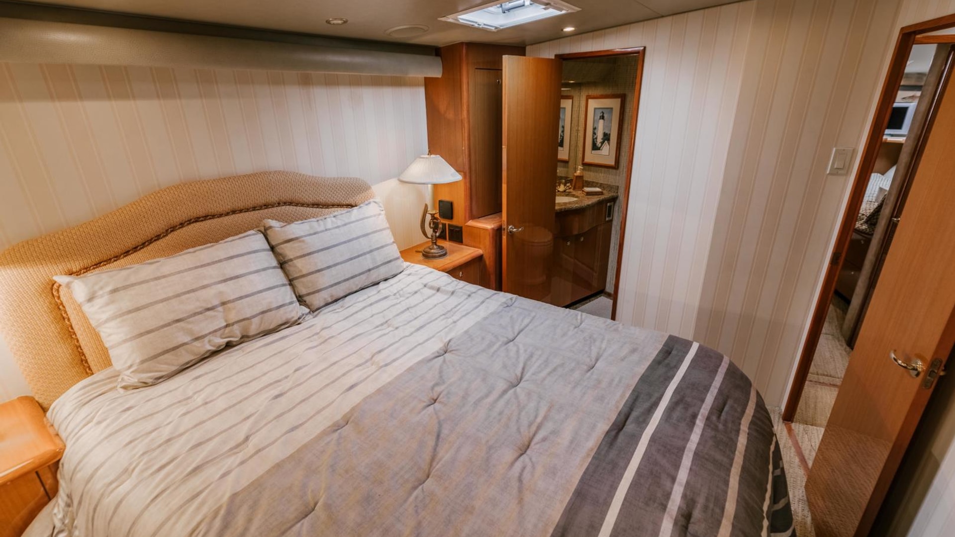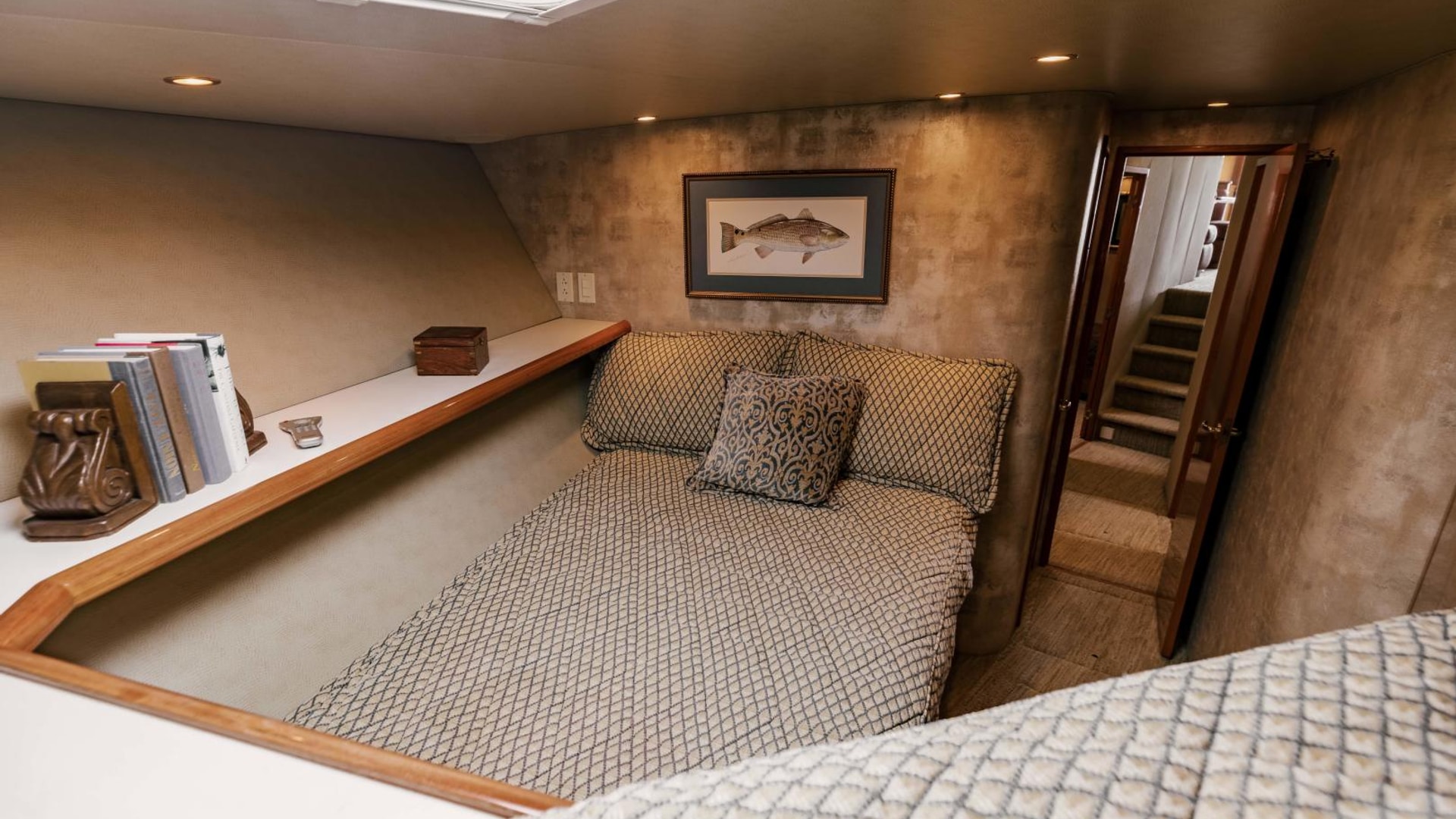 - Queen berth with custom mattress and generous storage below