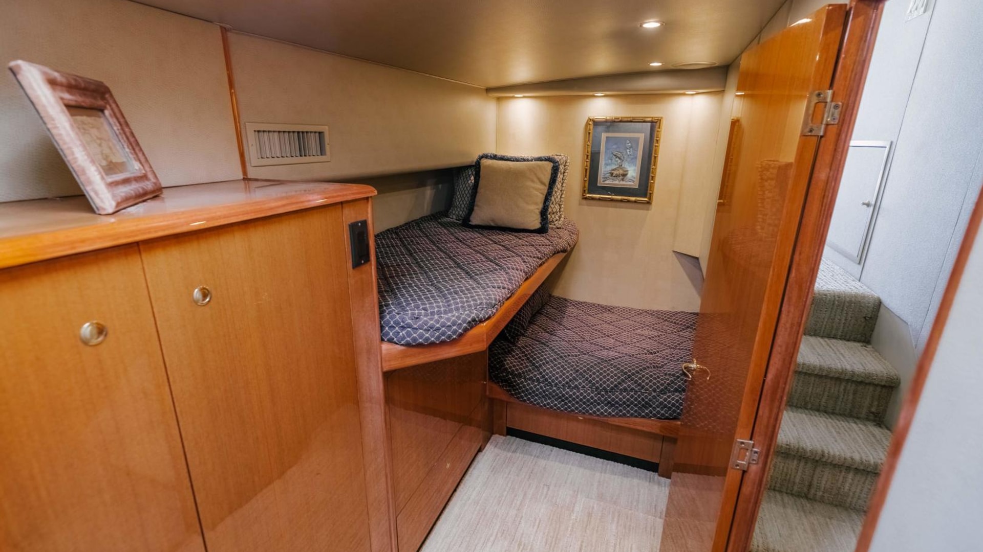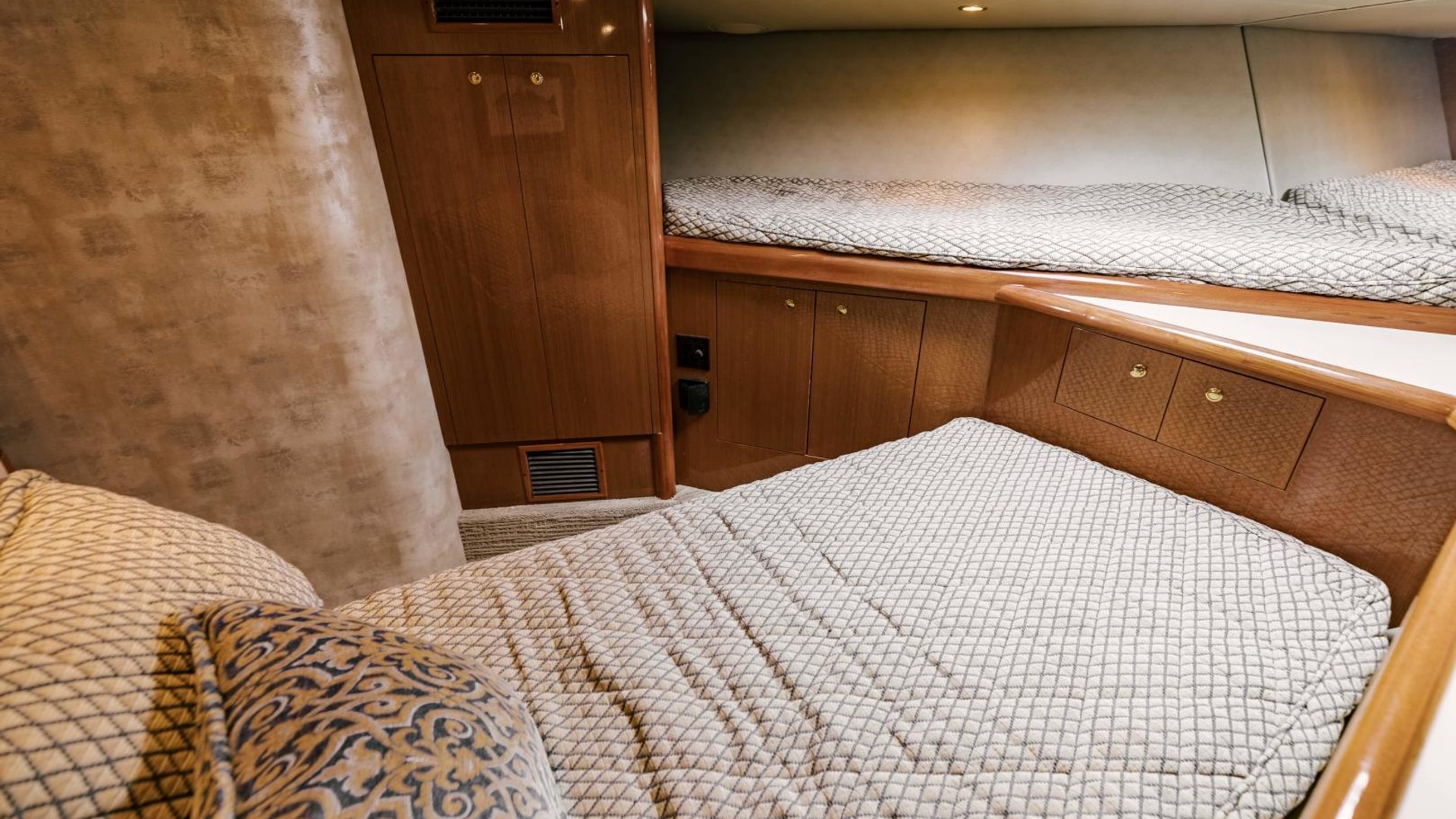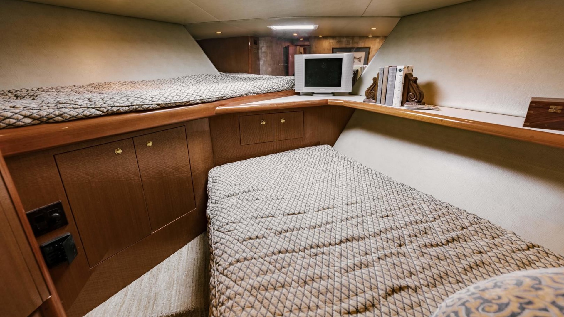 - Queen berth with custom mattress and generous storage below
