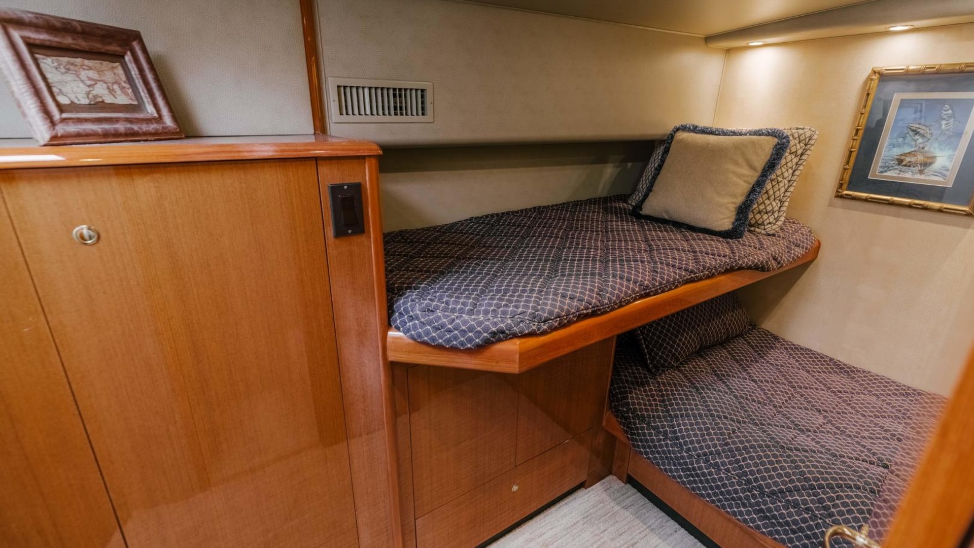 Entering the salon from the cockpit, it is finished with hand-crafted teak joinery with designer touches throughout. Forward of the salon is the galley with L-shaped dinette across. Down several steps you enter the companionway. The master stateroom with ensuite head is to port; the forward stateroom with private head has the VIP layout with a double berth and single berth. To starboard, a guest stateroom is found with over under/bunks. Access to the washer/dryer and guest head is featured in the starboard stateroom. Interior like new with two sets of bedspreads & shams.