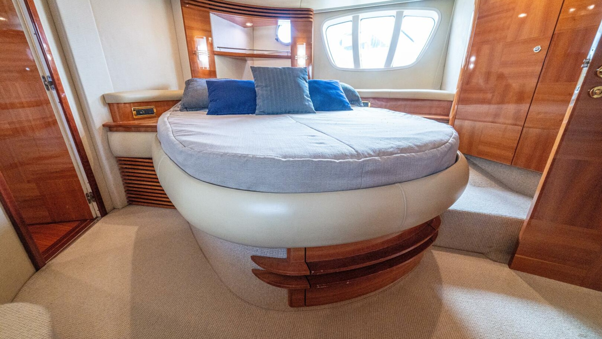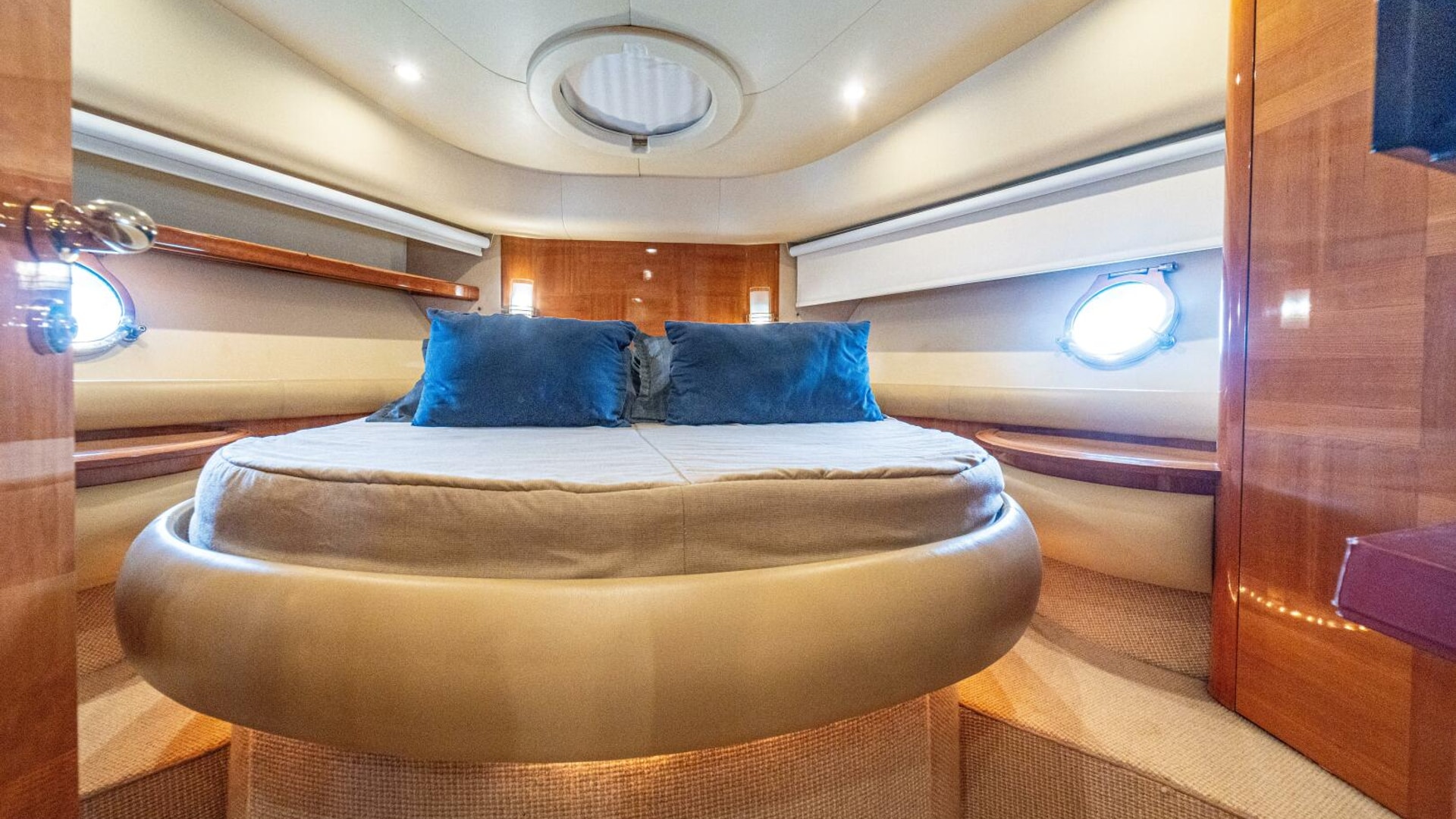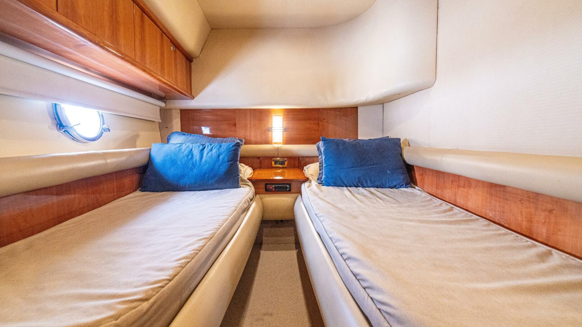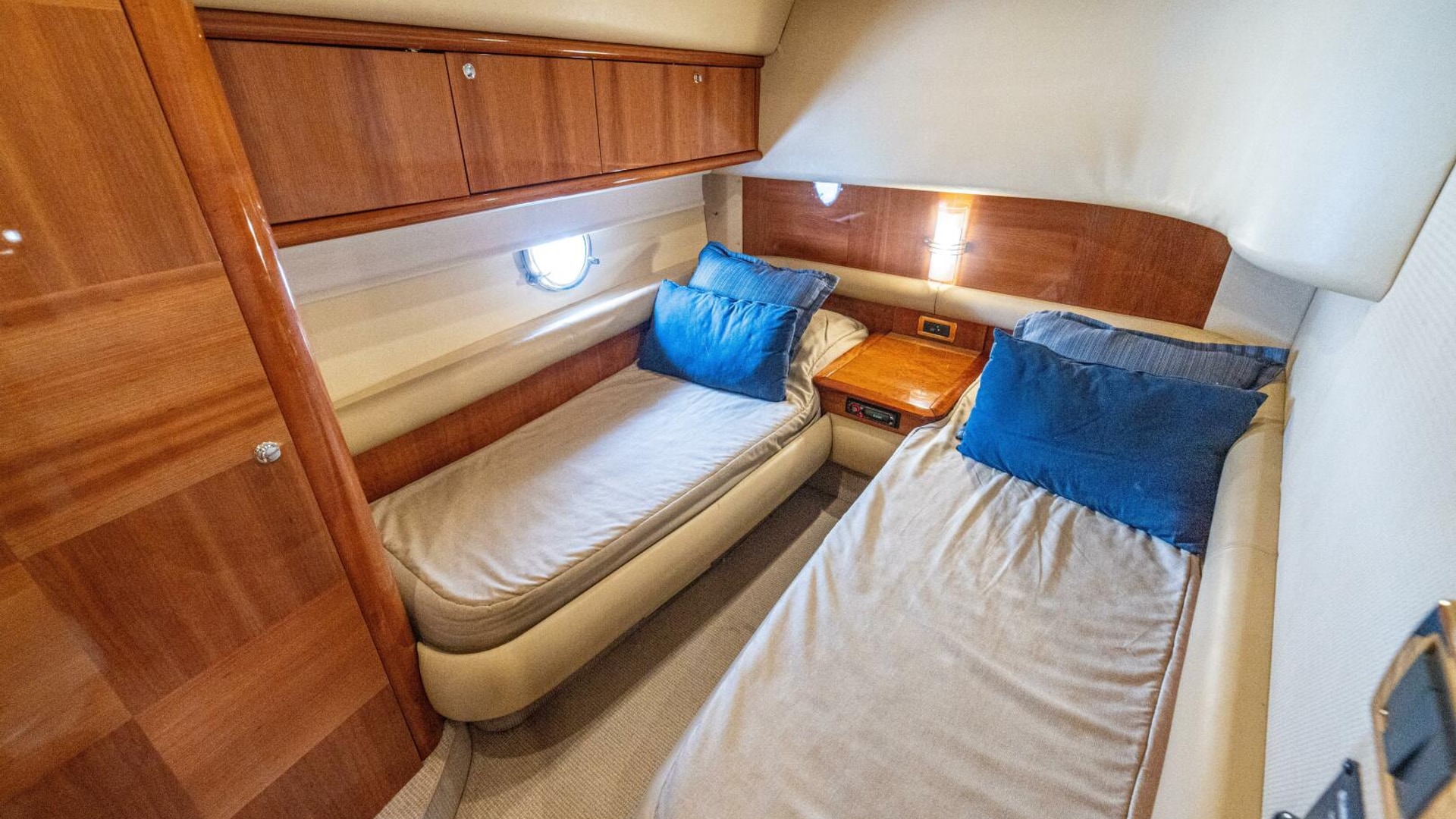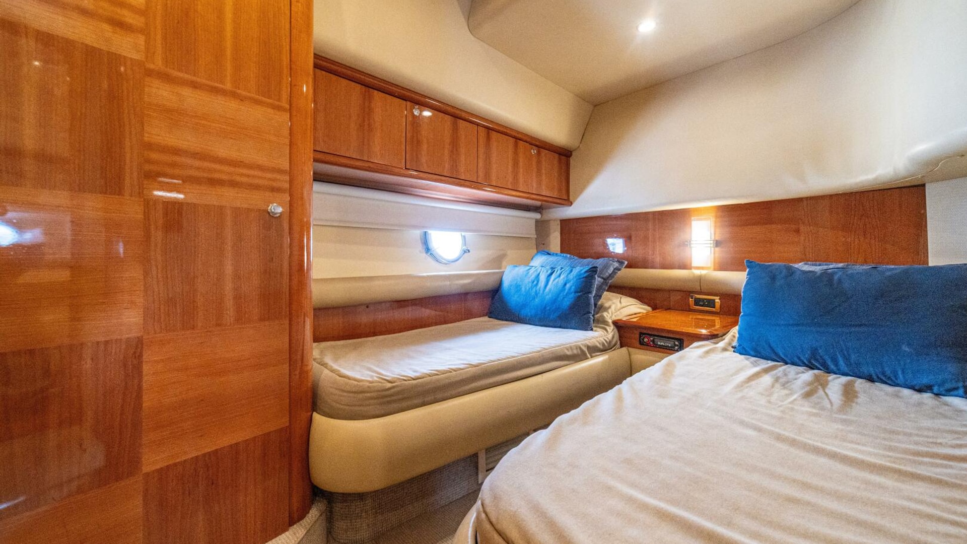 Three cabins with a full beam master, double VIP and third cabin with twin berths. Cherry wood finishing with cream color carpets throughout.