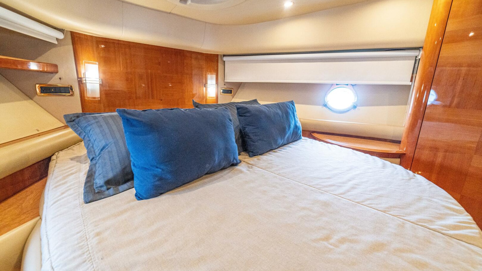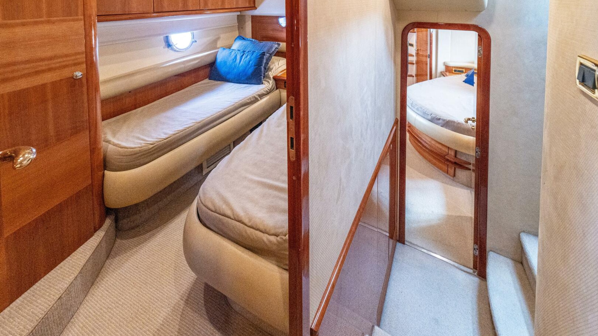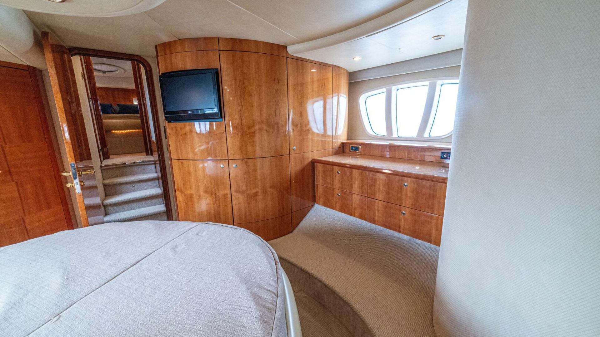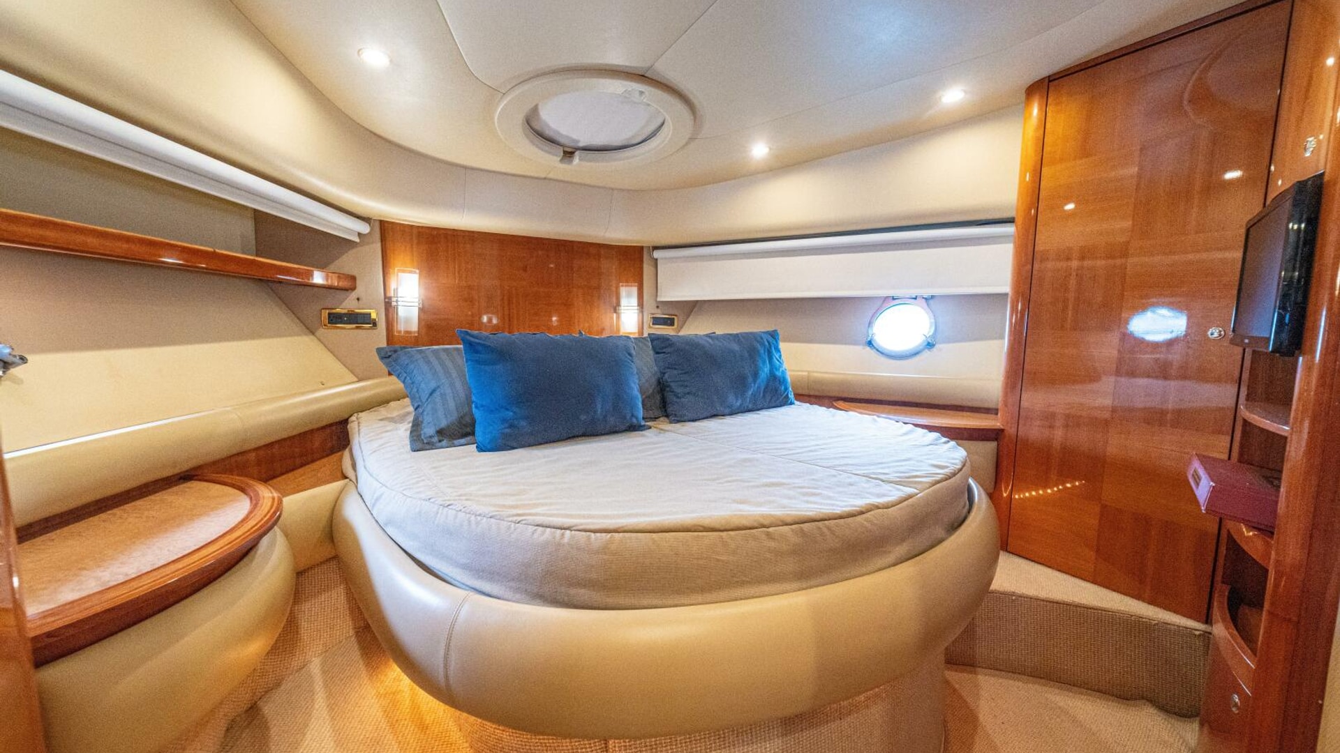 Three cabins with a full beam master, double VIP and third cabin with twin berths. Cherry wood finishing with cream color carpets throughout.