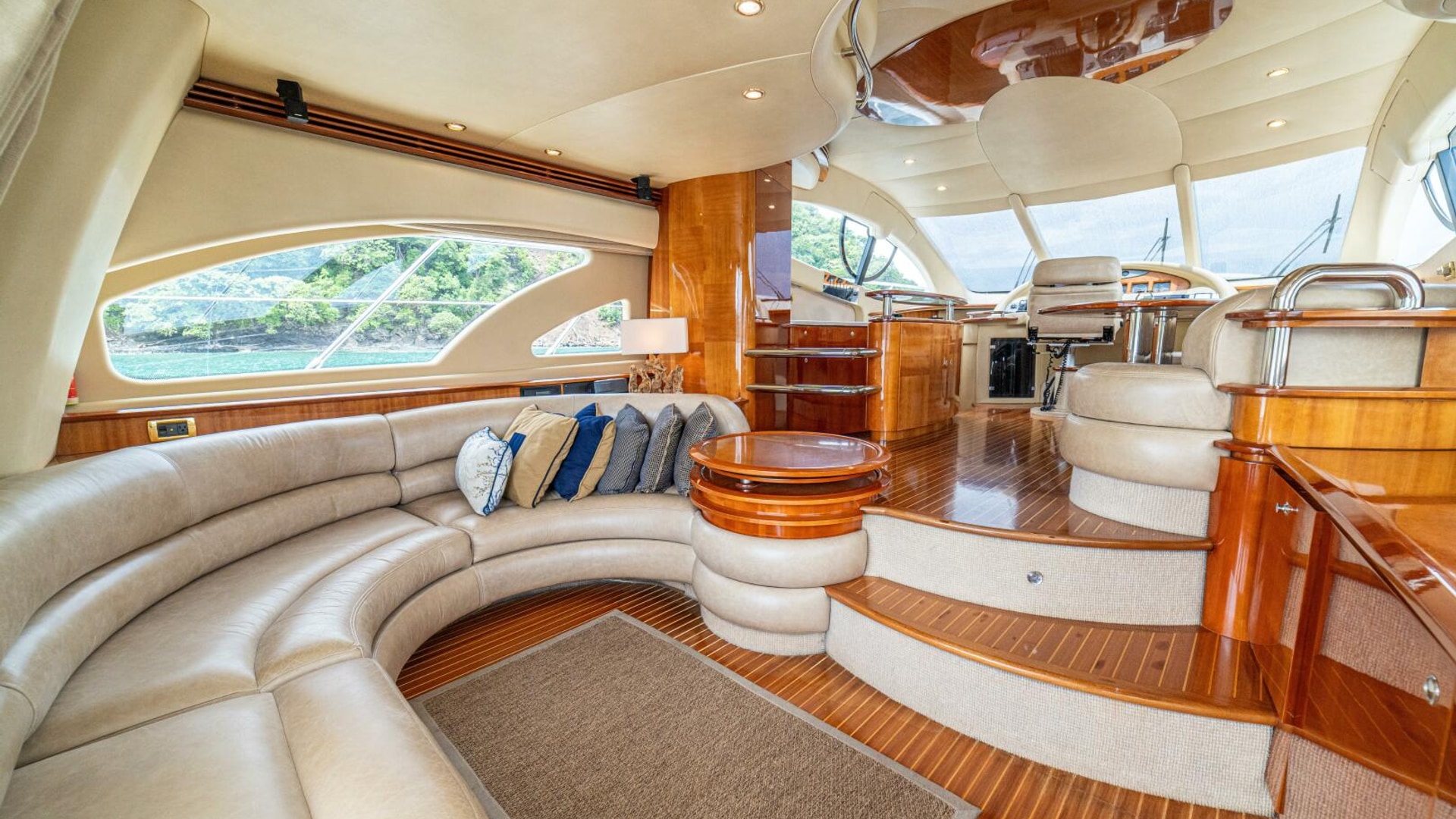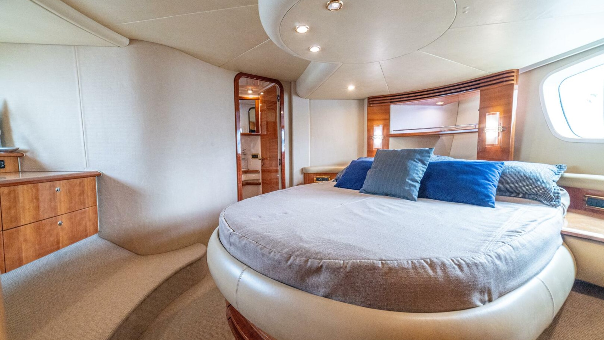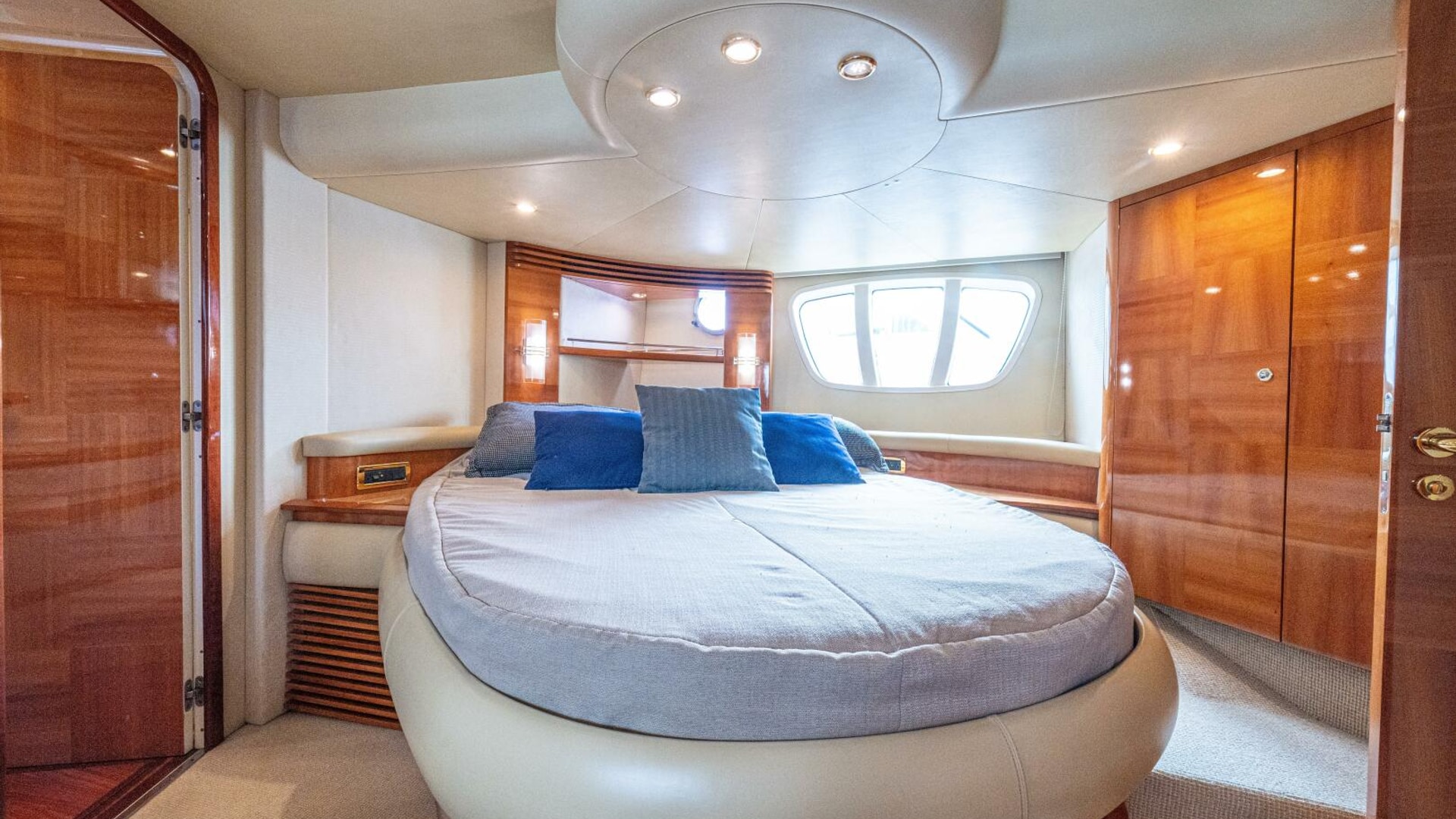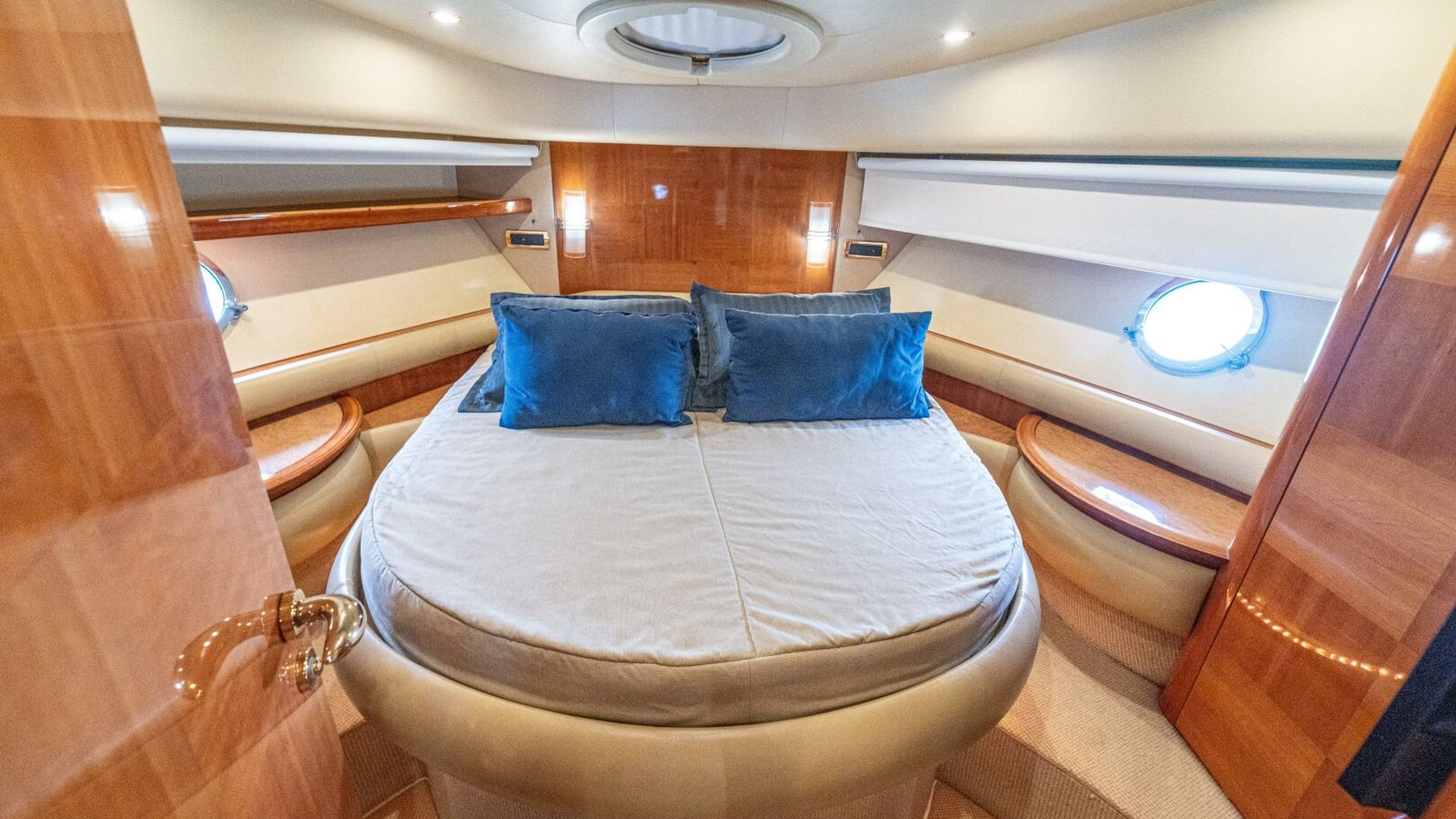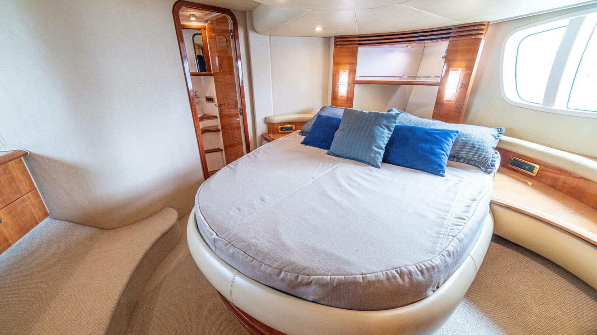 Three cabins with a full beam master, double VIP and third cabin with twin berths. Cherry wood finishing with cream color carpets throughout.