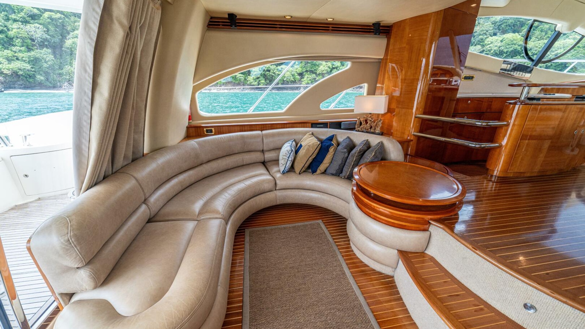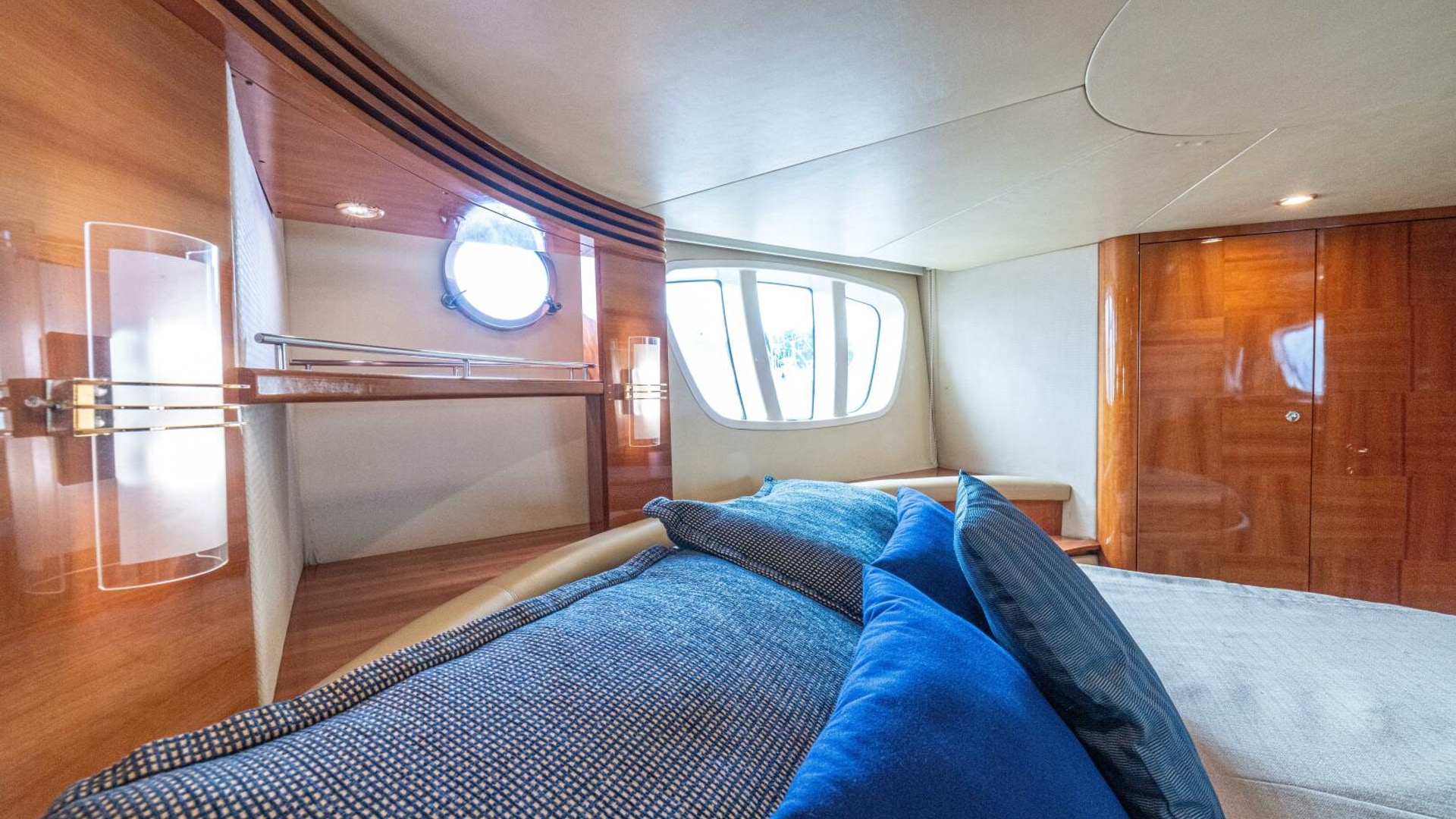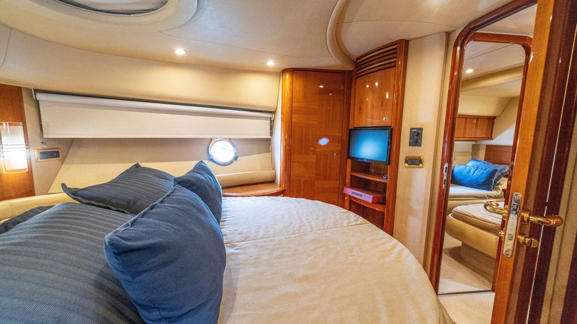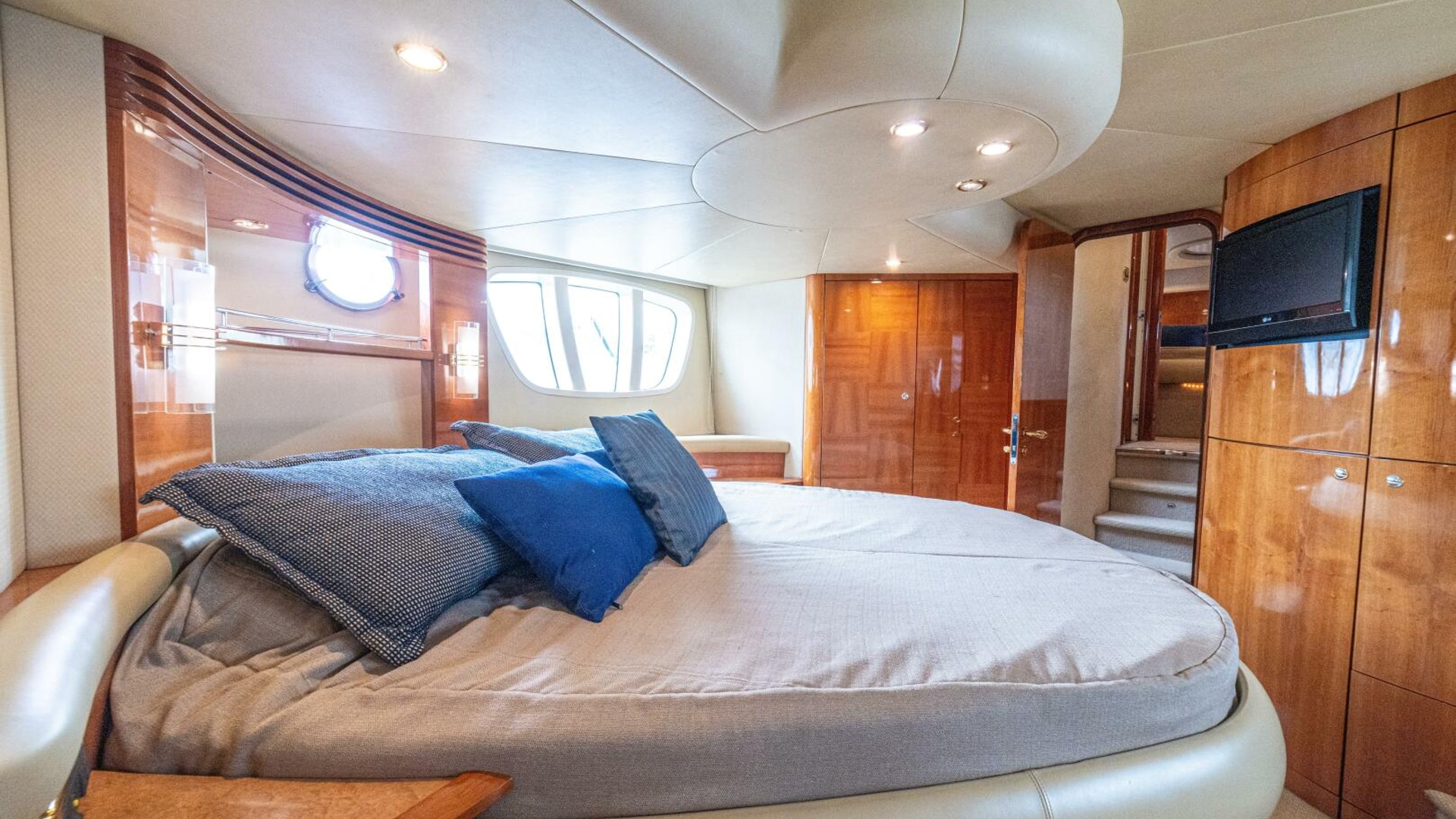 Three cabins with a full beam master, double VIP and third cabin with twin berths. Cherry wood finishing with cream color carpets throughout.