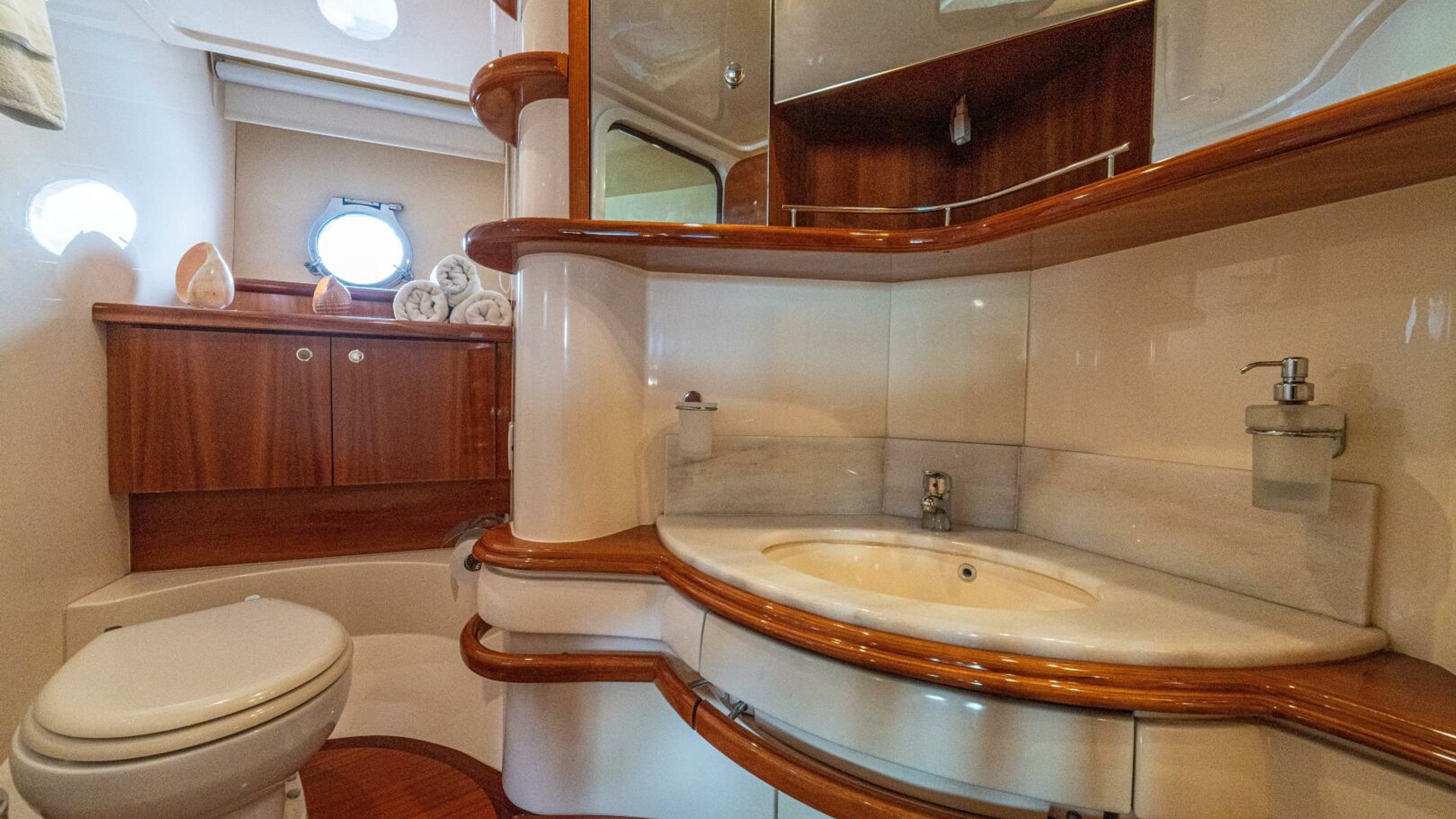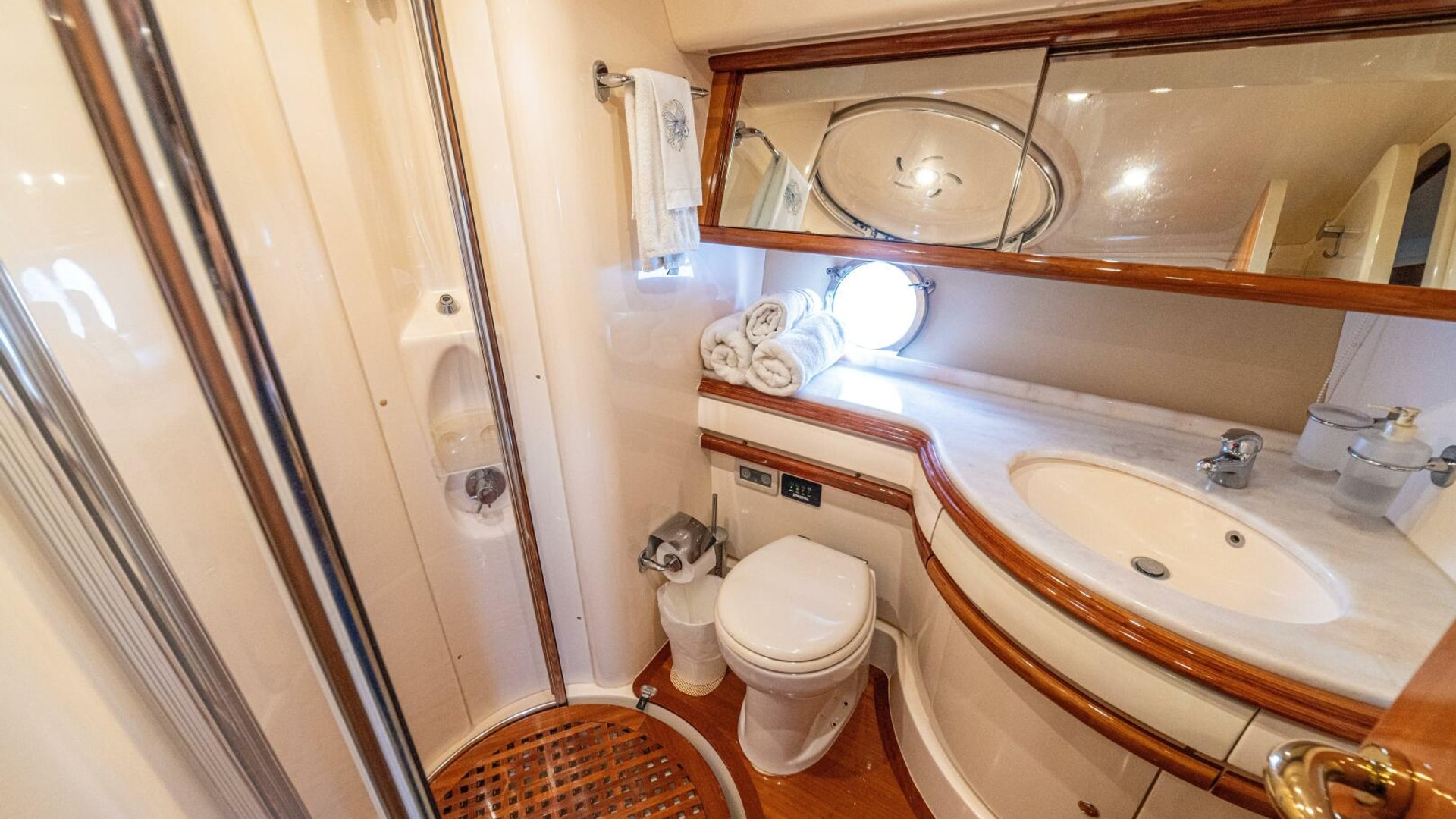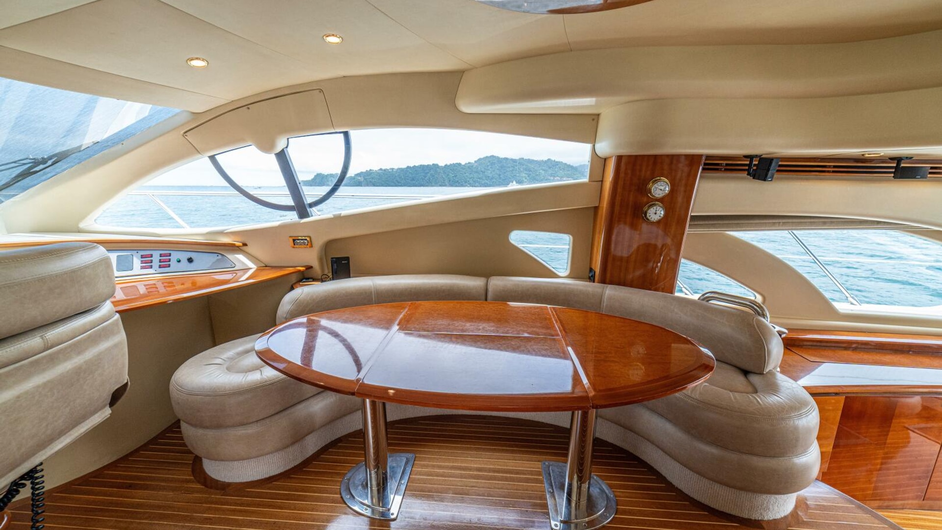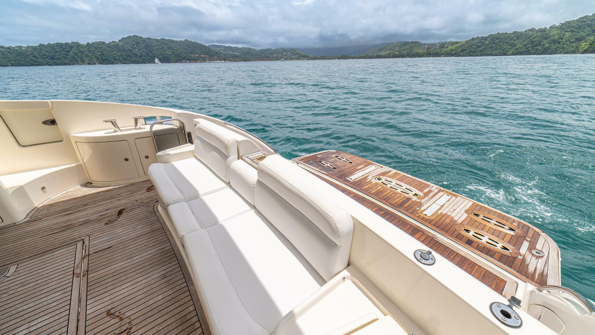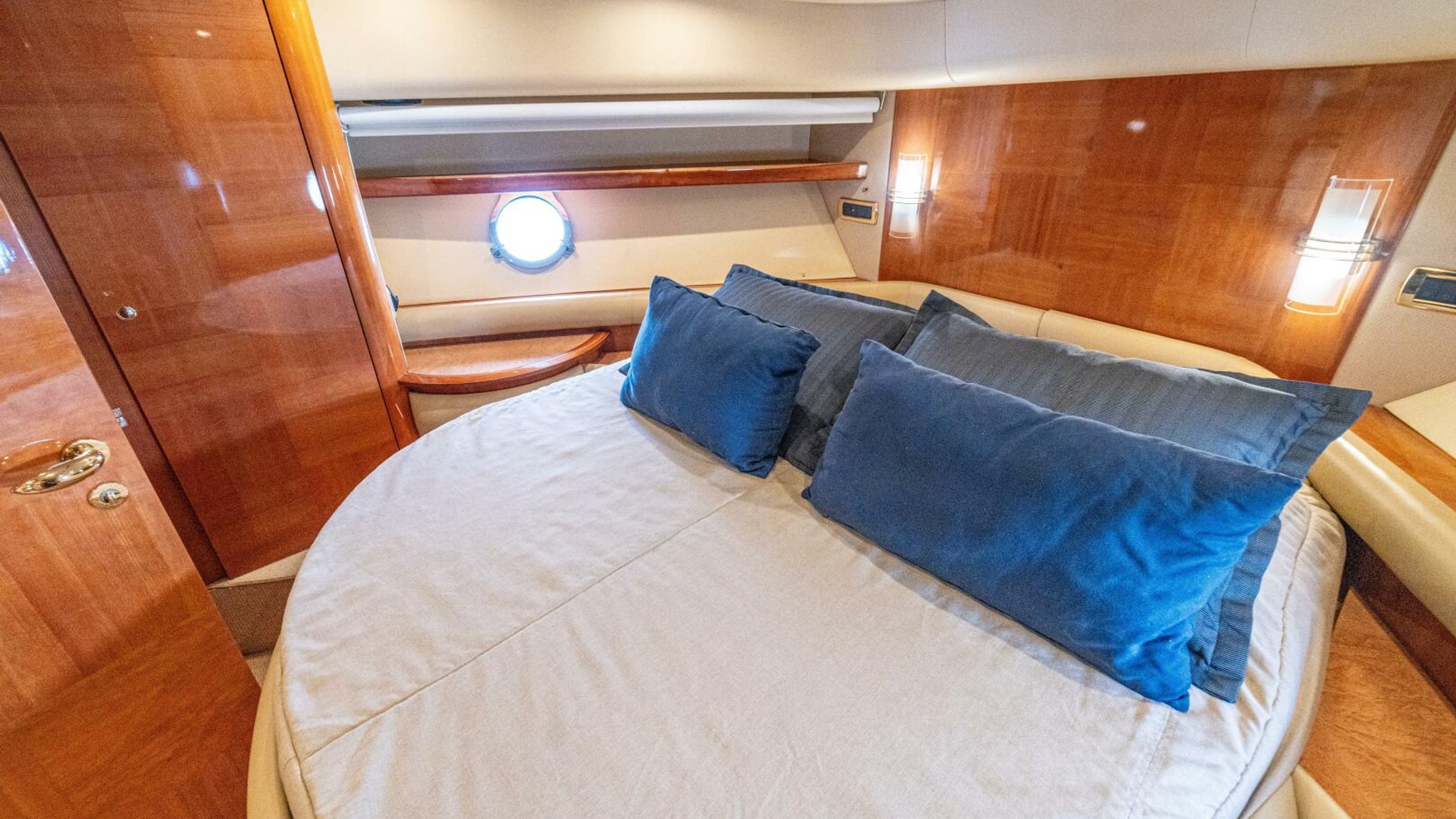 Three cabins with a full beam master, double VIP and third cabin with twin berths. Cherry wood finishing with cream color carpets throughout.