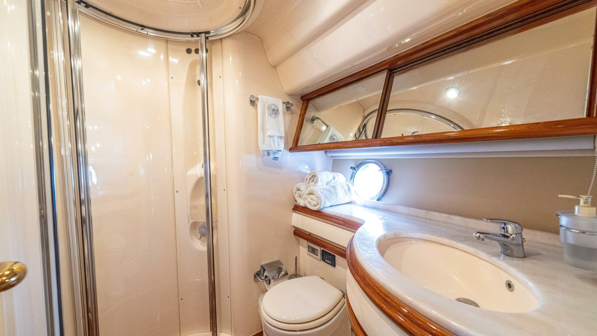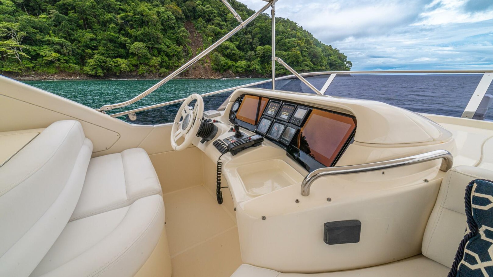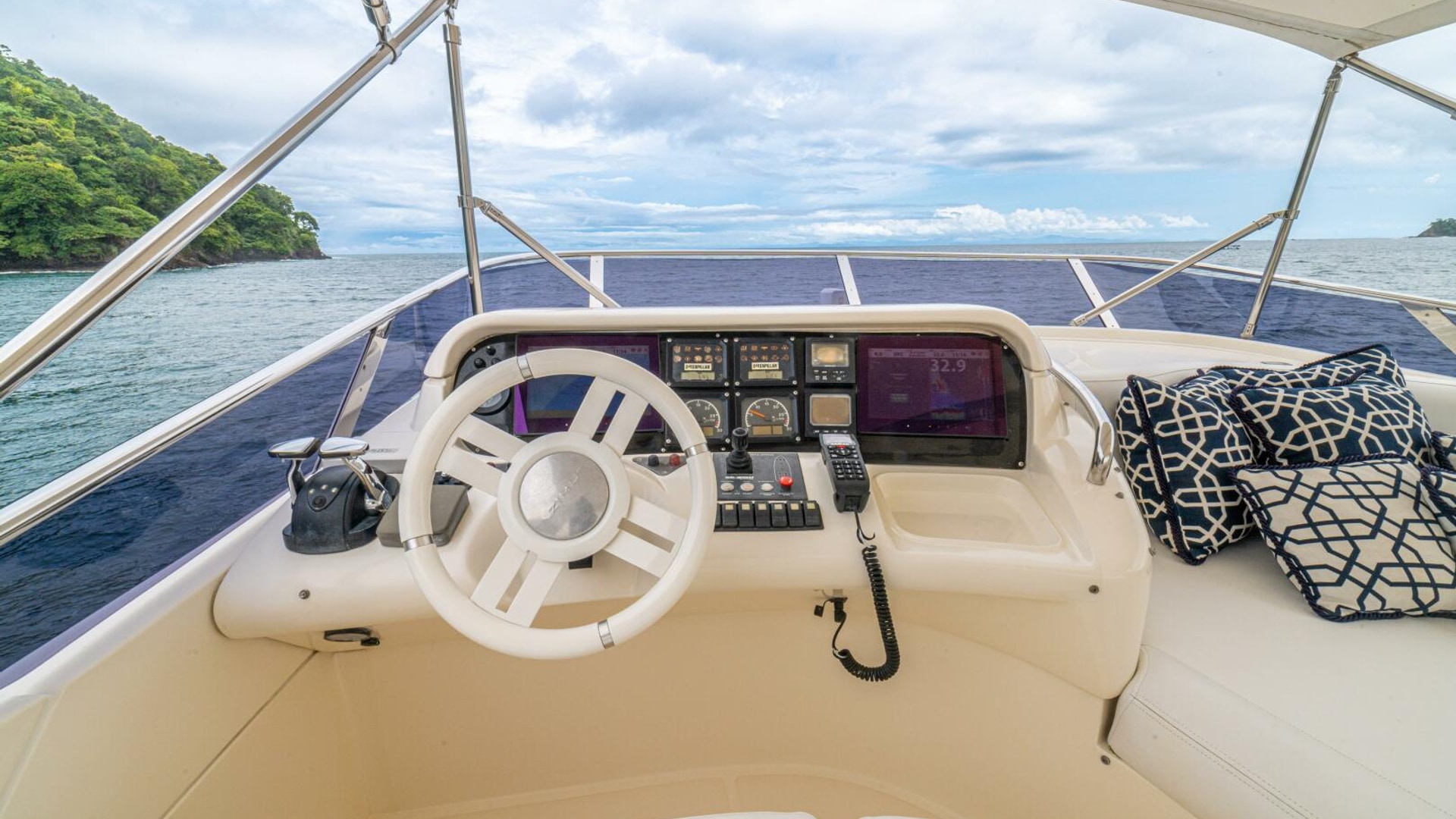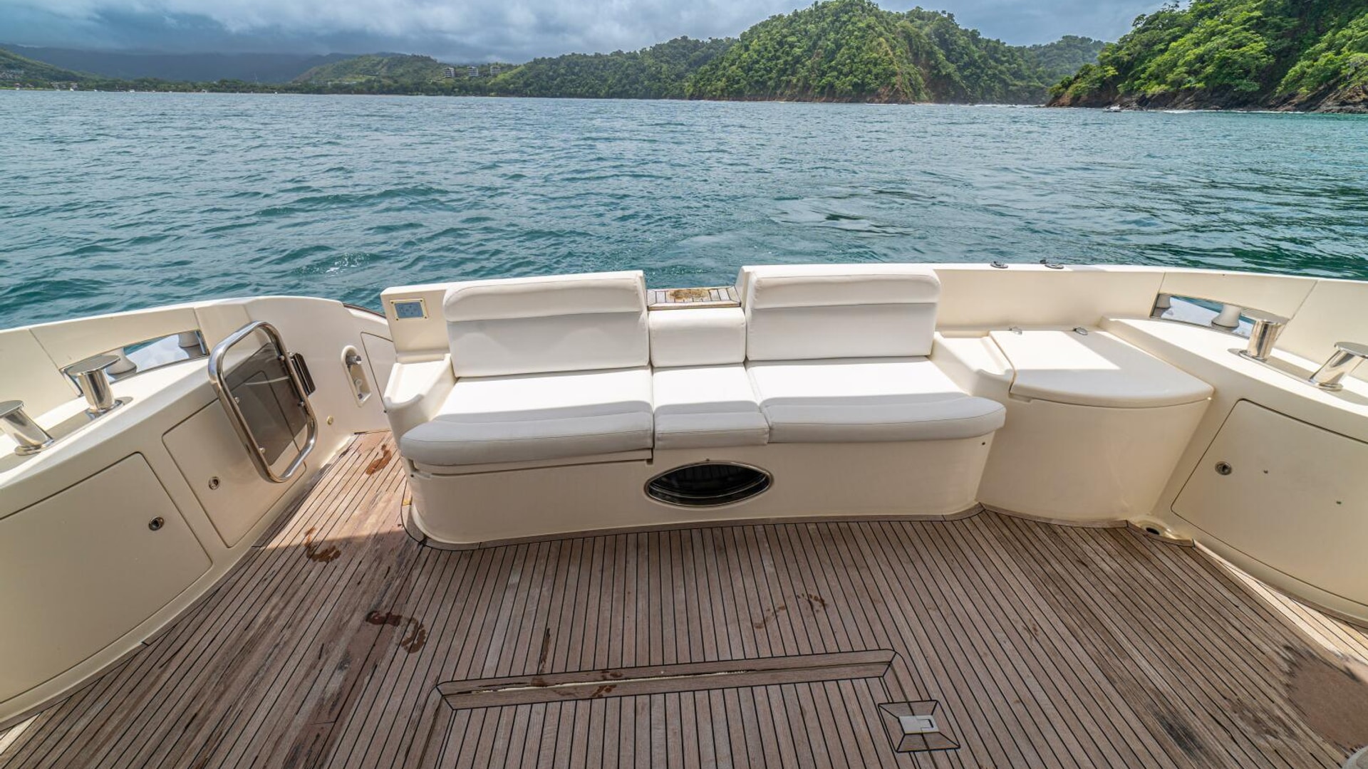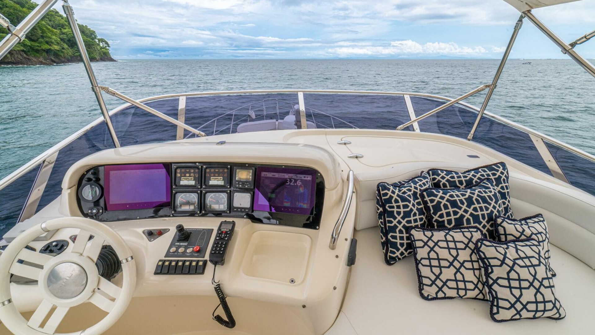 Three cabins with a full beam master, double VIP and third cabin with twin berths. Cherry wood finishing with cream color carpets throughout.
