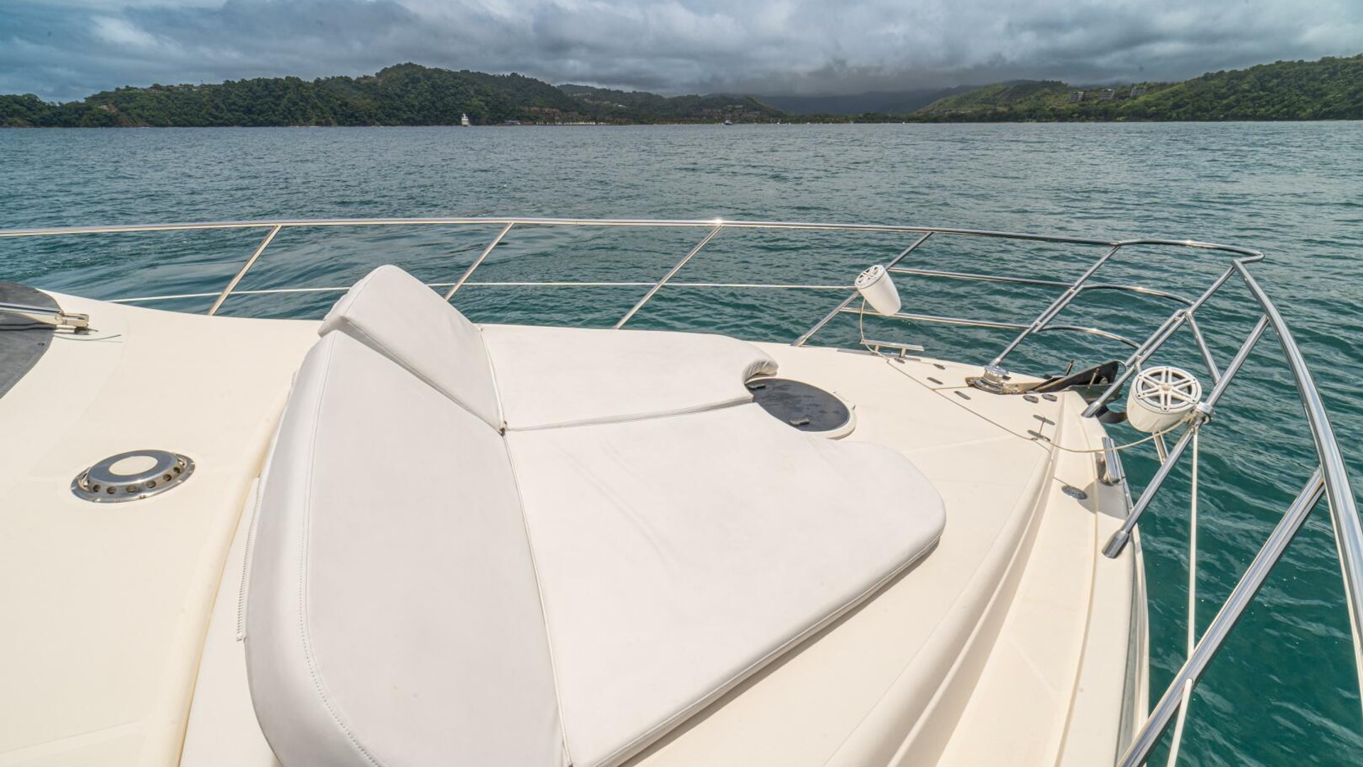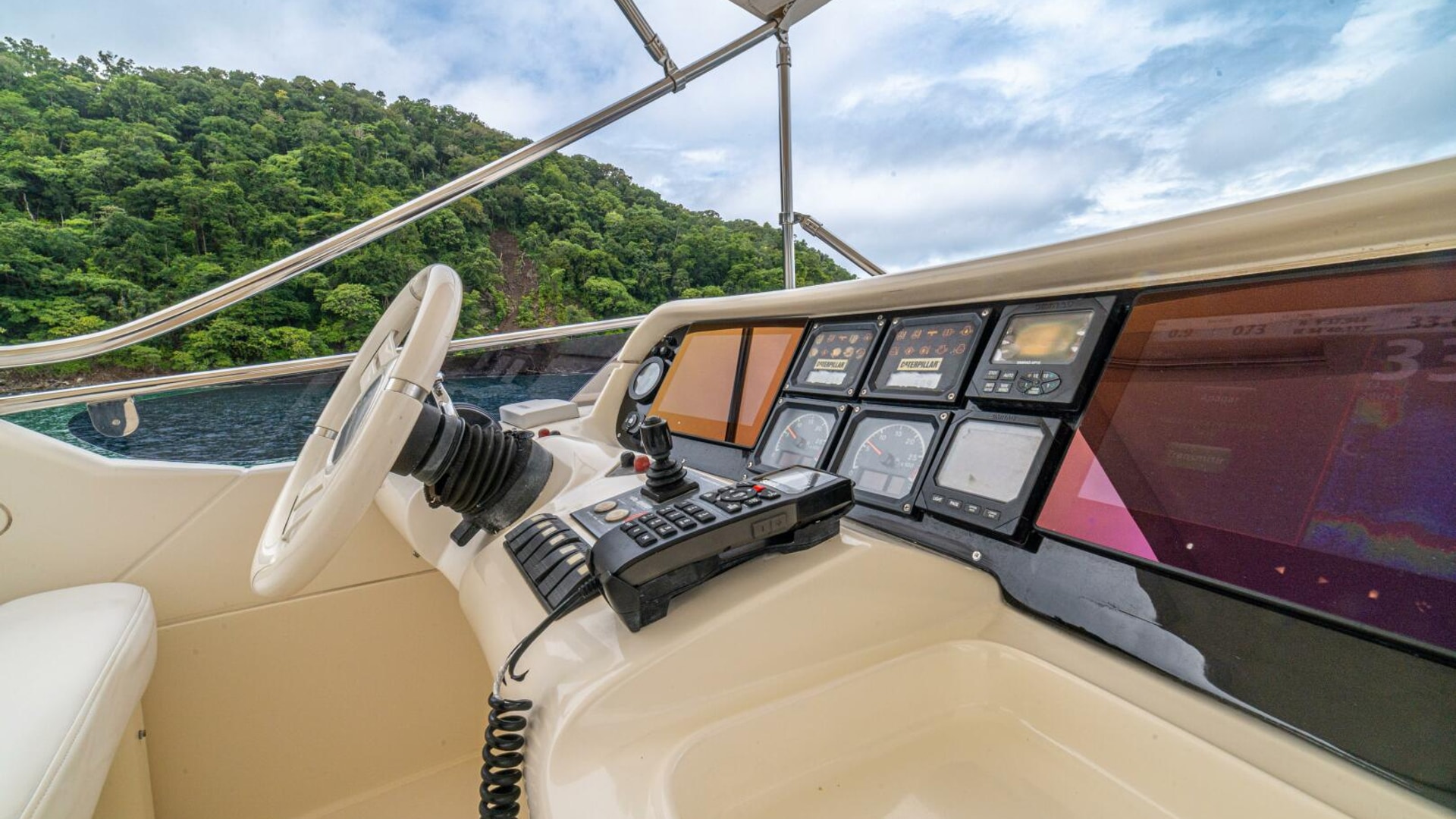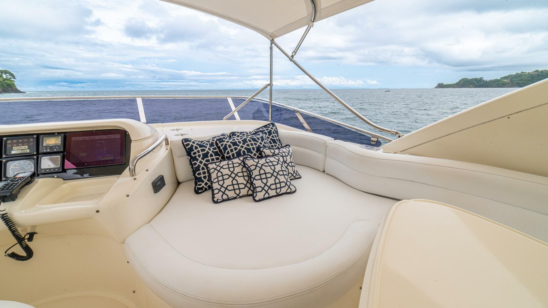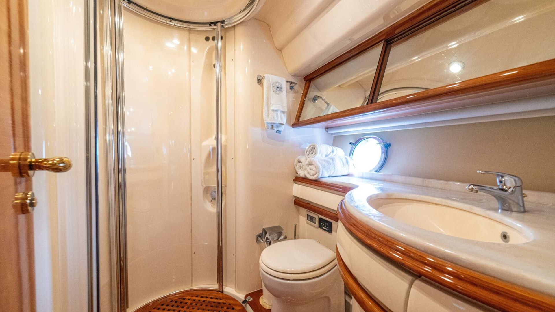 Three cabins with a full beam master, double VIP and third cabin with twin berths. Cherry wood finishing with cream color carpets throughout.