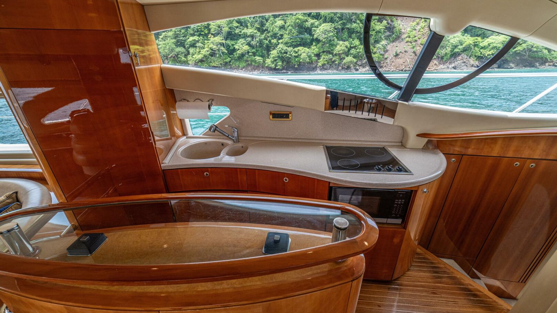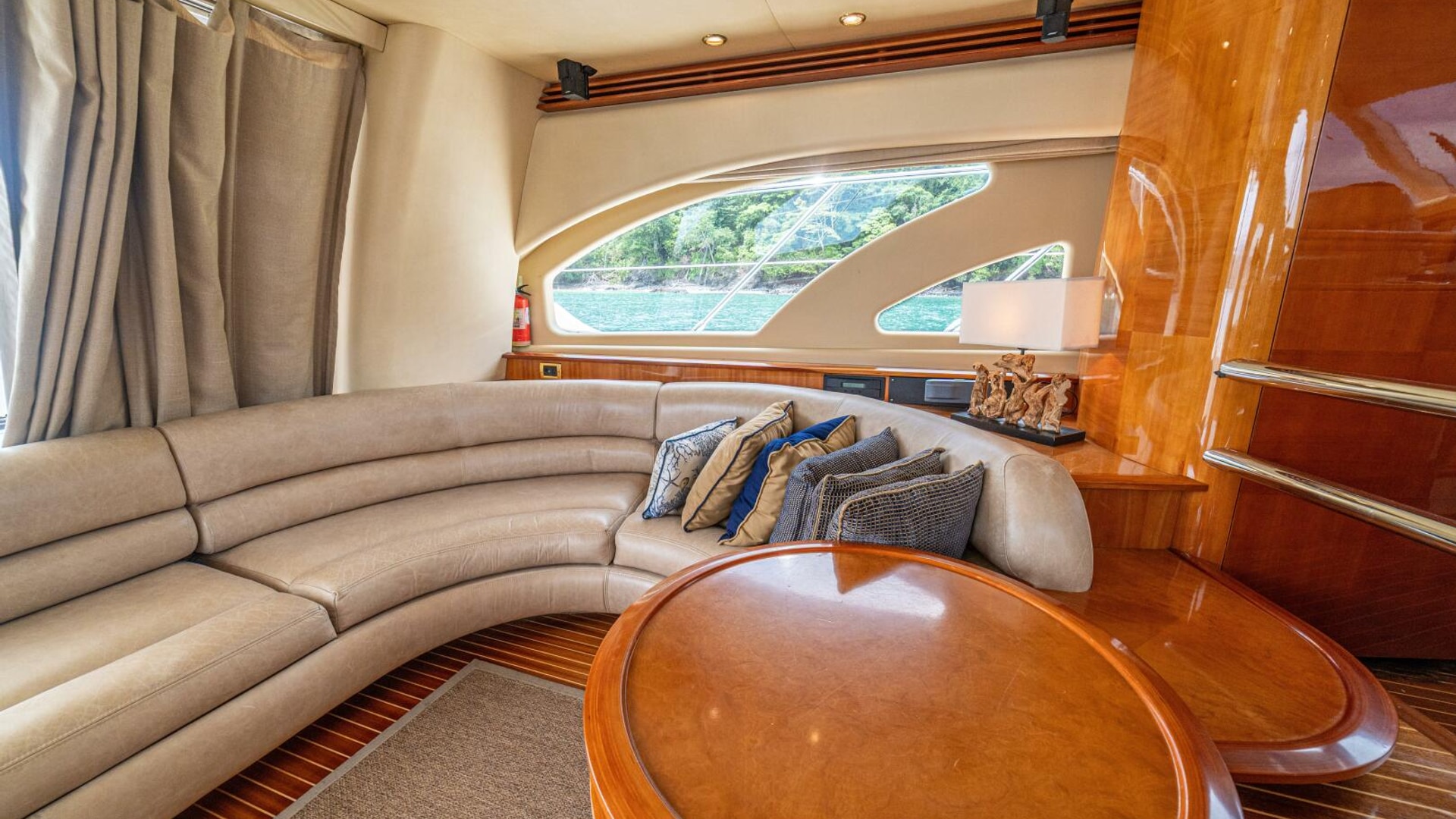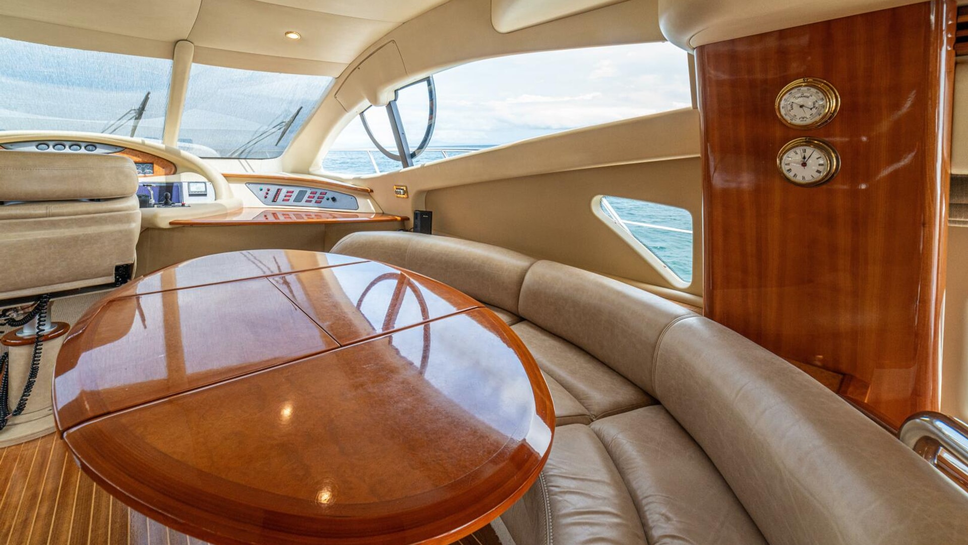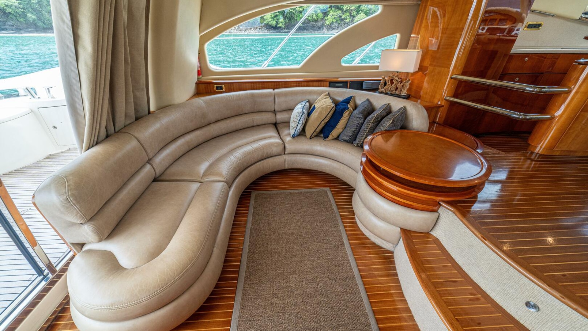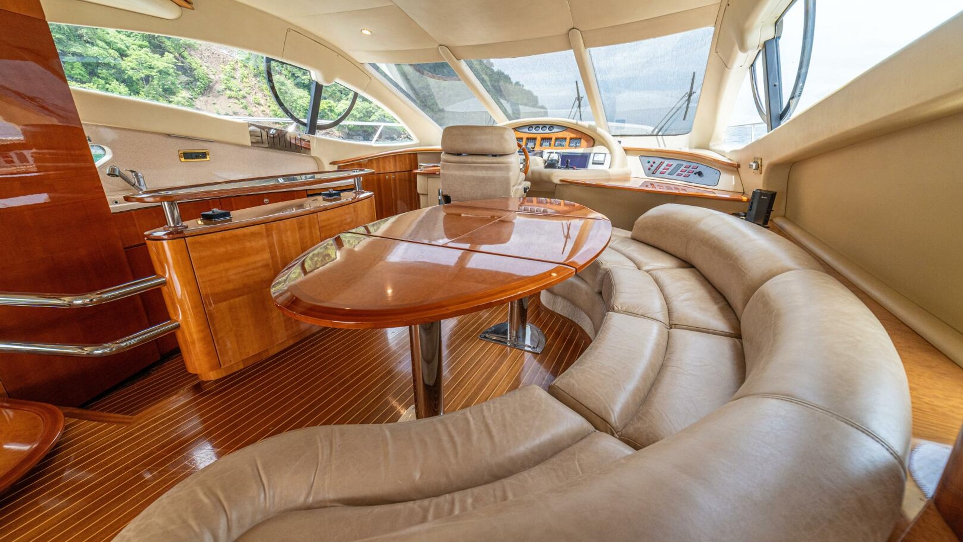 Spacious saloon with a large leather 'U' shaped sofa to port. To starboard is storage for drinks and other items plus an ice maker. The TV is on a high low mechanism, so it's out of sight when not in use.