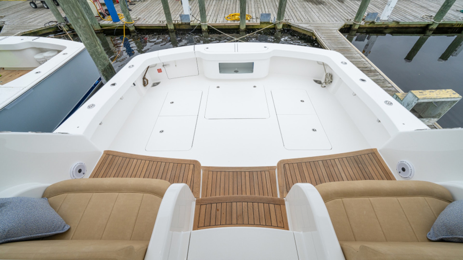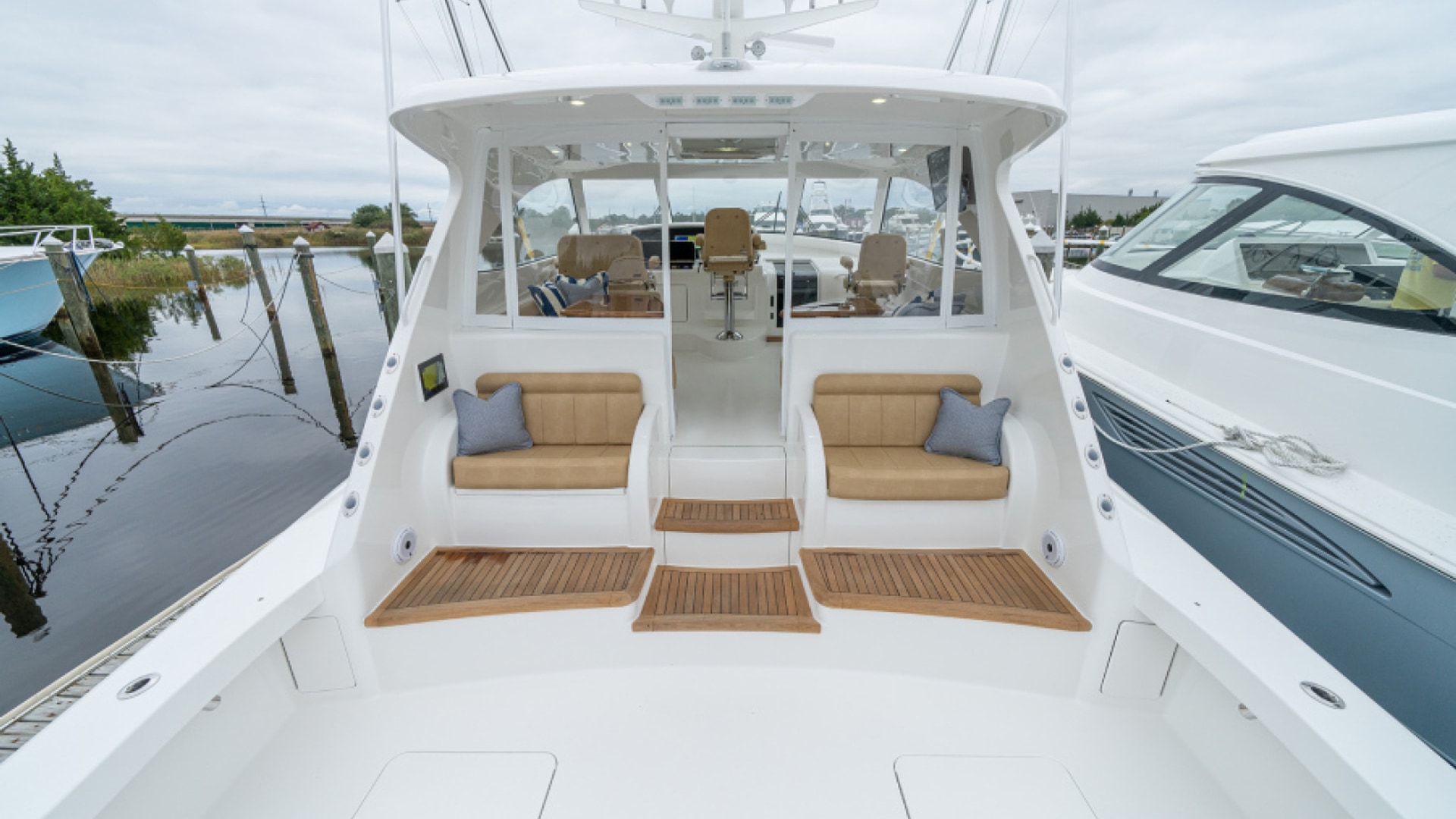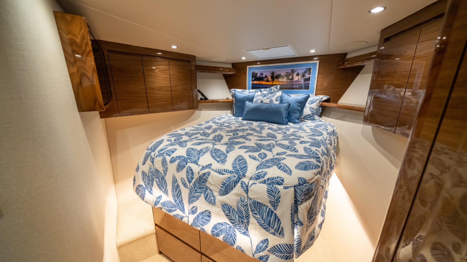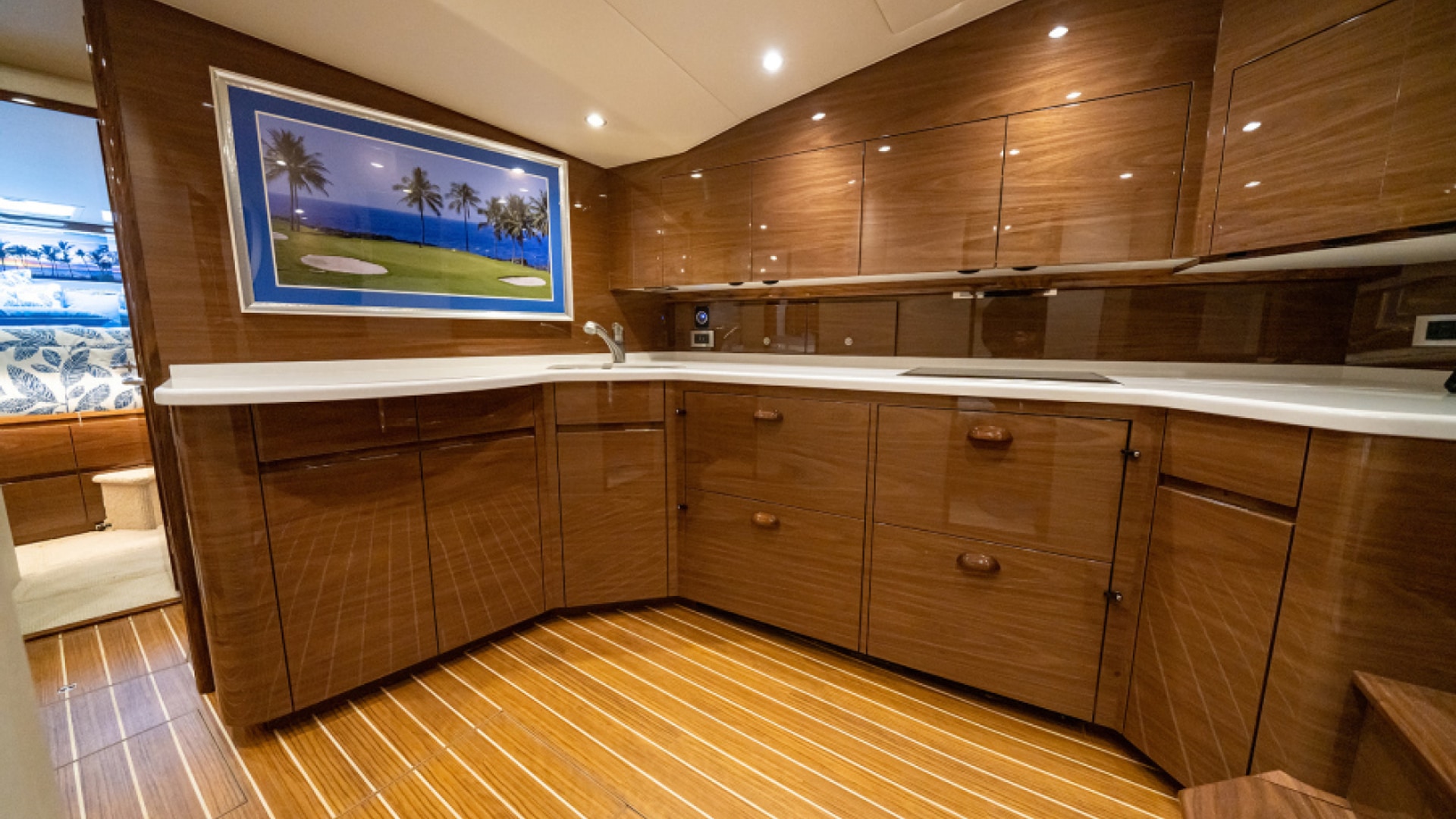 Aft of the helm, there is a convergence of practical and convenience features, including refrigeration and tackle and gear storage compartments. Plump cushions topping the port-side U-shape lounge, which surrounds a walnut table, will cradle your guests in comfort while providing ample height to take in the surroundings. To port, you’ll also find an L-shaped lounge with storage underneath.