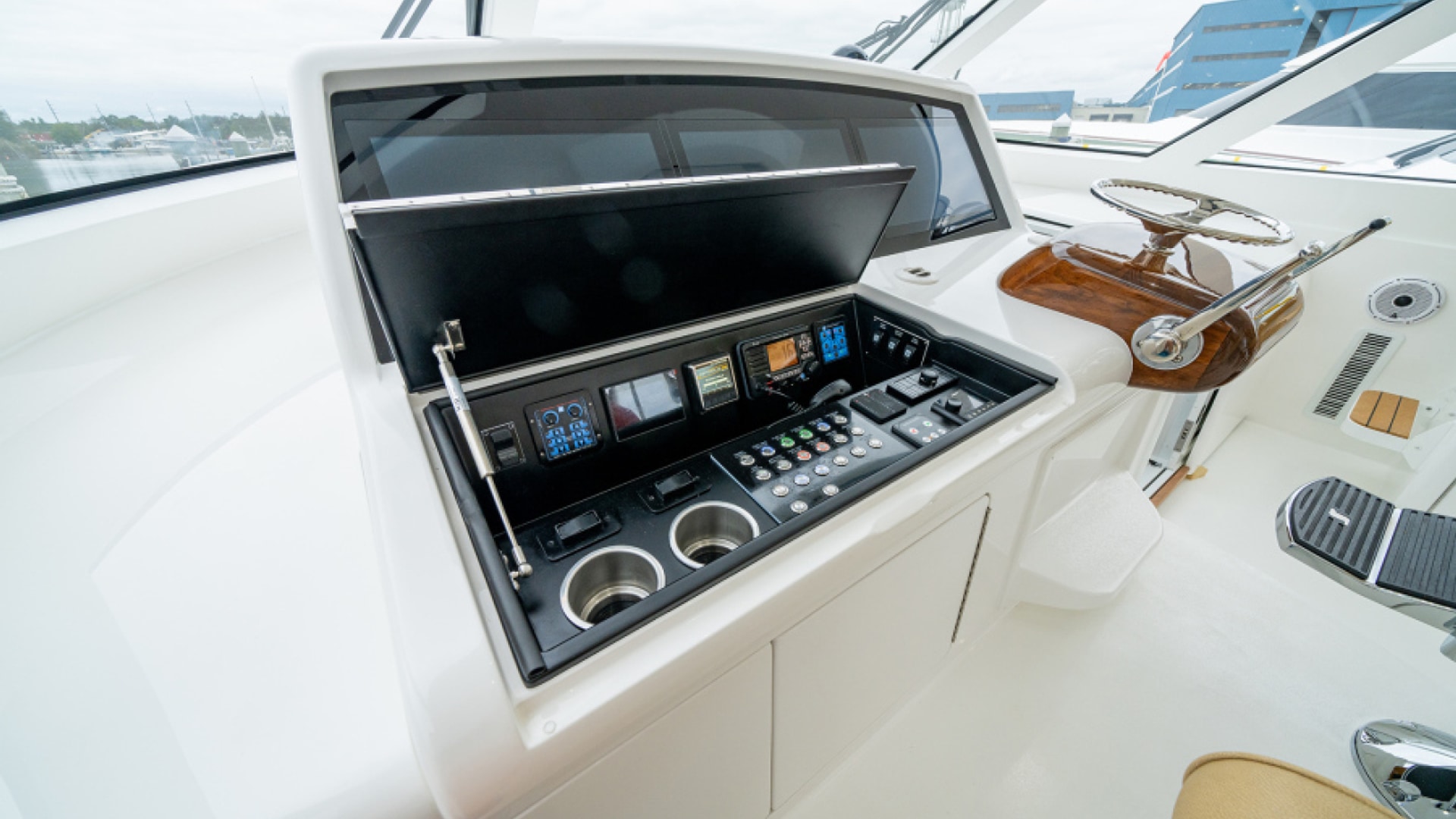 With its open aft bulkhead, the command deck gives you instant access to the cockpit. The centerline helm, with its pedestal seat on a raised platform, provides excellent visibility and is complemented by port (double) and starboard (single) companion seating. Three multi-function displays (up to 22-inches each) are flush-mounted in a recessed black acrylic panel, contributing to the clean streamlined helm design. Bocatech switches and other operational controls and instruments are located in a large radio box to the port of the raised helm pod. The MAN engine displays, autopilot, and VHF radios are nested in a recessed area molded into the hardtop underside.