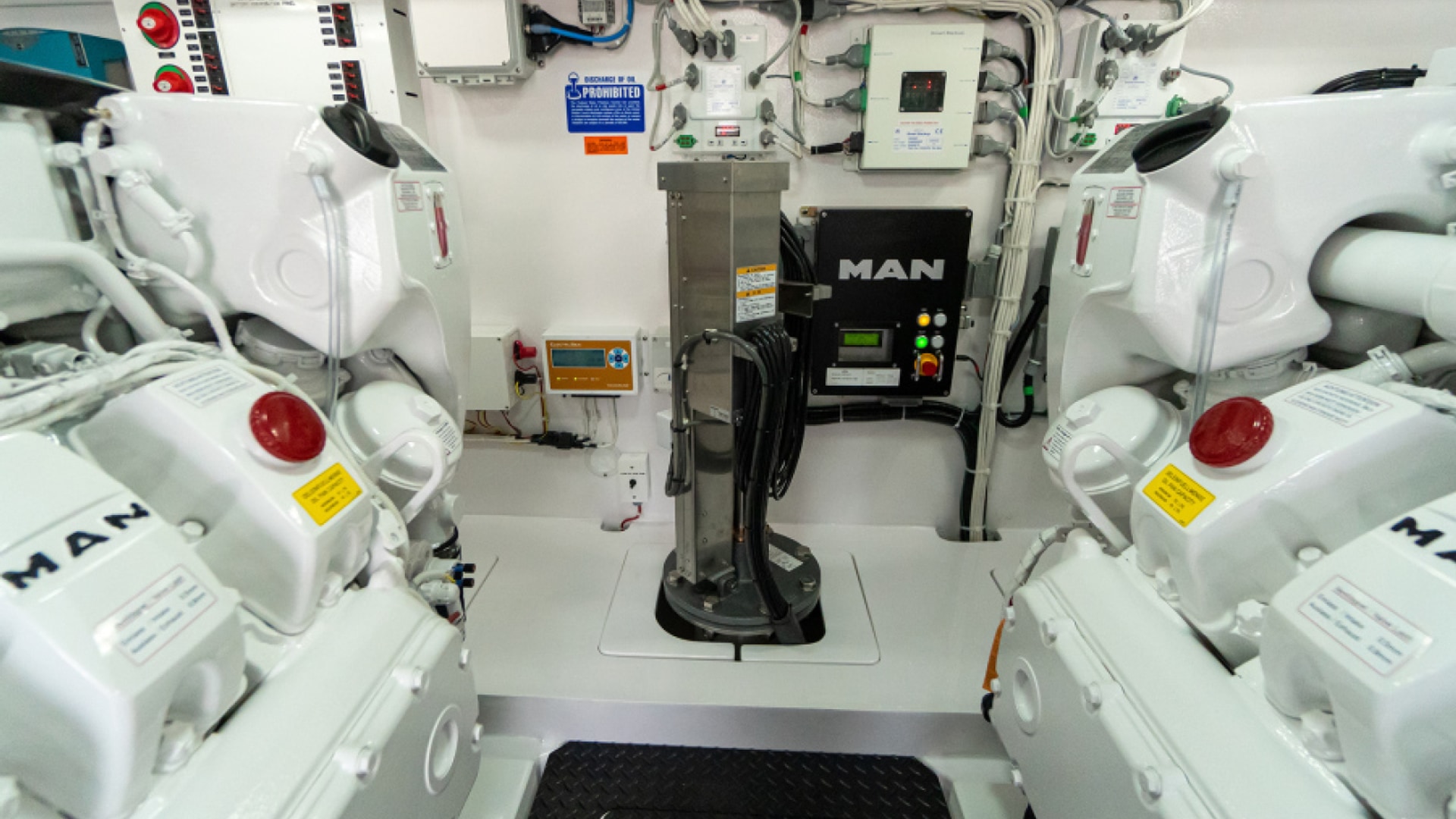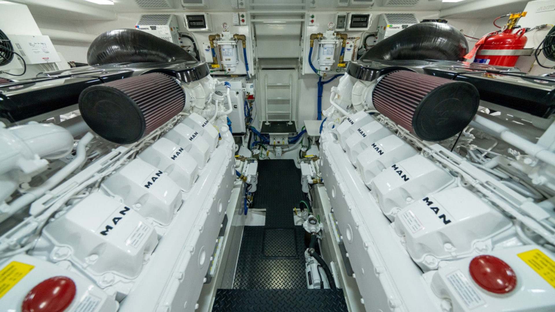 The engine room, easily reached through lift-up steps built into the mezzanine, houses the twin powerplants. A pair of MAN V12 1400CRM (1400 MHP) engines serve as the standard propulsion package. Hull No. 1 – a Sport Tower model – will be powered with the optional MAN V12 1550CRM (1550 MHP) engines.
