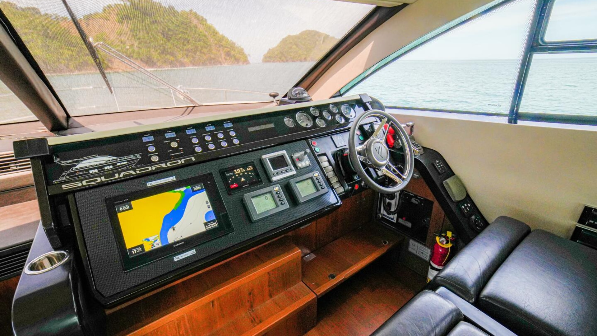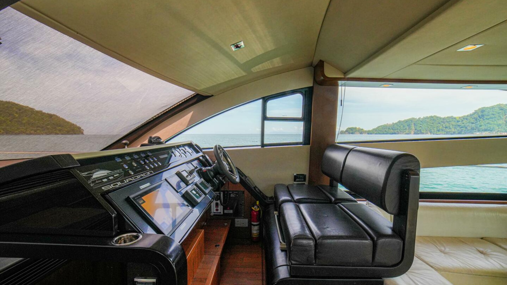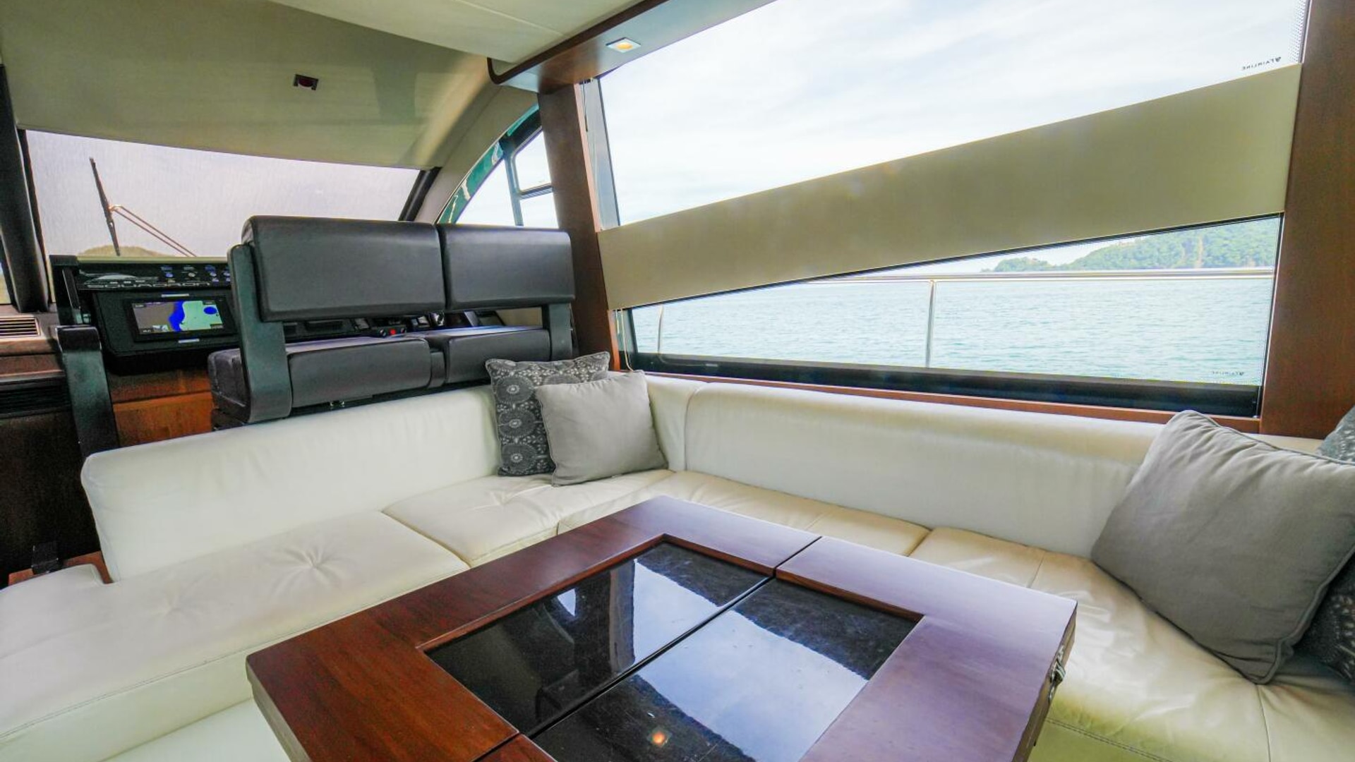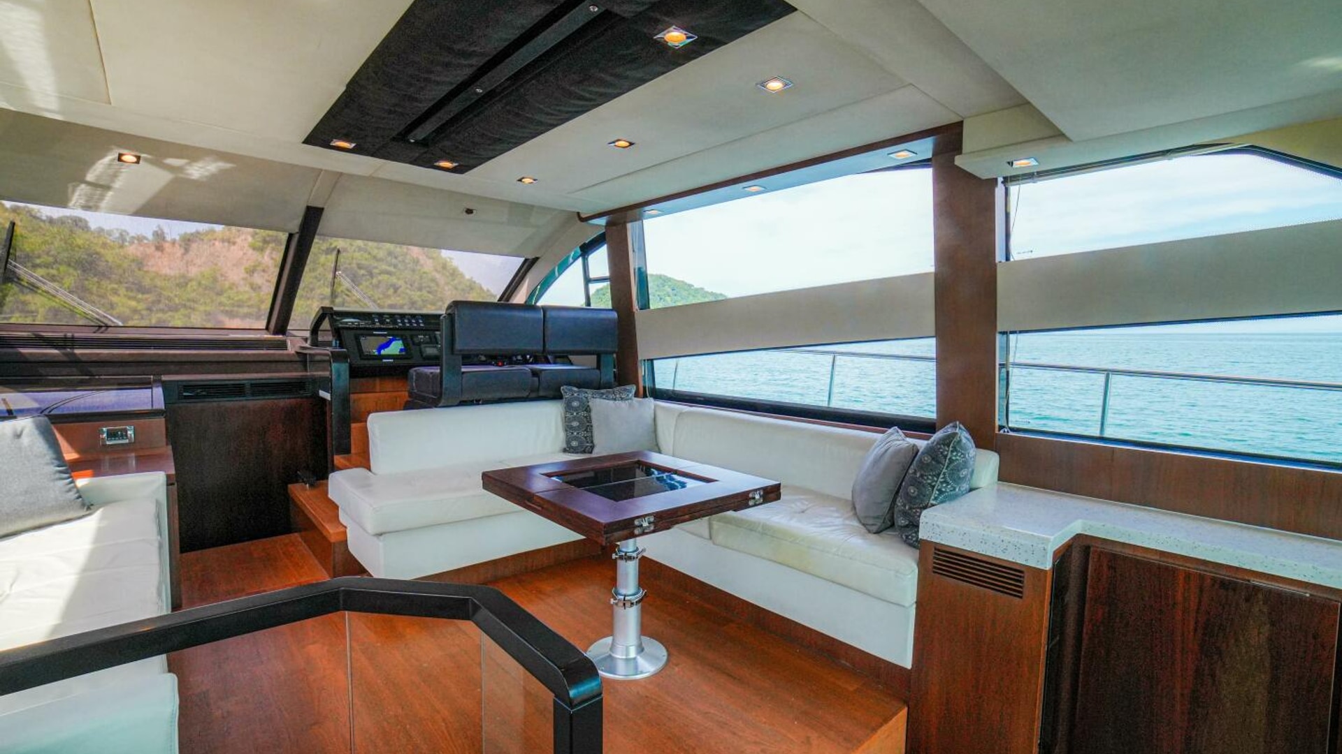- Helm positioned to port to allow visibility through flybridge hatch