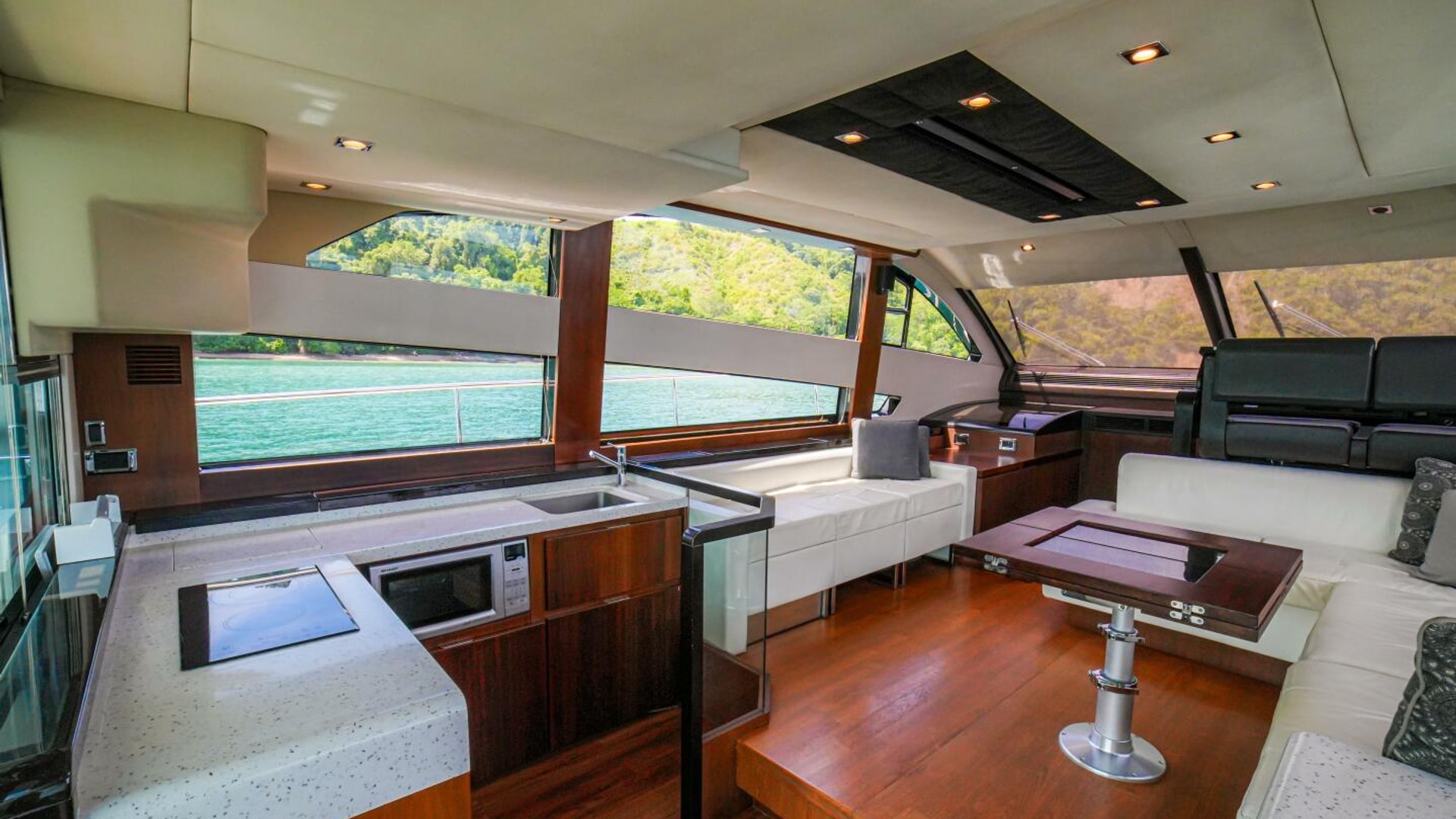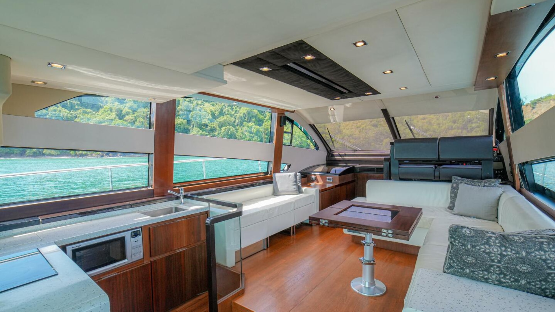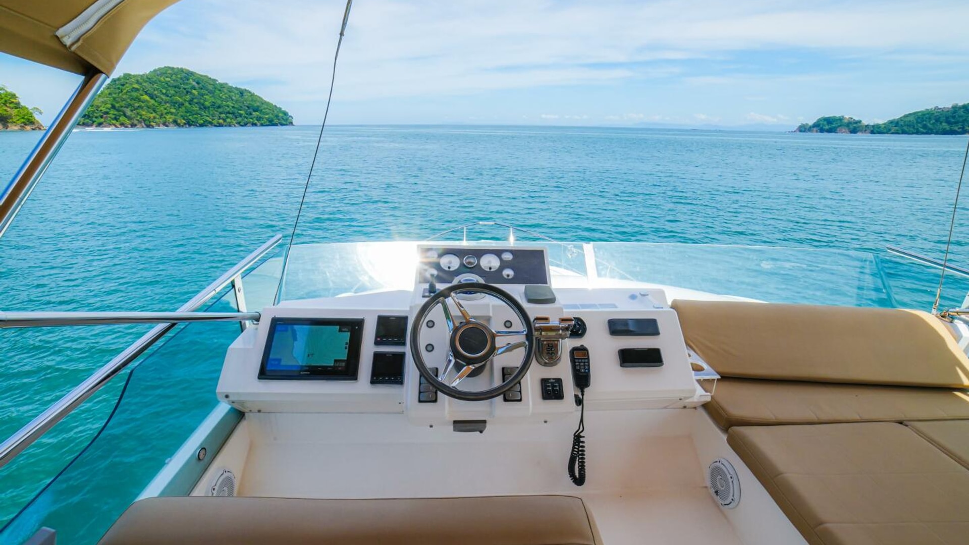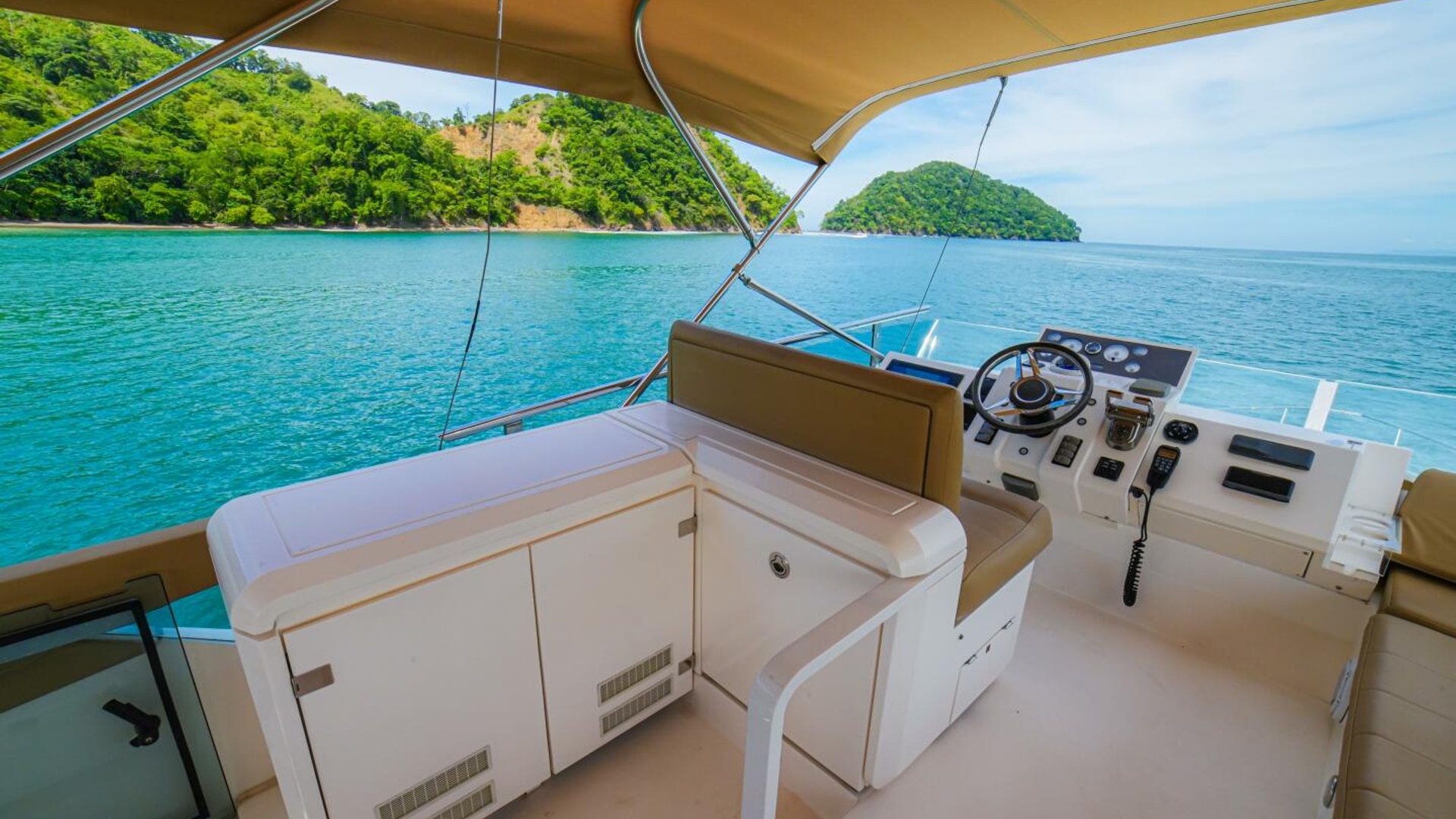 - Helm positioned to port to allow visibility through flybridge hatch