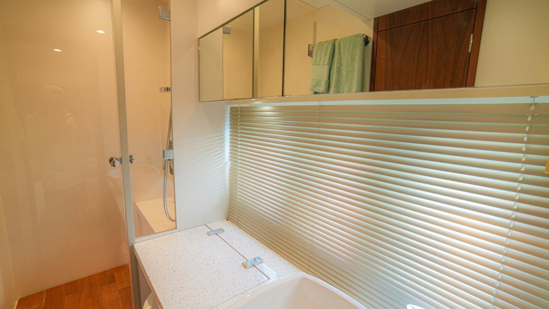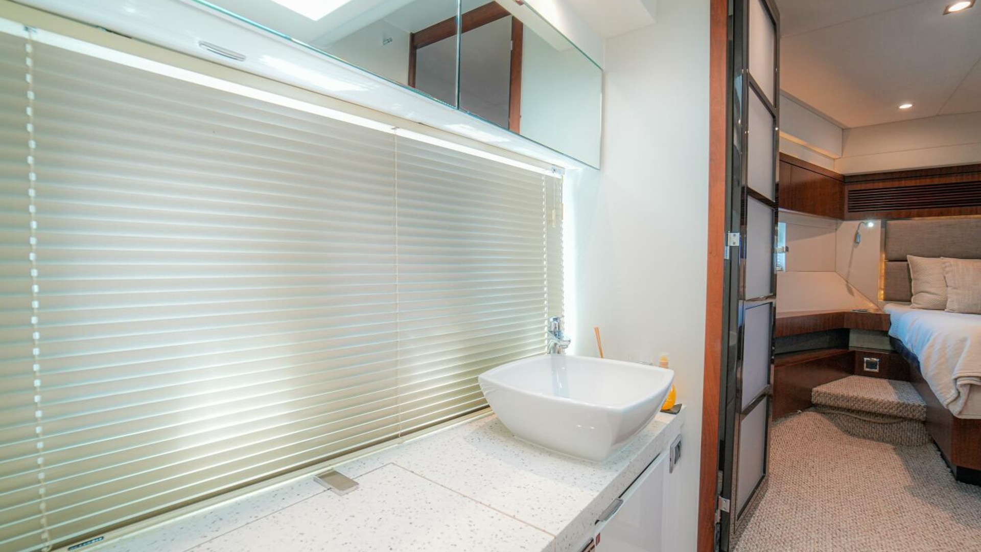 - Full length sliding berth reveals sink and toilet