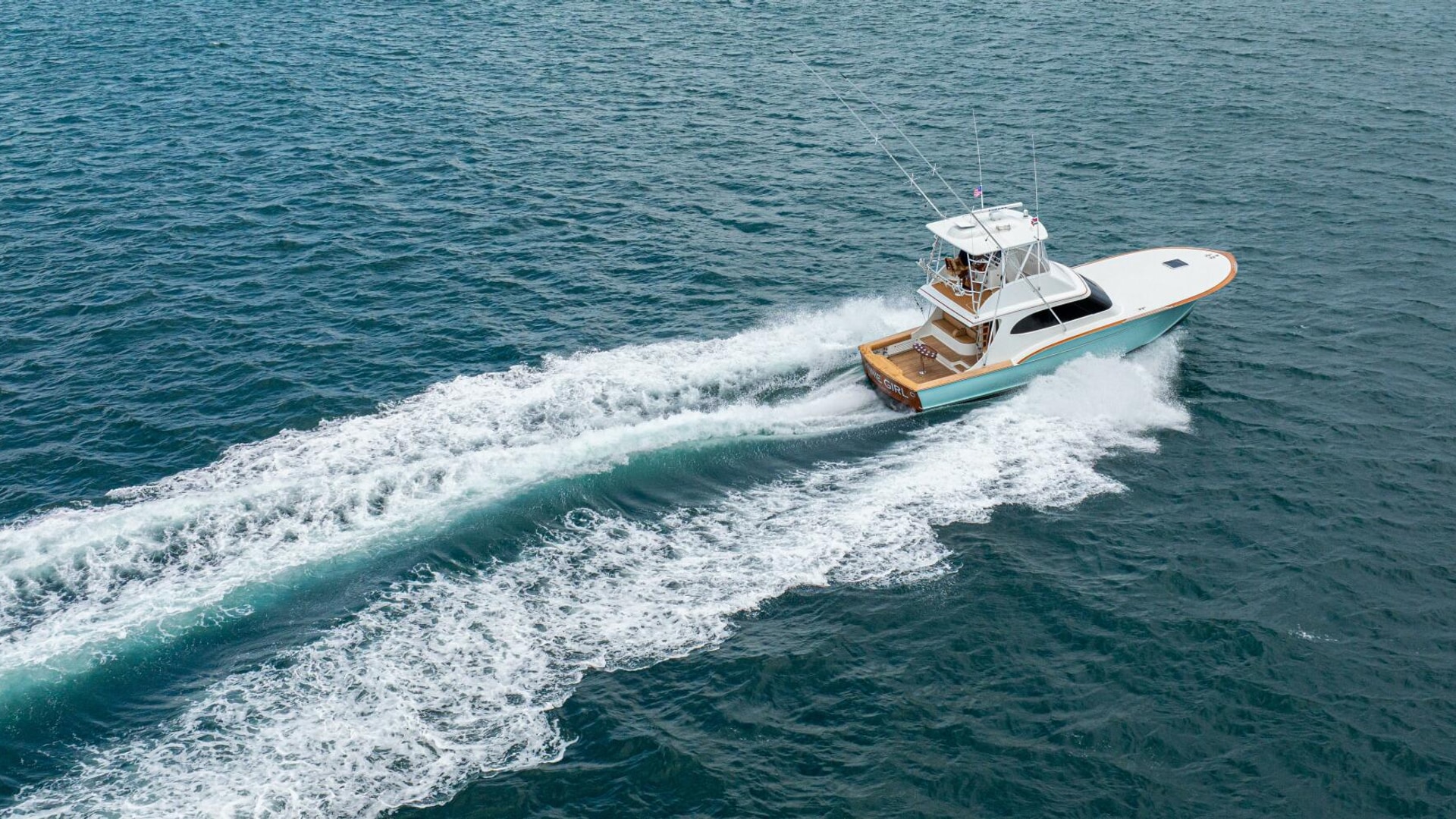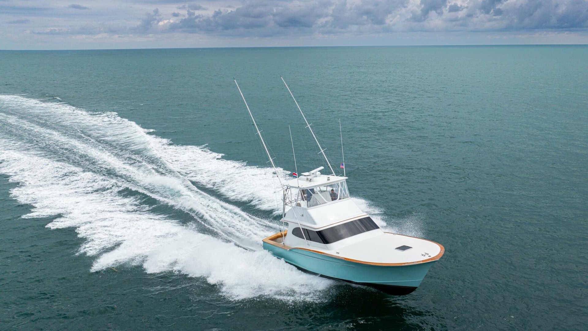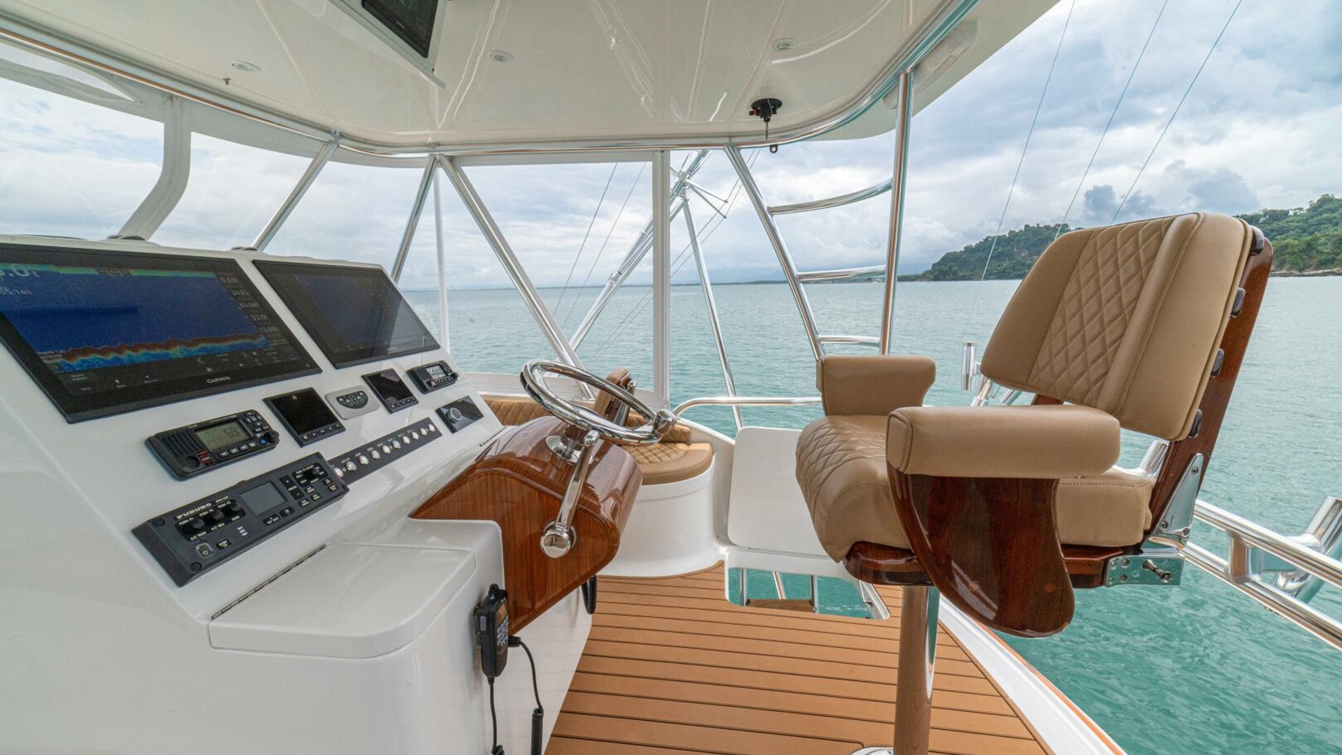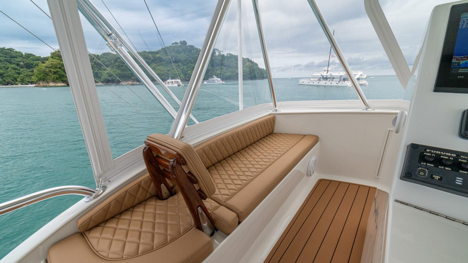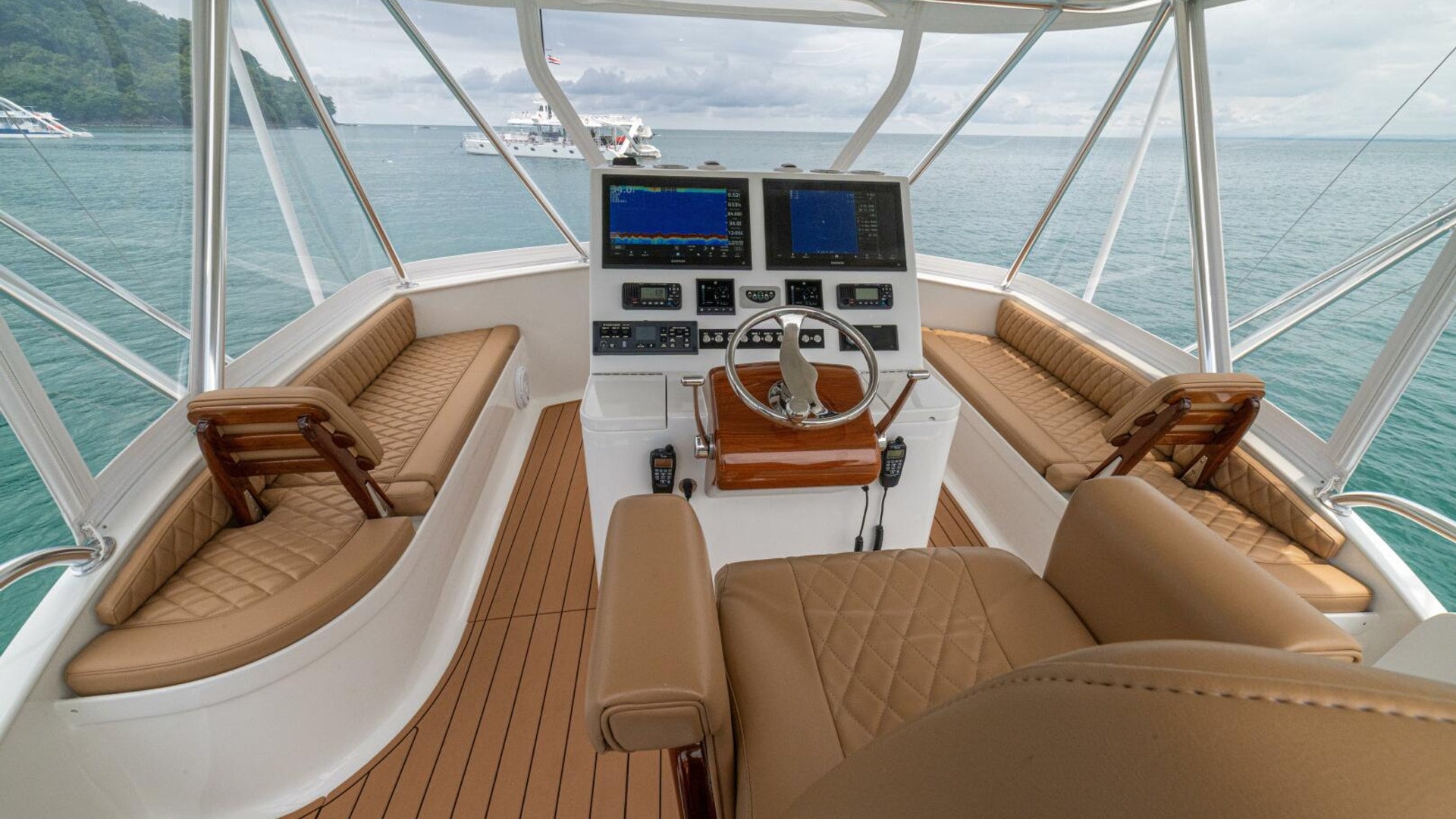 She offers two comfortable staterooms, including a forward cabin with rod and gear storage, and a master with full-size berth, ensuite head, and six built-in storage cabinets. The teak-decked cockpit is tournament-ready with mezzanine seating with AC, freezer, ice bin, and JL Audio sound system, while the center-console flybridge sports Release Marine seating, helm AC, SeaDek flooring, and a full Garmin and Furuno electronics suite.