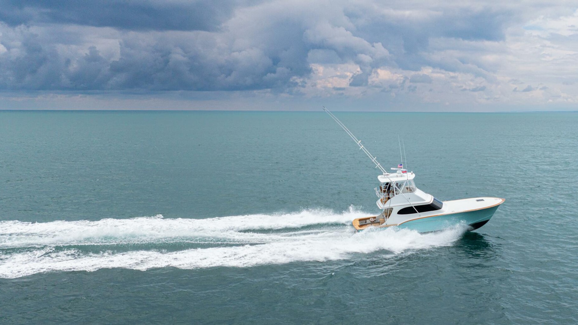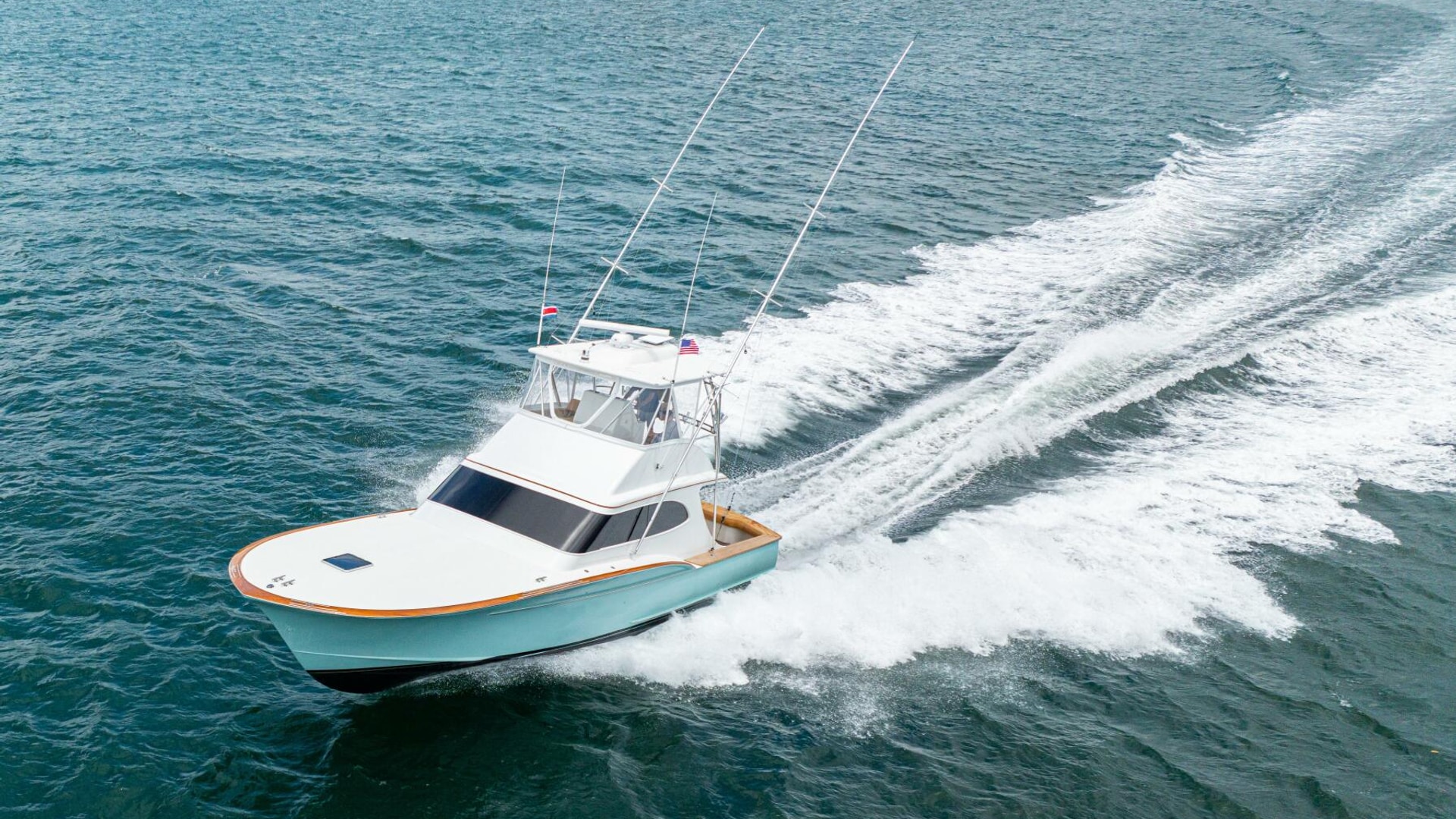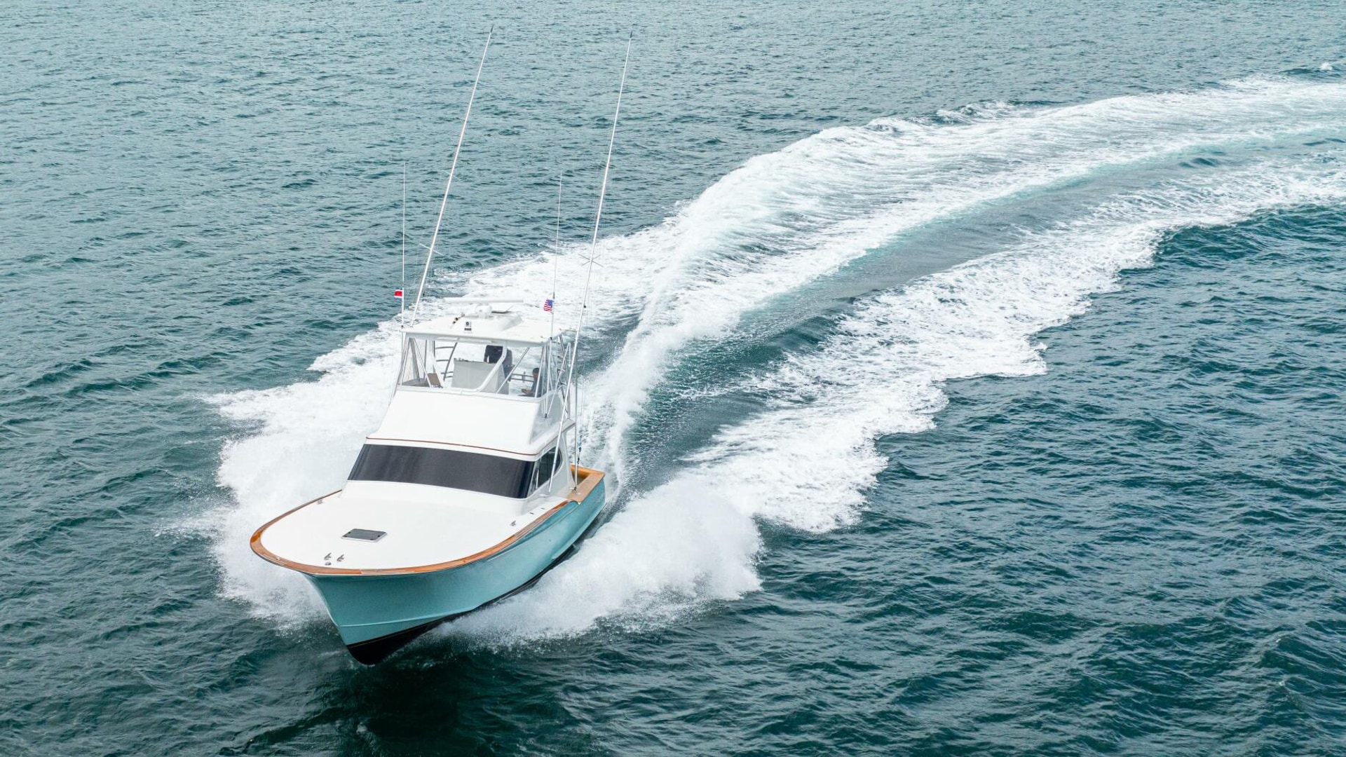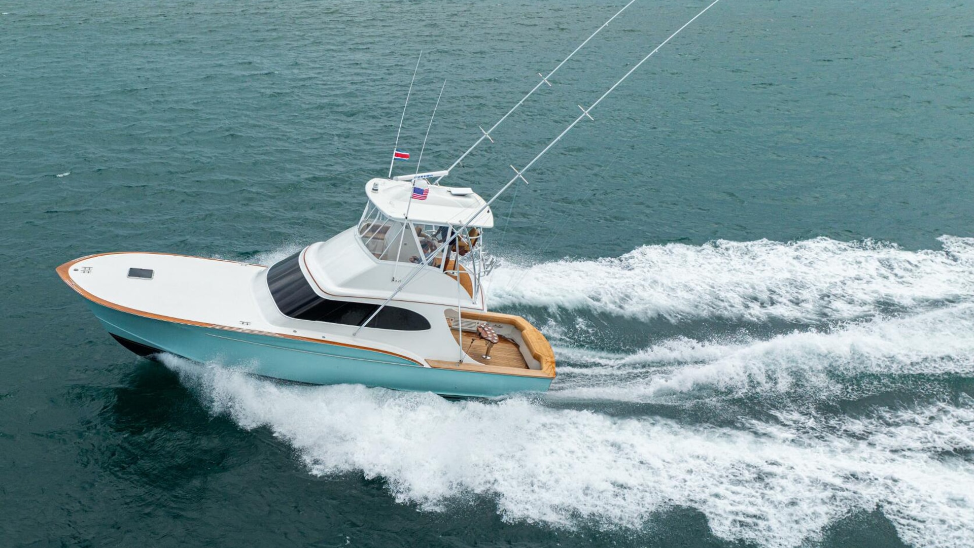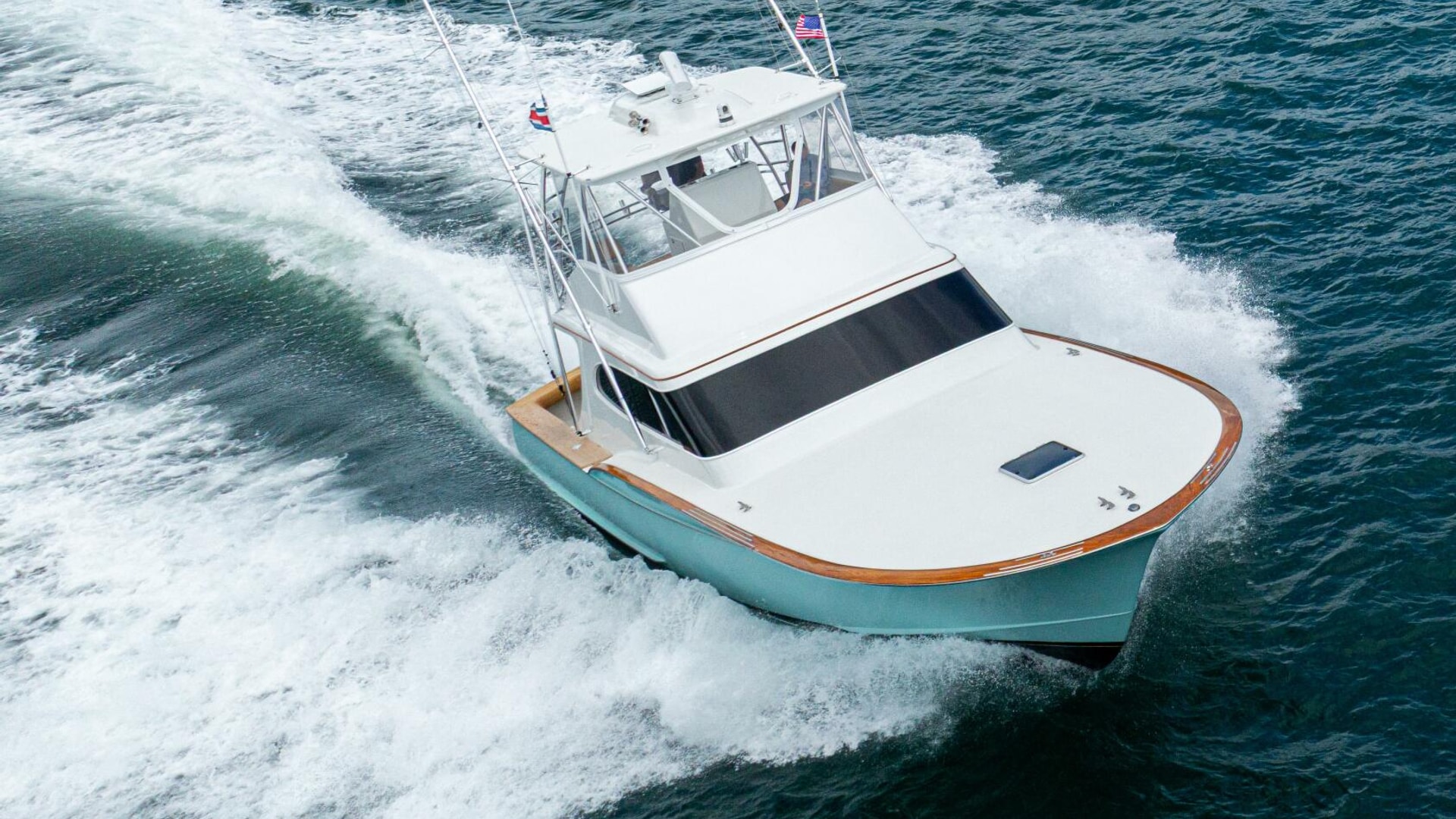 She offers two comfortable staterooms, including a forward cabin with rod and gear storage, and a master with full-size berth, ensuite head, and six built-in storage cabinets. The teak-decked cockpit is tournament-ready with mezzanine seating with AC, freezer, ice bin, and JL Audio sound system, while the center-console flybridge sports Release Marine seating, helm AC, SeaDek flooring, and a full Garmin and Furuno electronics suite.