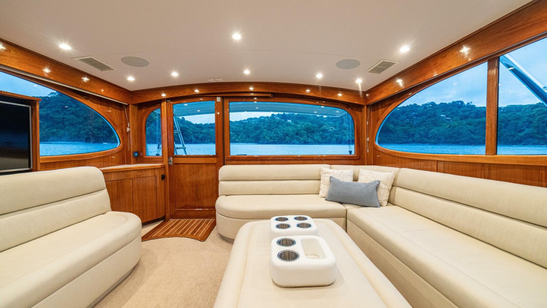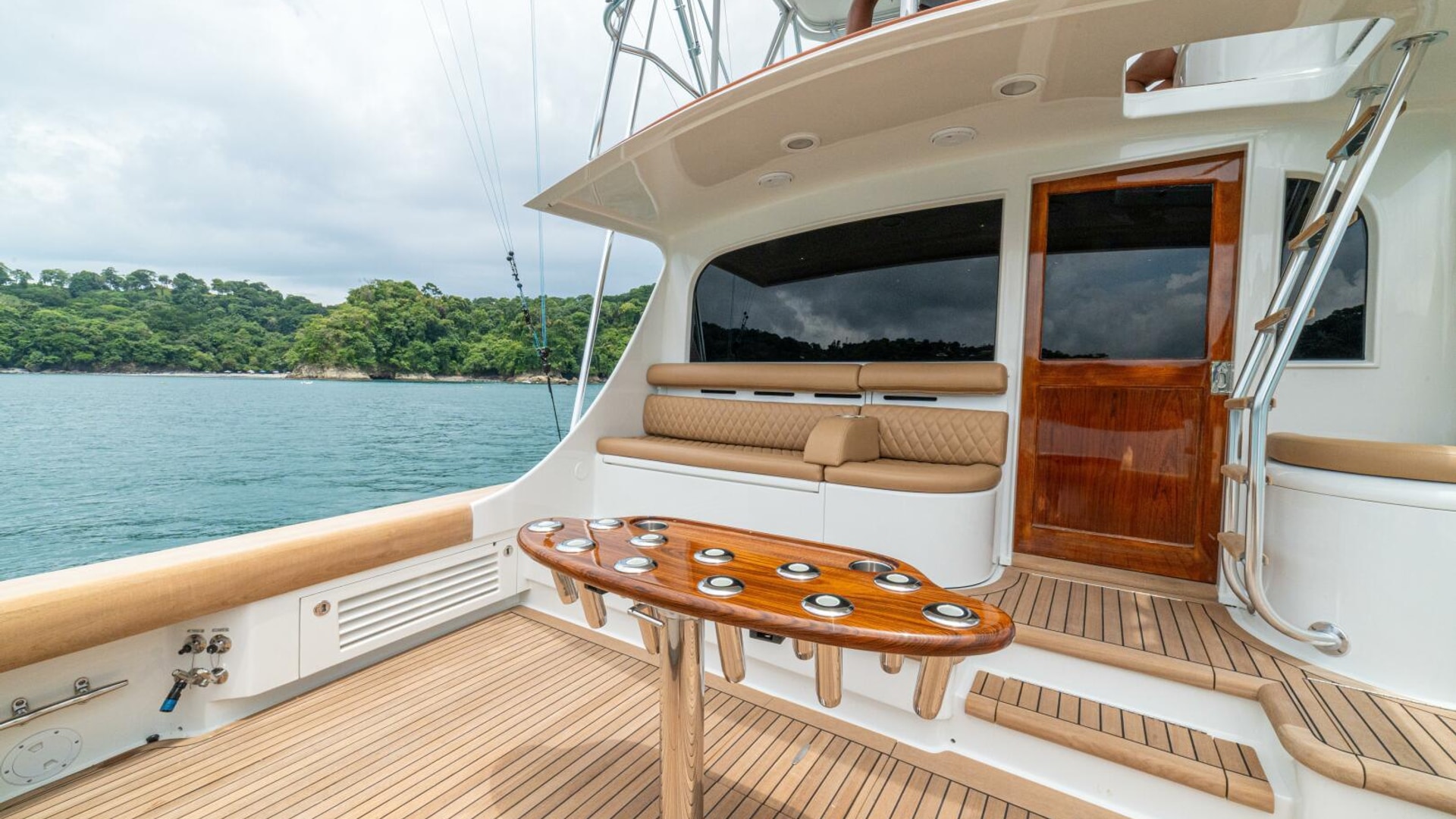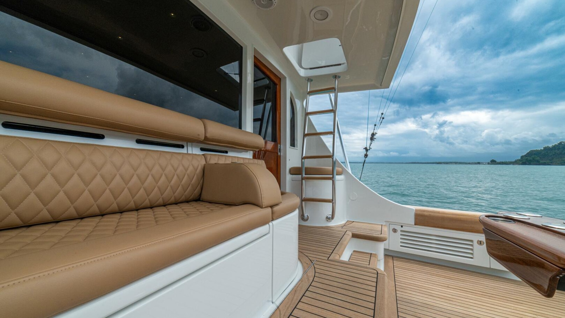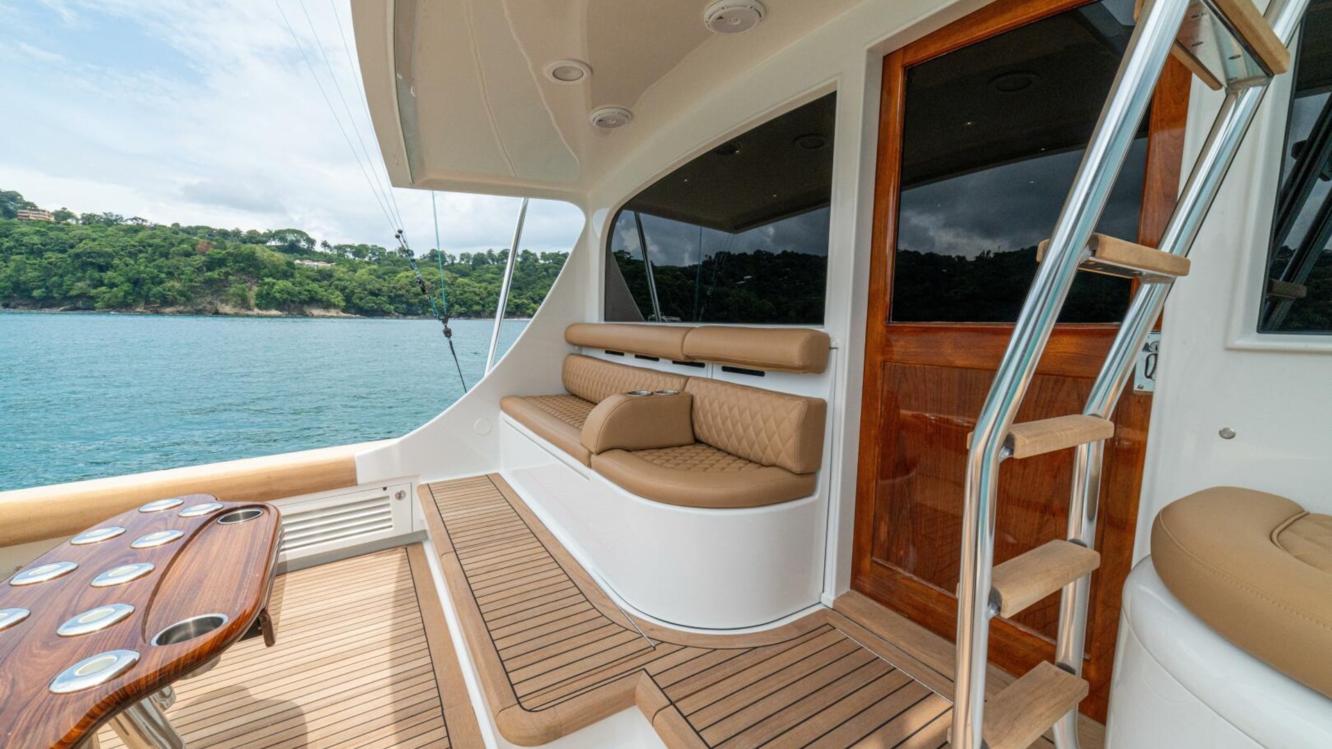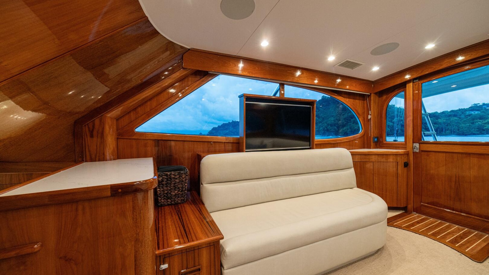 Her warm teak interior features a U-shaped salon sofa with abundant storage, pop-up Samsung TV, and a well-appointed galley with JennAir fridge drawers, slide-out liquor cabinet, and quartz countertops.