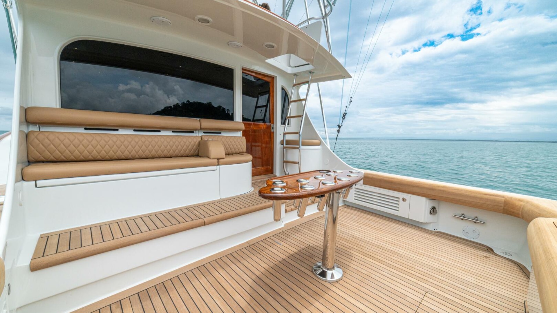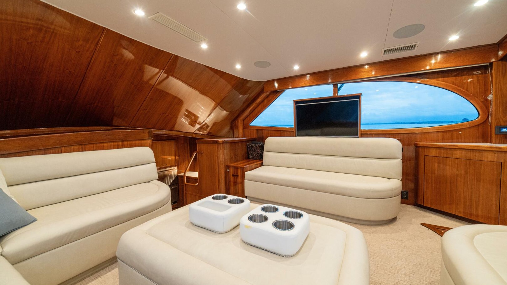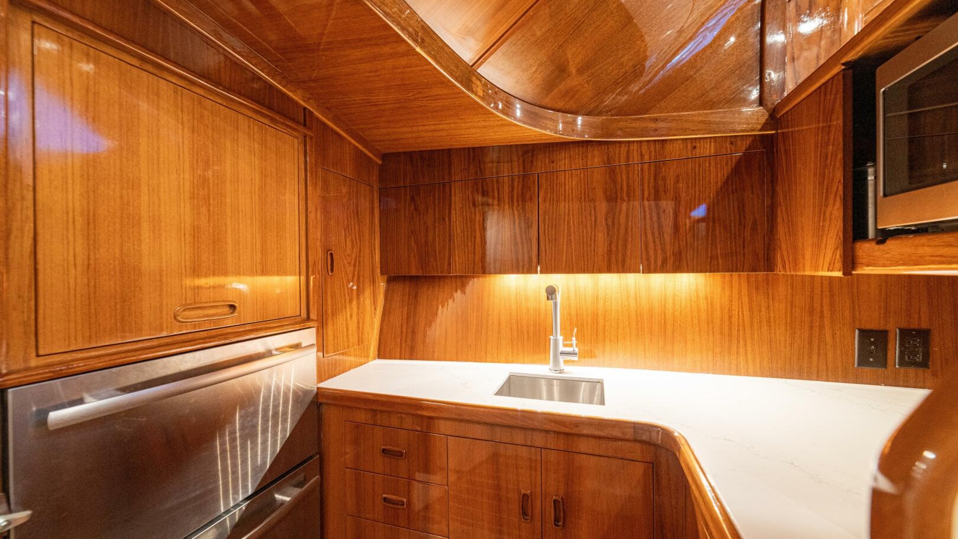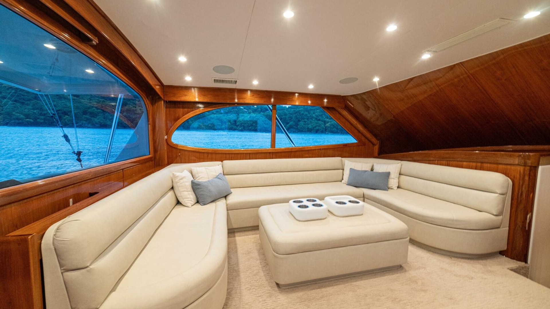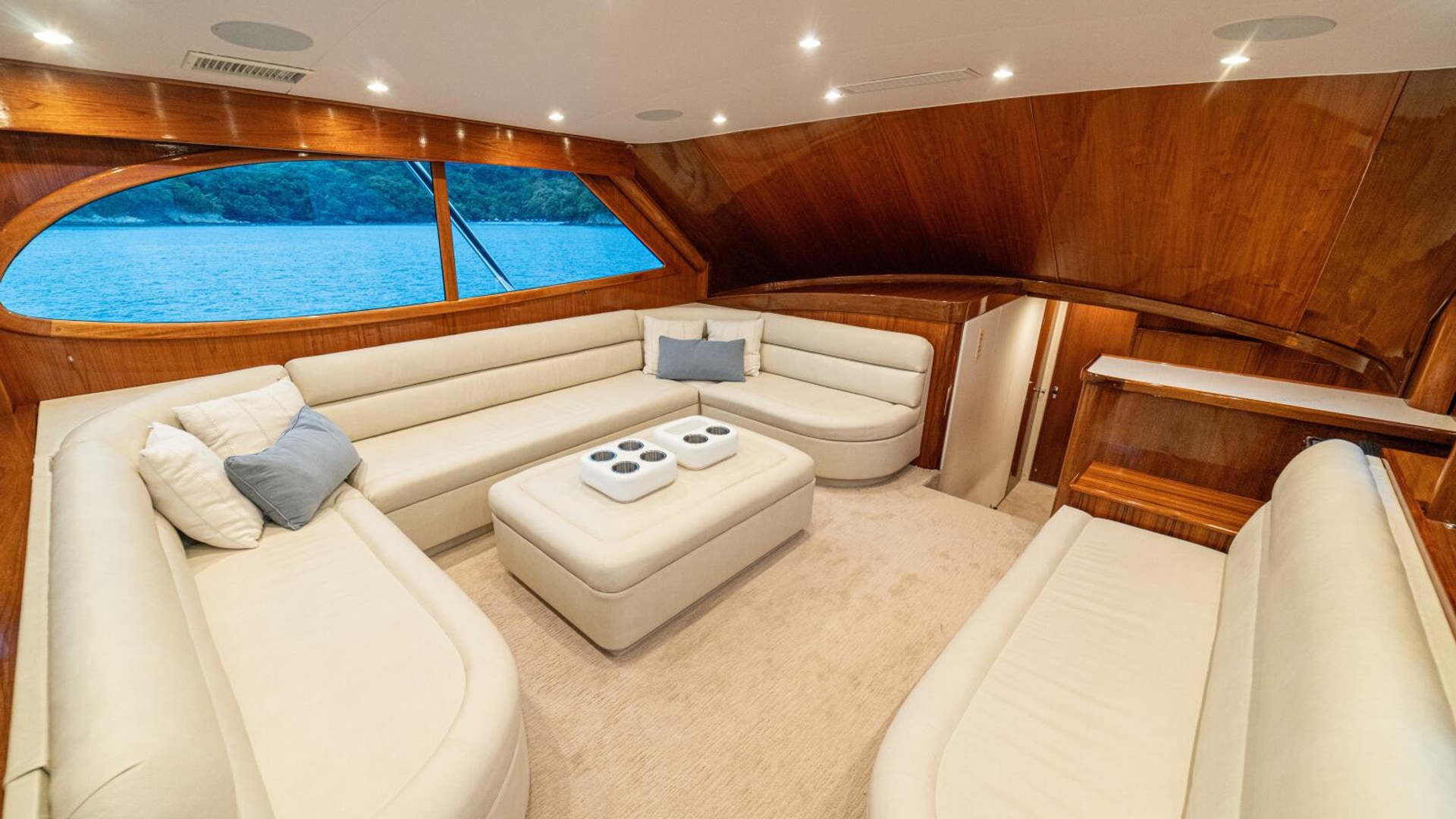 Her warm teak interior features a U-shaped salon sofa with abundant storage, pop-up Samsung TV, and a well-appointed galley with JennAir fridge drawers, slide-out liquor cabinet, and quartz countertops.