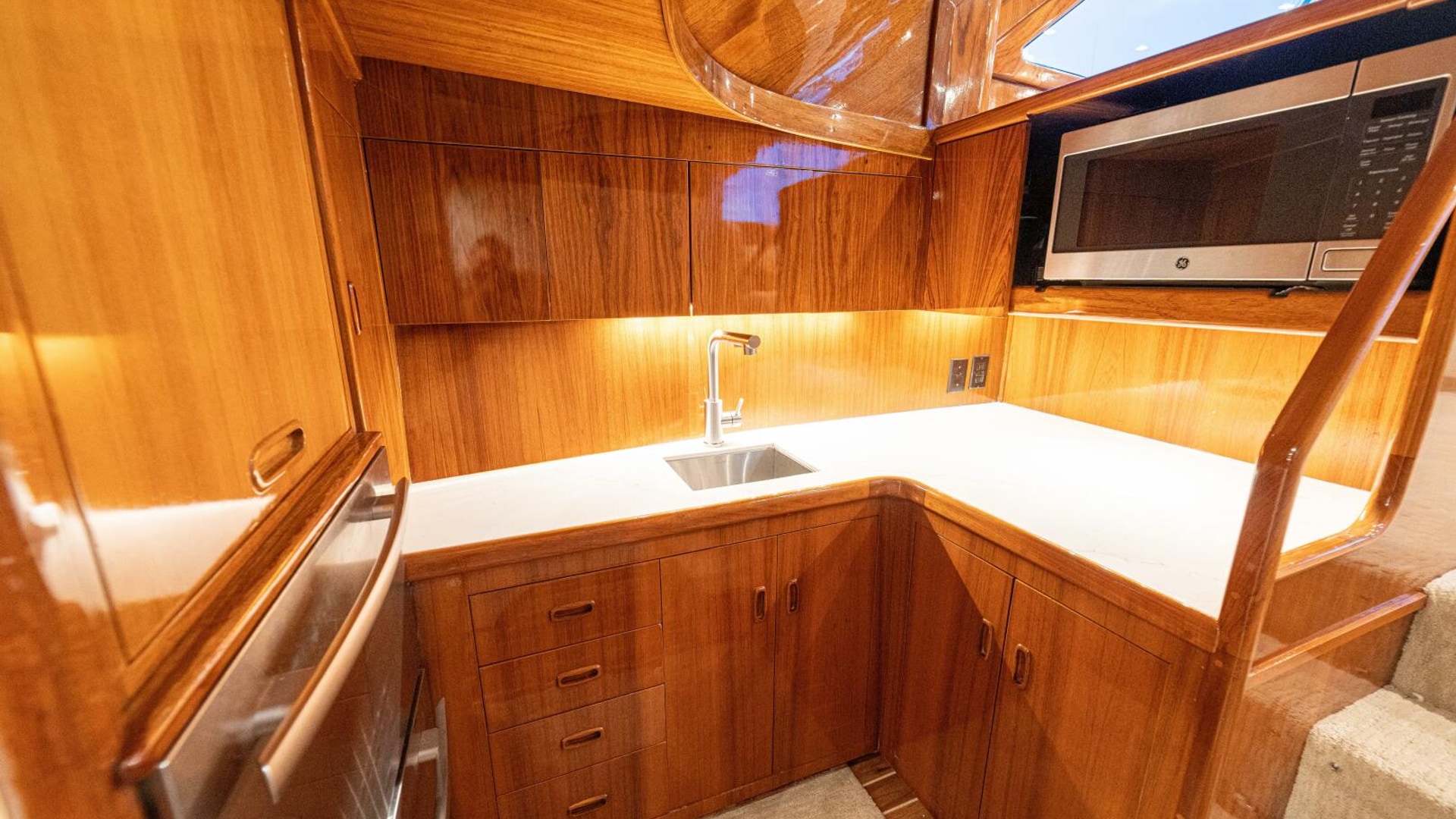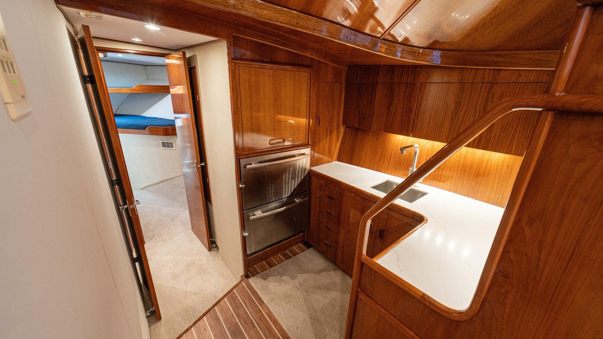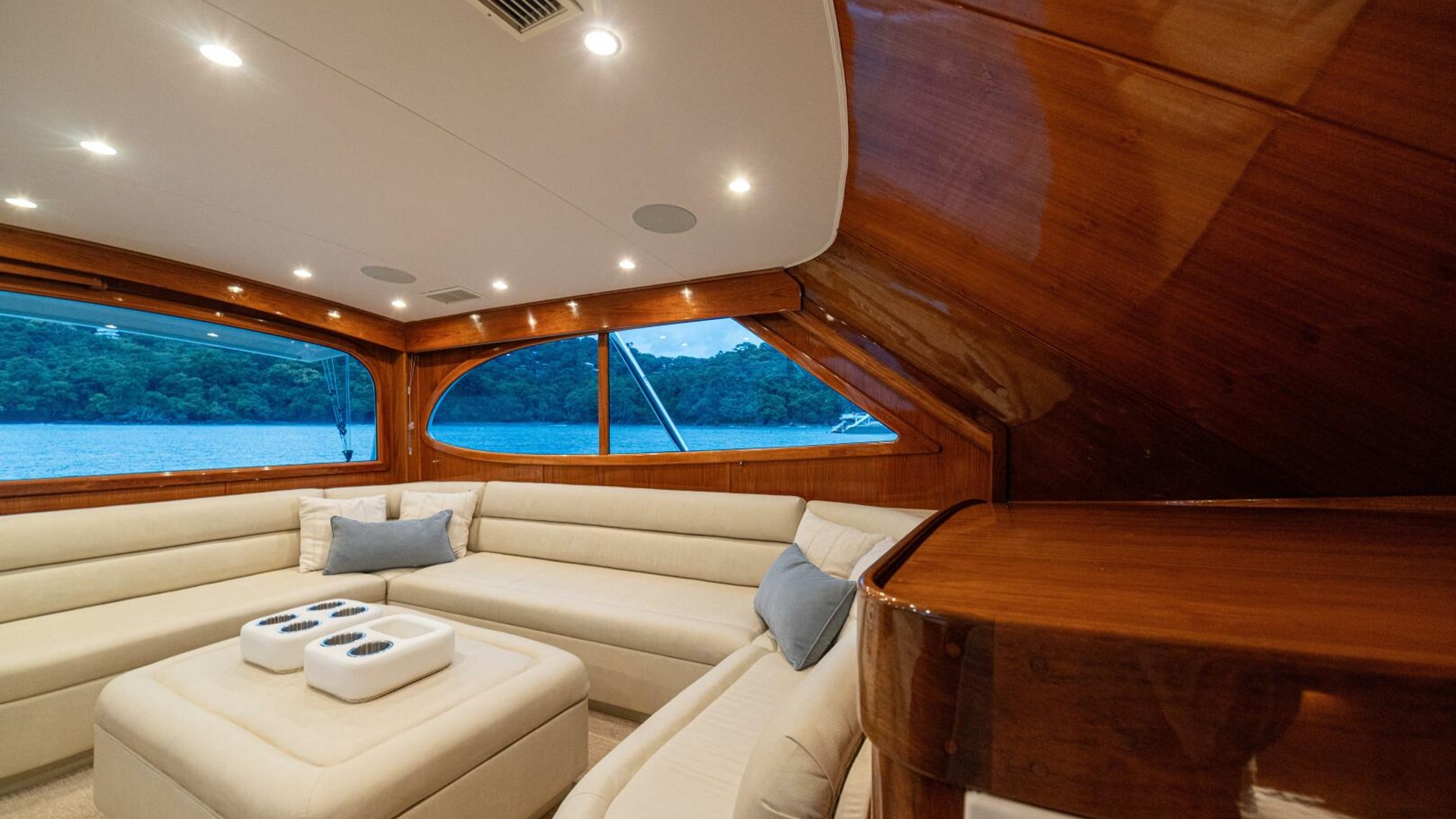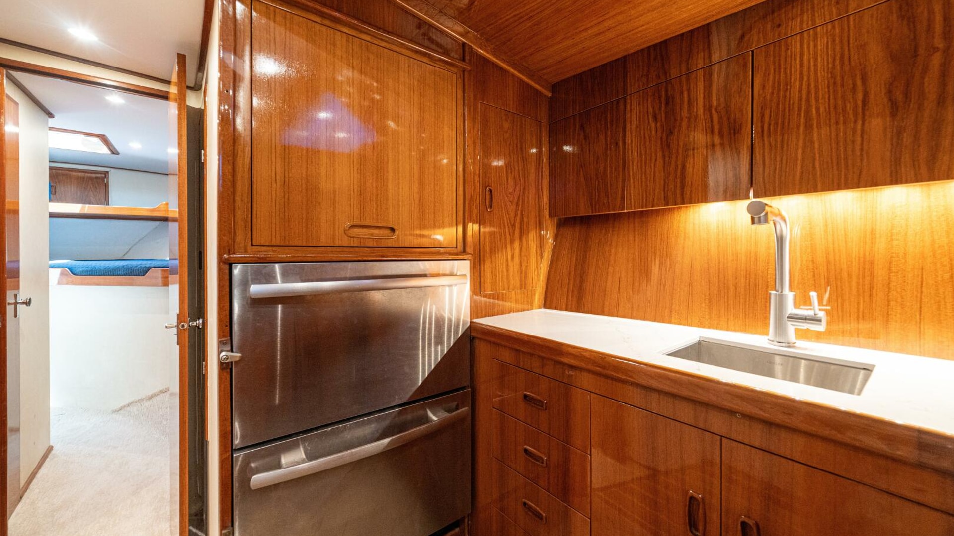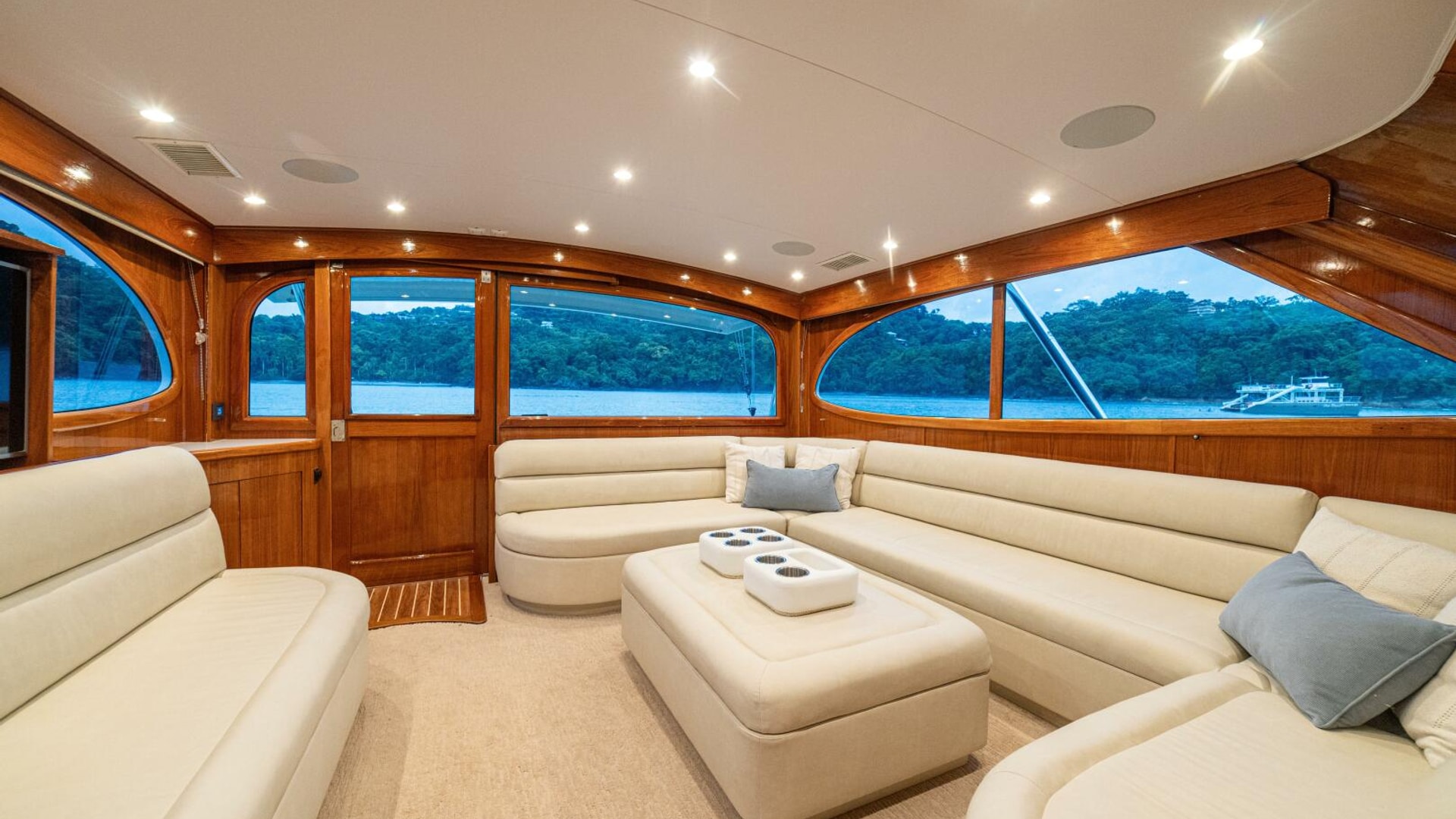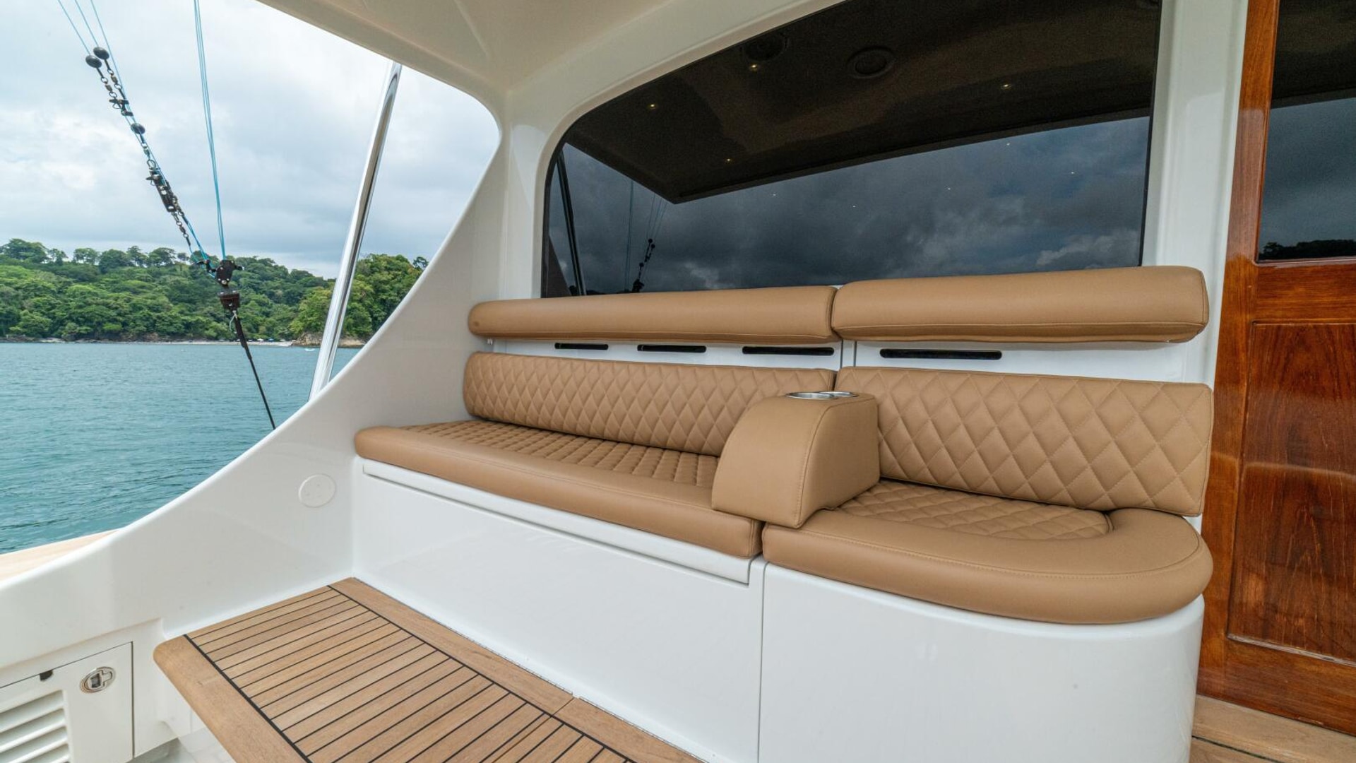 Her warm teak interior features a U-shaped salon sofa with abundant storage, pop-up Samsung TV, and a well-appointed galley with JennAir fridge drawers, slide-out liquor cabinet, and quartz countertops.