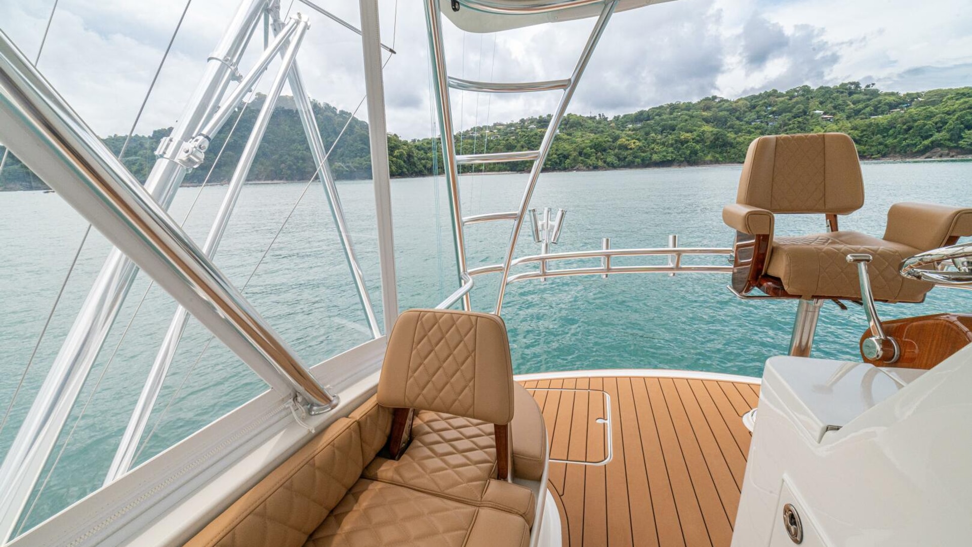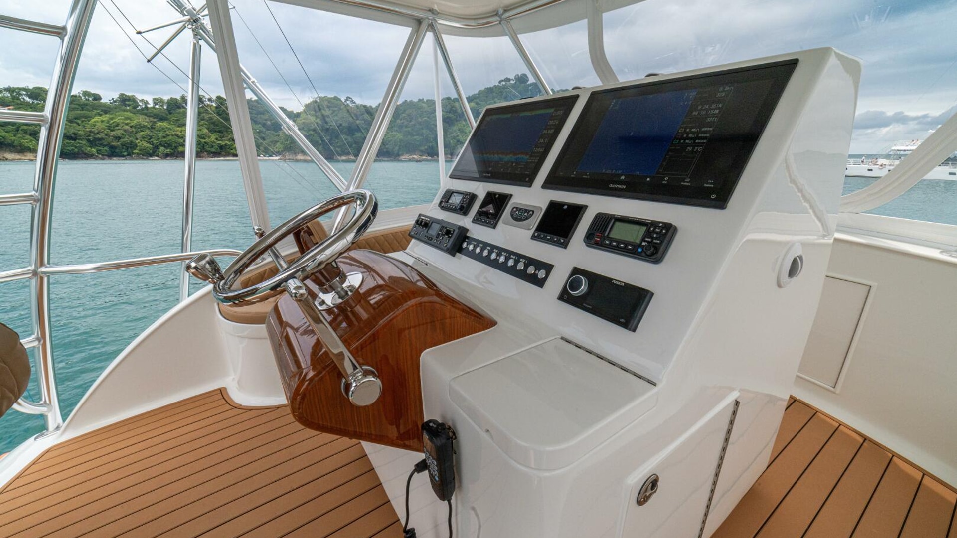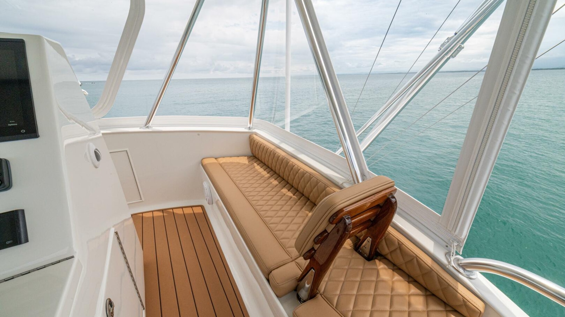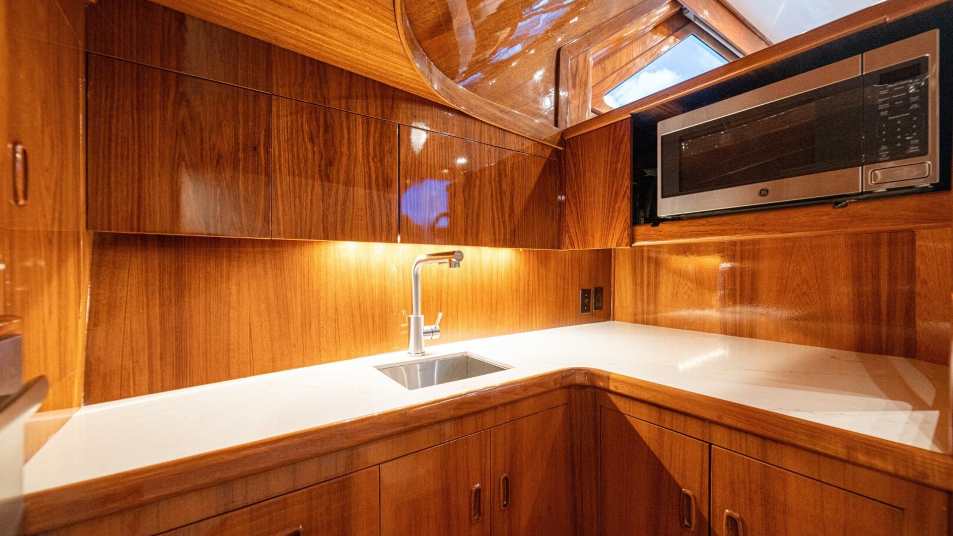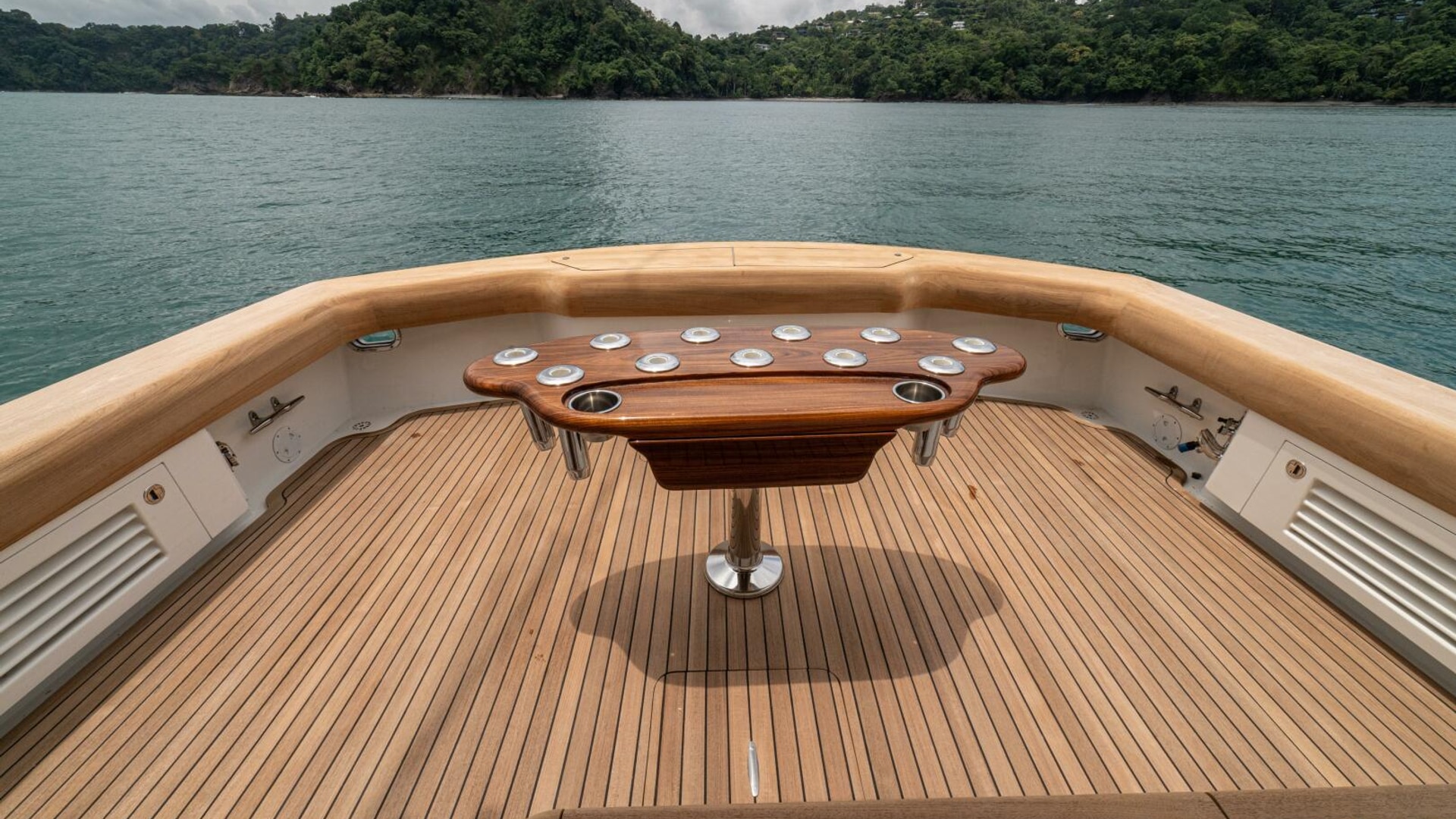 Her warm teak interior features a U-shaped salon sofa with abundant storage, pop-up Samsung TV, and a well-appointed galley with JennAir fridge drawers, slide-out liquor cabinet, and quartz countertops.