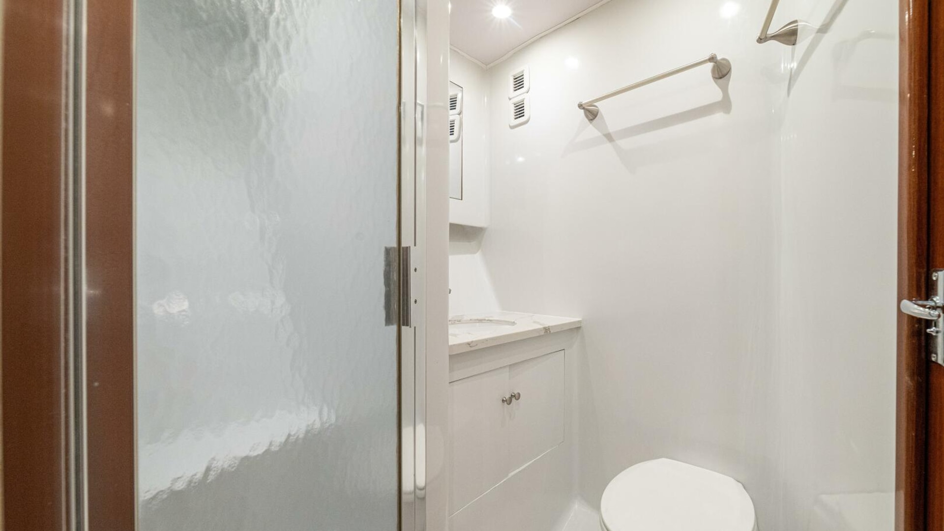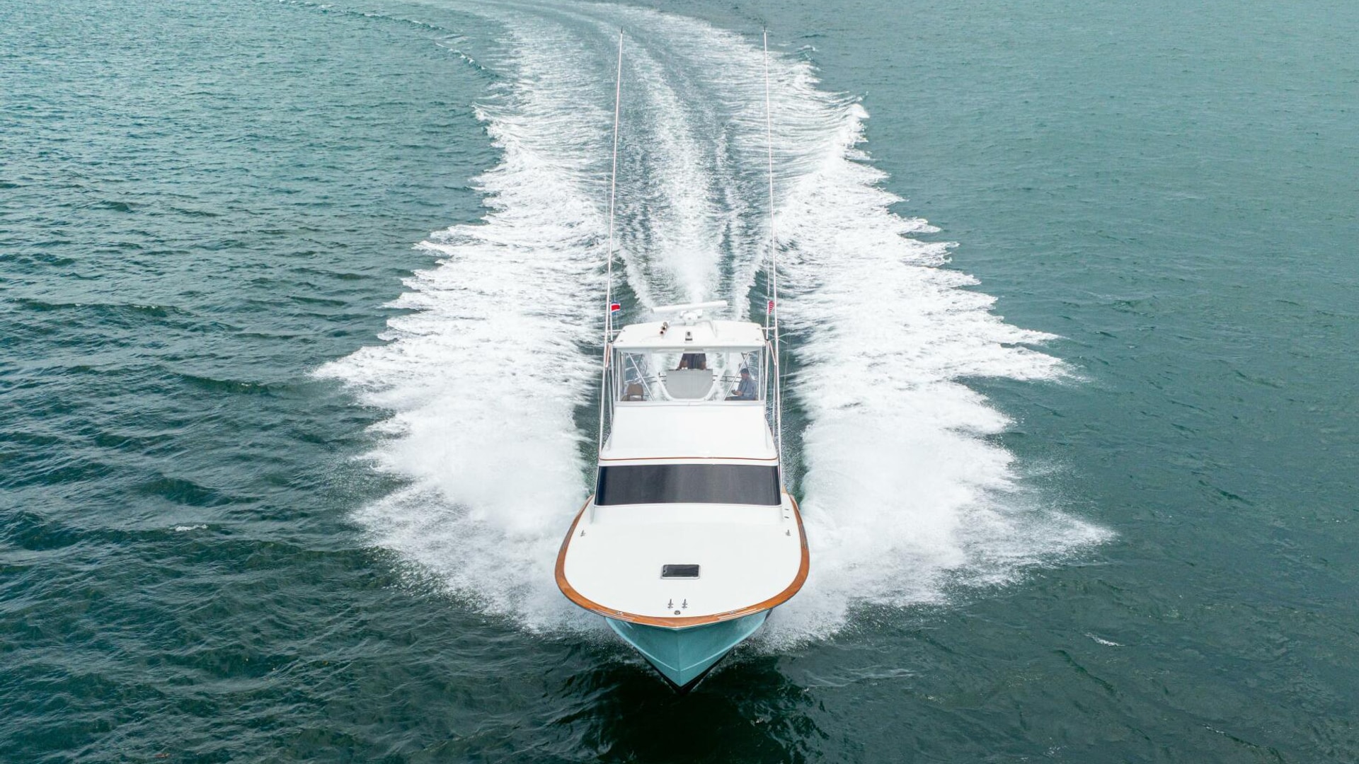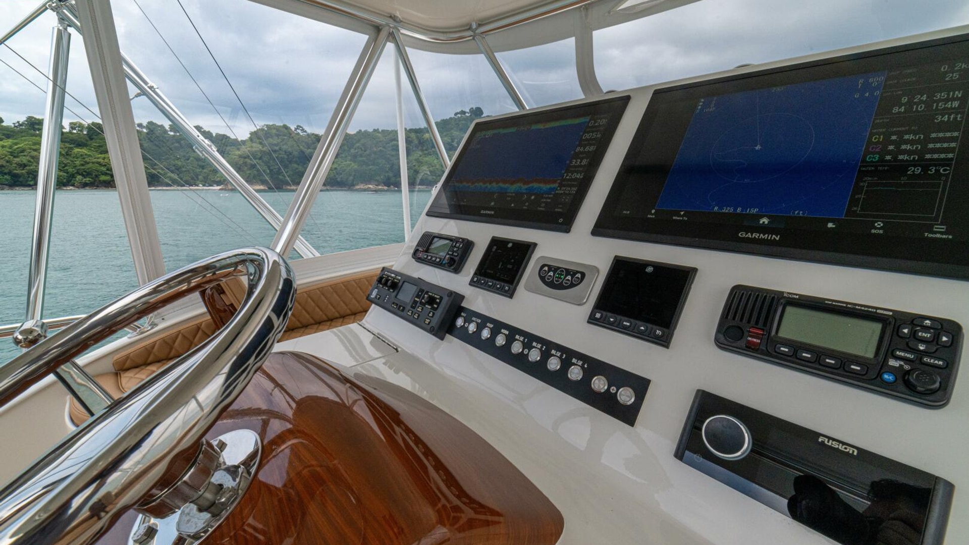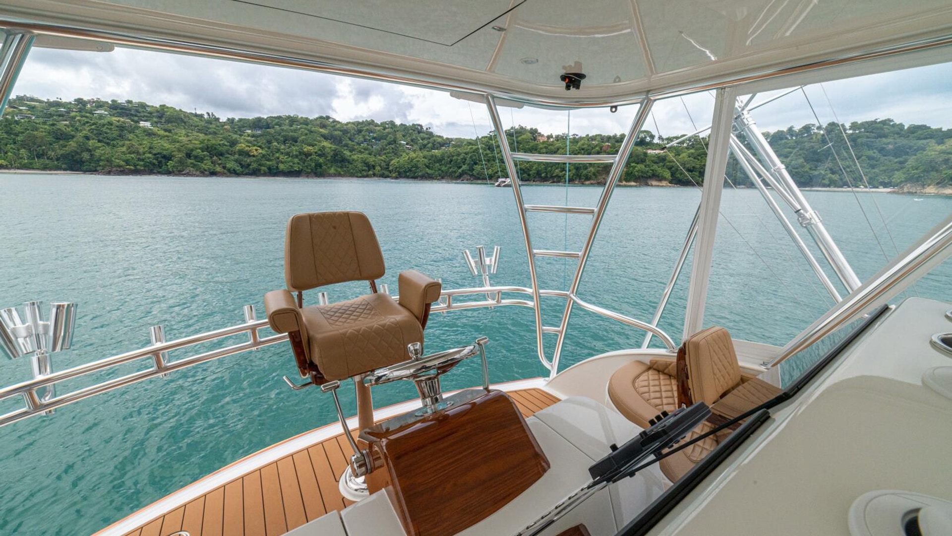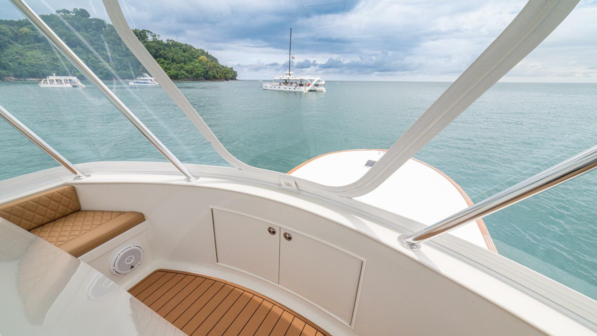 Her warm teak interior features a U-shaped salon sofa with abundant storage, pop-up Samsung TV, and a well-appointed galley with JennAir fridge drawers, slide-out liquor cabinet, and quartz countertops.