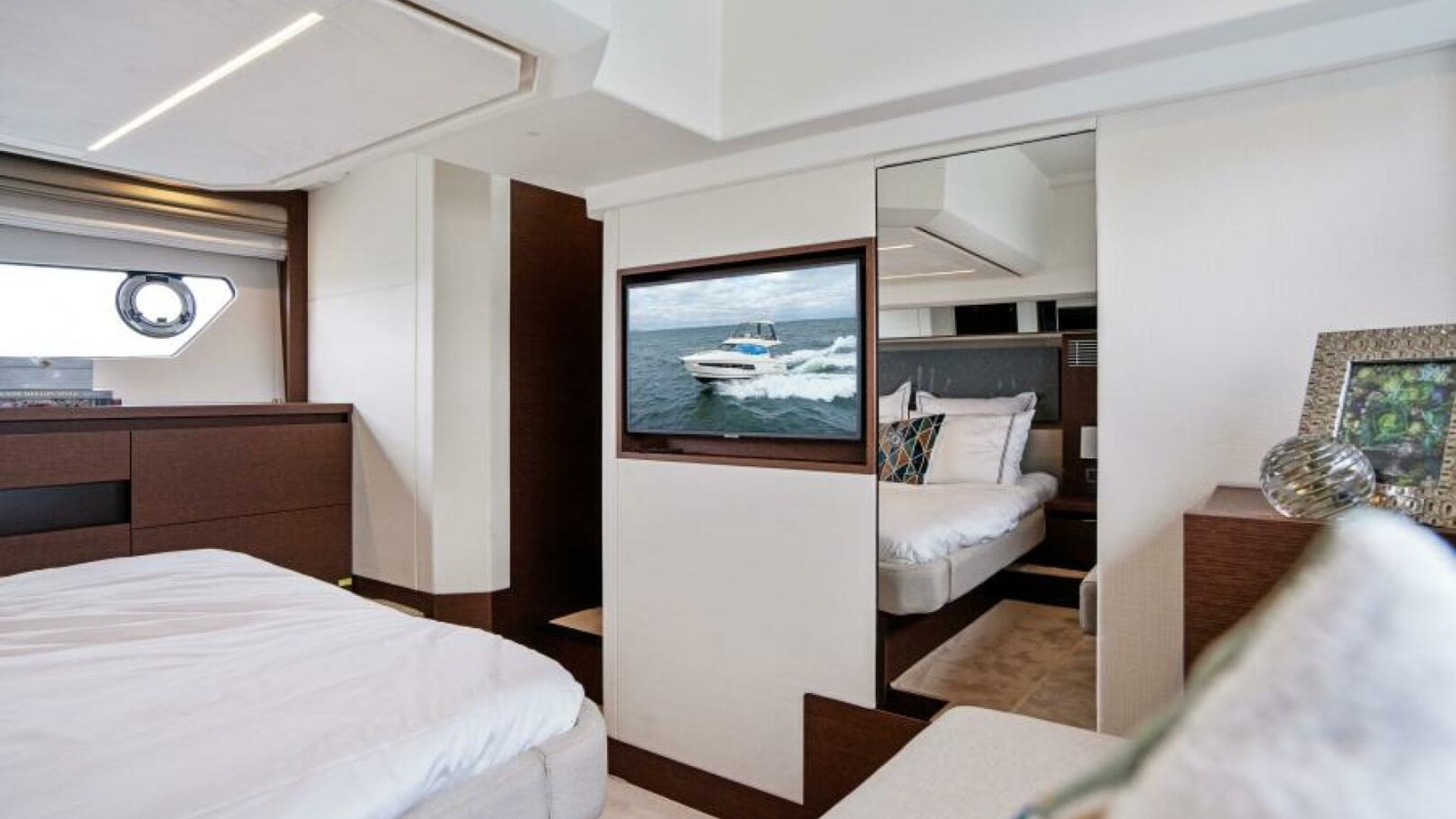 - TV Connections for Main Salon (including electric lift), TV Connections for Master Stateroom Aft, Amplified TV Antenna, Pre-wiring for Satellite Antenna