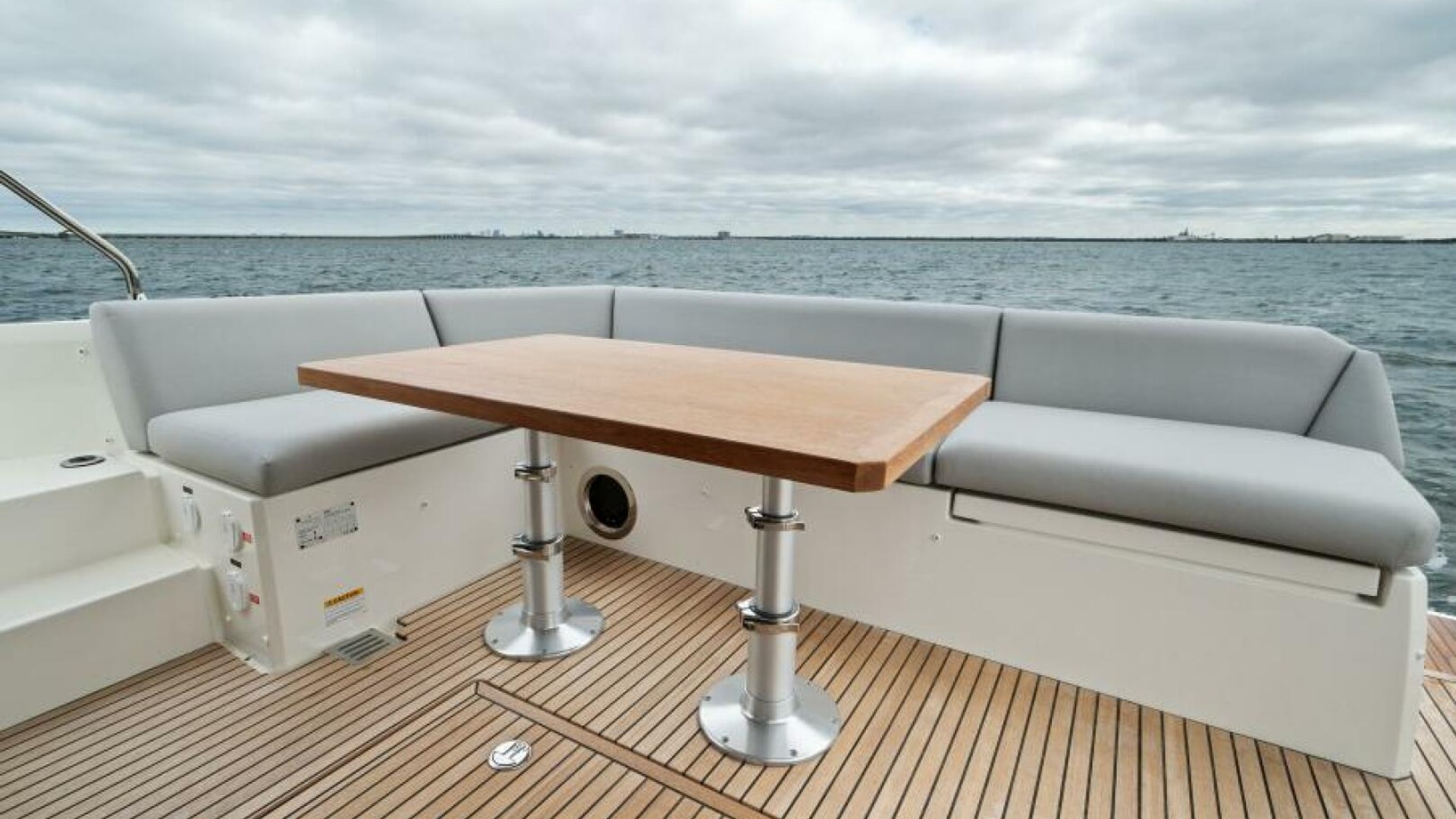 - Teak Cockpit Table with Telescopic Legs, Maindeck Protective Covers: Cockpit Seating and Cockpit Table Covers, Windlass Control and Chain Counter at Helm Station, Electric Trim Tabs, Stainless Steel Bow Protection, Electric Opening Window to Starboard, 2- Burner Ceramic Cooktop, Miele Combination Microwave/Grill, Freshwater/Saltwater Wash-Down System in Cockpit and Anchor Locker with Dedicated Pump, Dock Water Inlet, Glendinning Shorepower Cable Management System