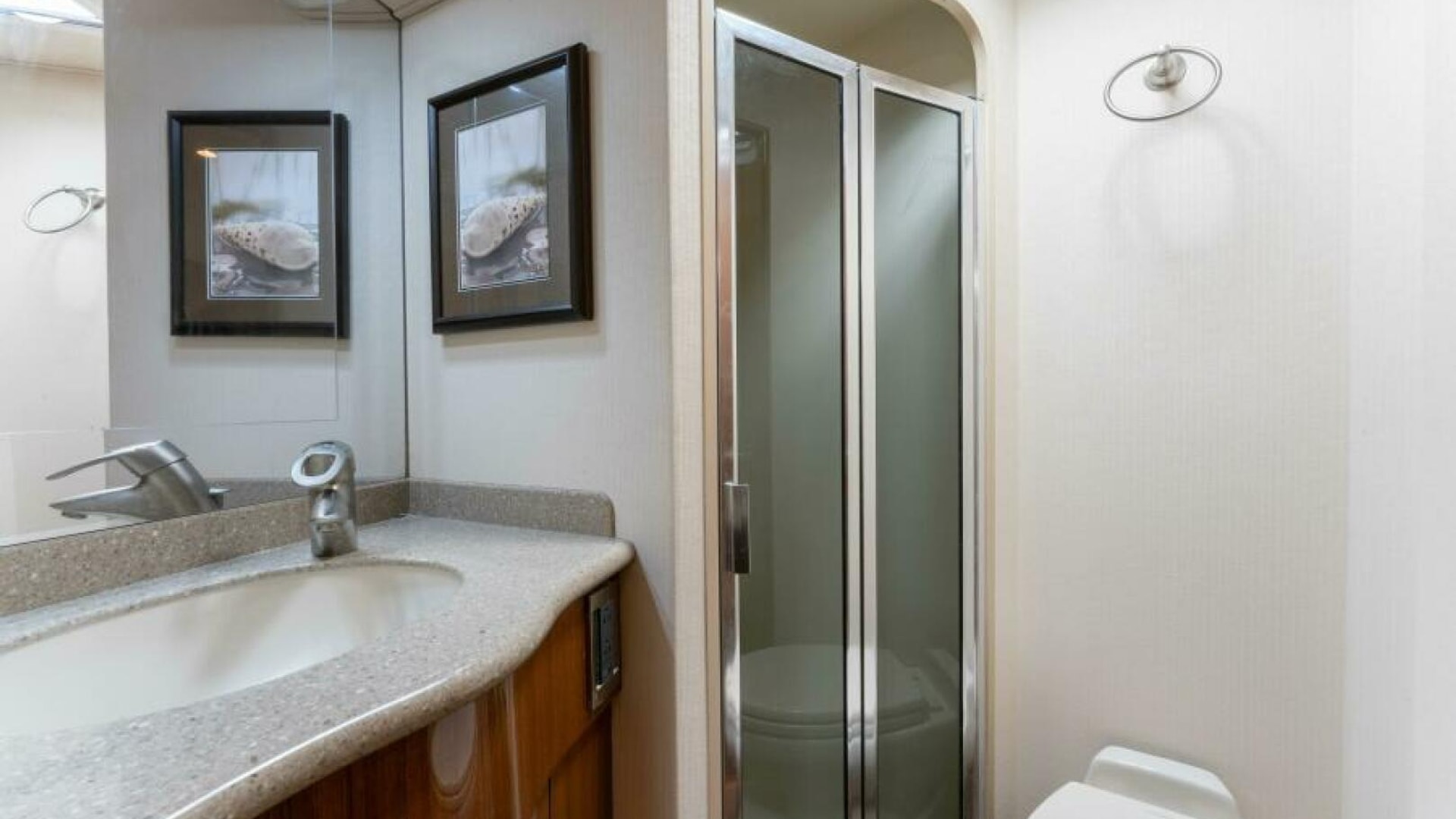- Full-sized shower with w/bench seat and sliding glass door