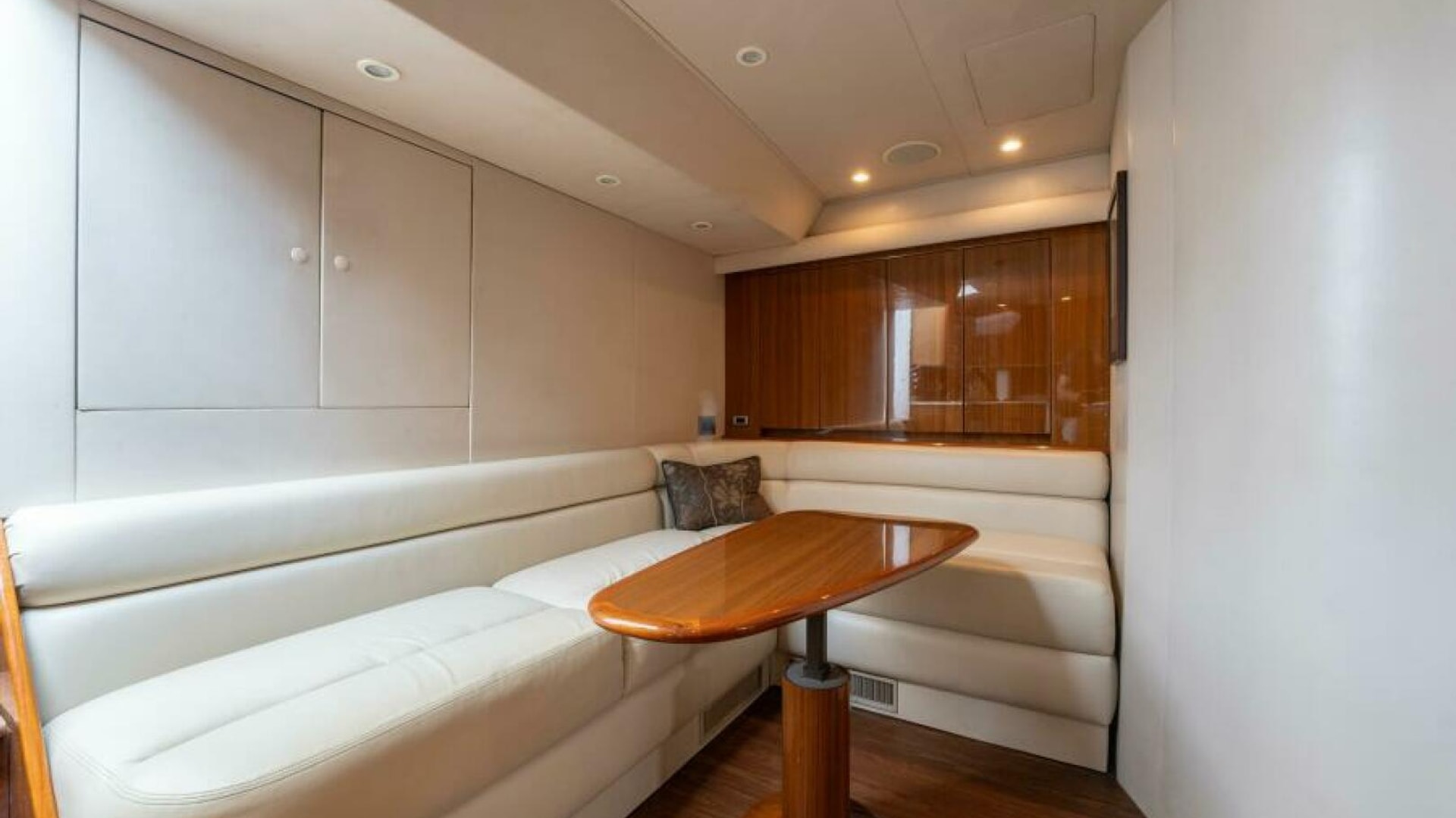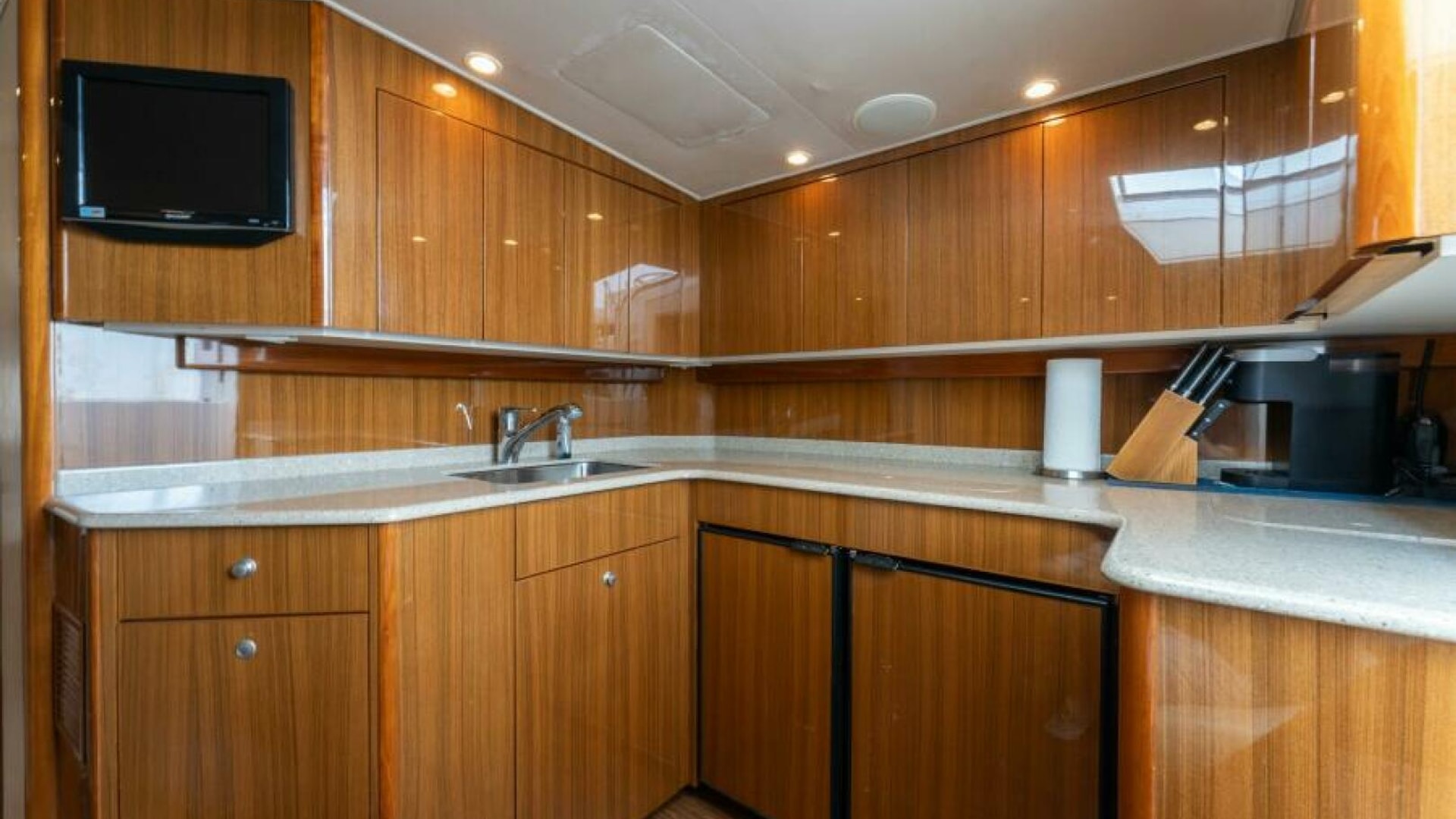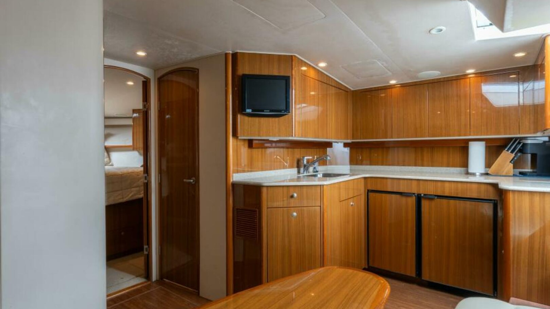 - High gloss teak cabinetry throughout