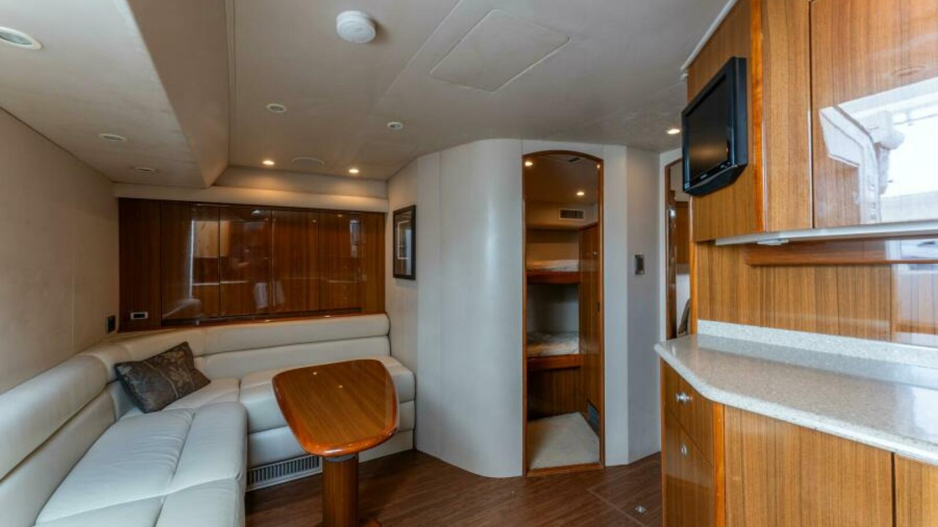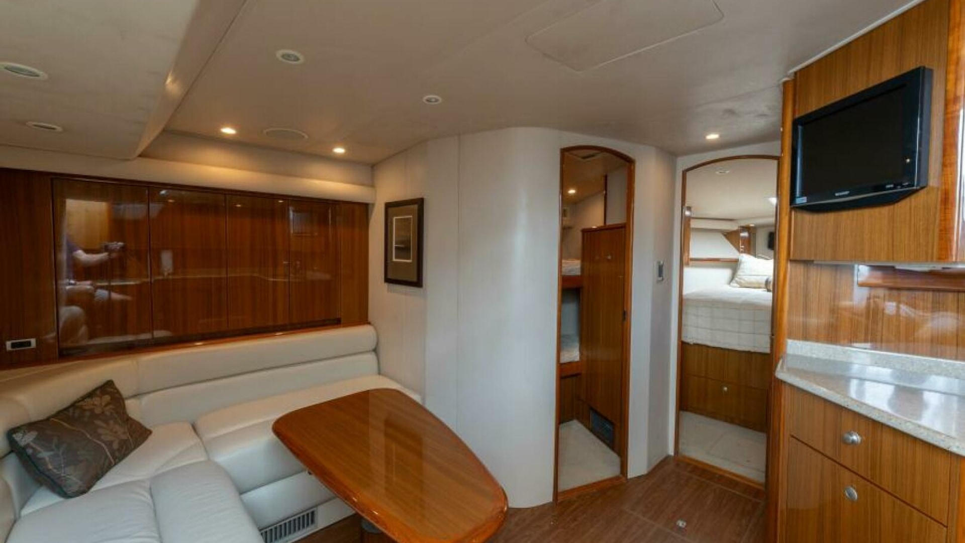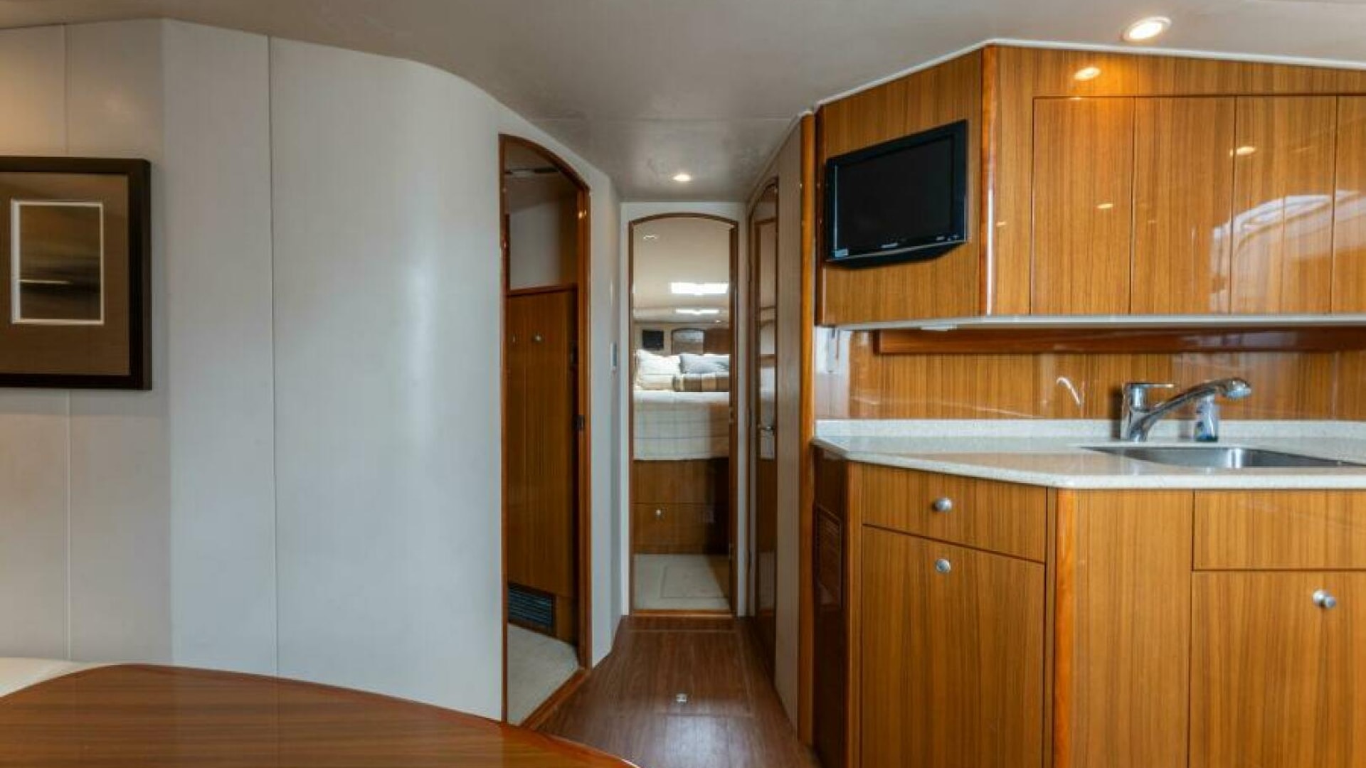 - High gloss teak cabinetry throughout