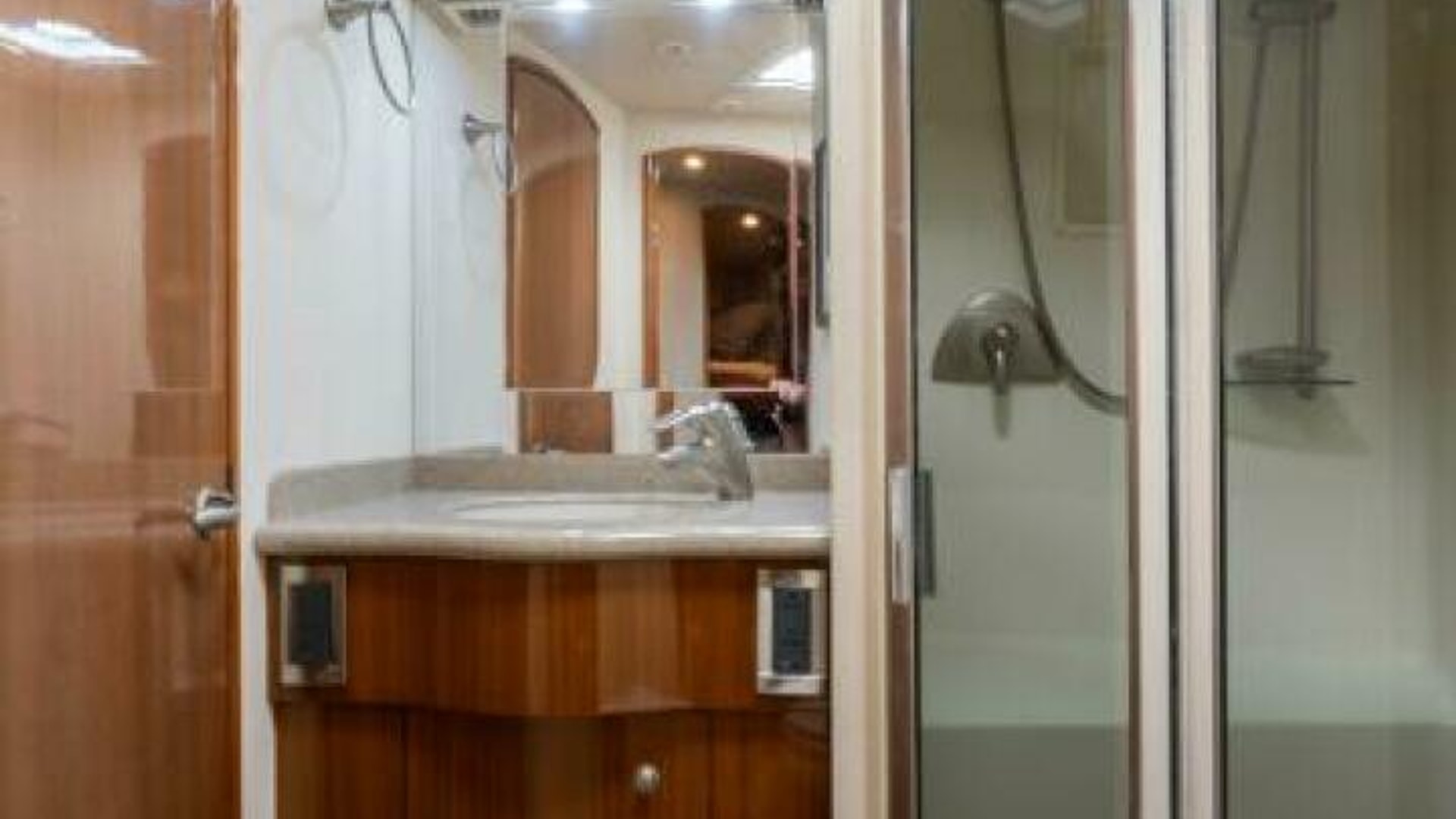 - High gloss teak cabinetry and appointments throughout