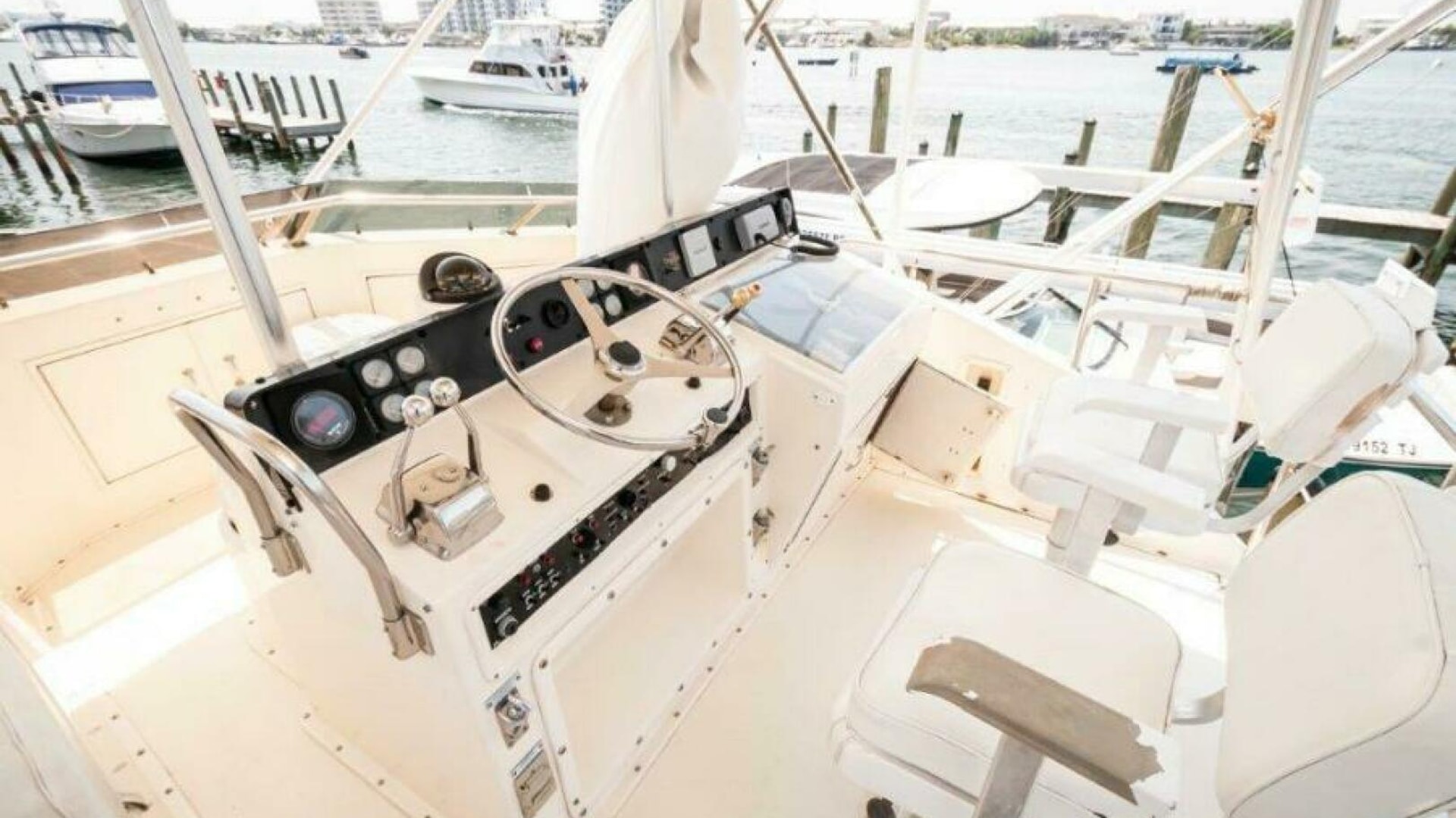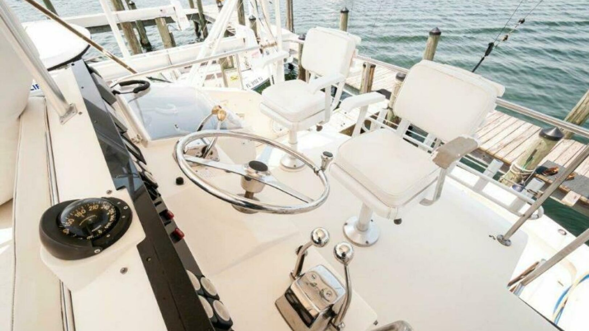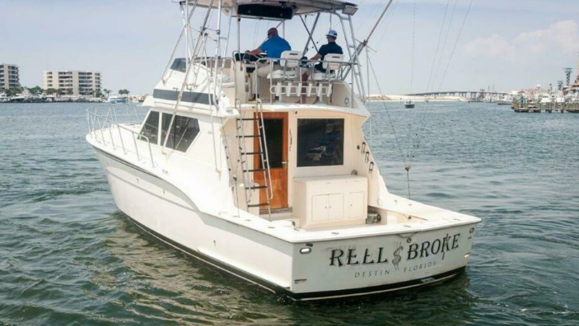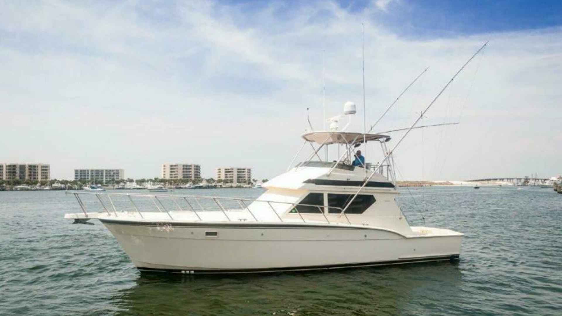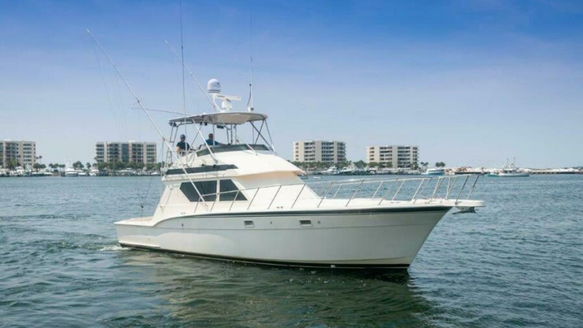1991 45 Hatteras Convertible Yacht REEL BROKE for sale. With extensive outfitting done in the last 18 months, REEL BROKE is ready for her next owner. The 692 Detroits have 1600 hours and less than 250 hours on the rebuilds with new turbos. The ship cruises at about 18 knots, burning 30-31g/hr combined. The top-end speed is about 21 knots. This ship’s 132-square-foot cockpit features a molded bait and tackle station, live well, in-deck fish box, and transom door with a coaming gate. Moving into the salon, you see a tasteful U-shaped seating starboard with a serving bar, upgraded entertainment system, and TV. The galley is located to port as we descend to the staterooms. The mid-ship master has a queen-sized island bed with a separate stall shower. The guest stateroom in the bow has over/under bunks starboard, washer and dryer opposite, and private access to the day head. The quality of care is apparent when walking through and around this boat. The bottom was cleaned every month; biweekly if fishing.