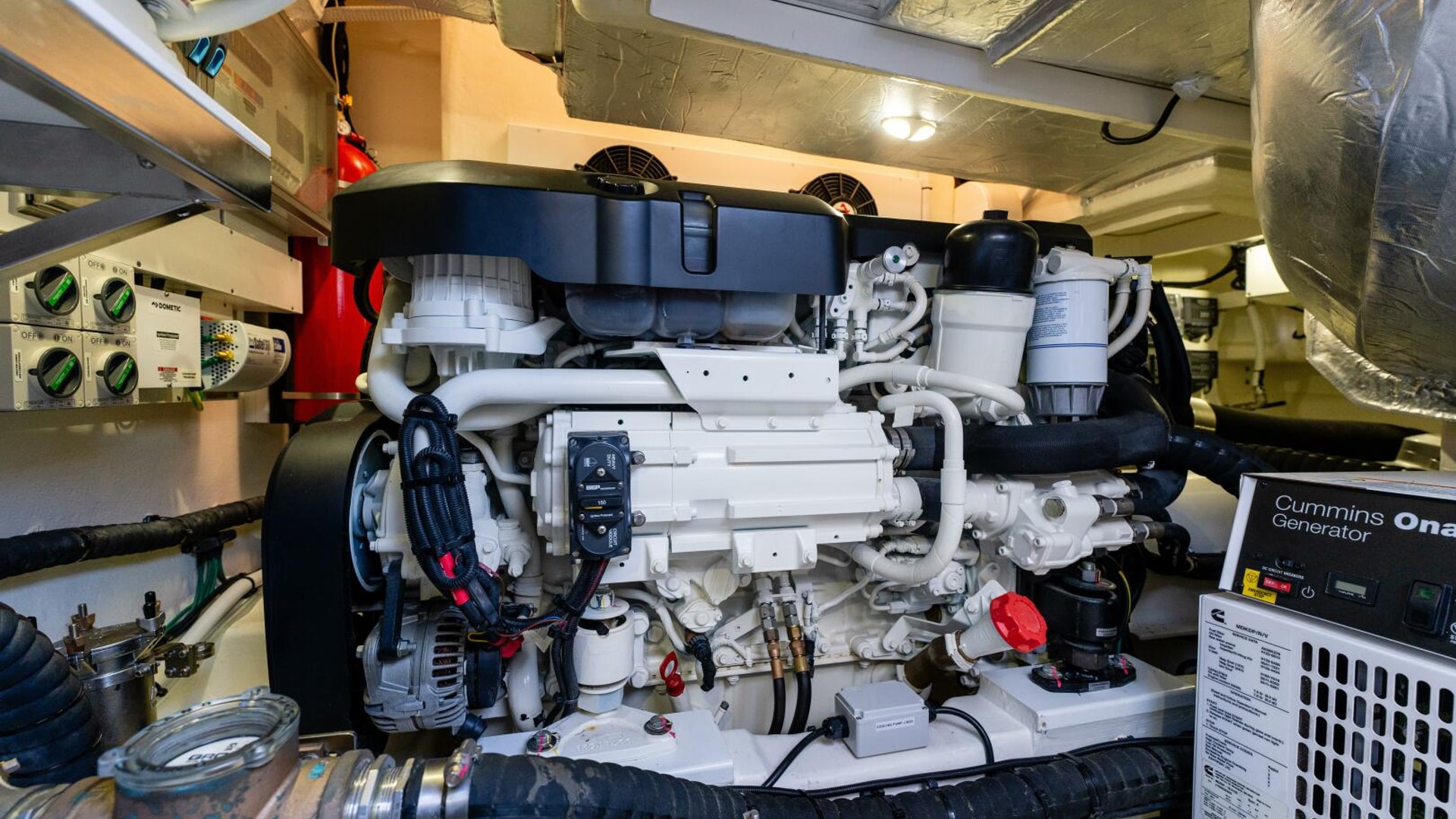 All batteries on board are maintenance-free to ensure carefree boating and are housed in special battery boxes. The two starting battery banks comprising two batteries per bank for the port and starboard engines. The house battery bank comprises two batteries, and there are two batteries in the auxiliary bank. Individual alternators for each in battery bank ensure charging systems are optimized whilst underway an an emergency parallel function provides increased reliability, just in case you are ever faced with a flat start battery bank. All battery banks are isolated at the main battery panel in the cockpit. The house power is 24v, which allows for simpler charging, lower current draw and smaller cables than equivalent 12v systems. The Mastervolt DC-AC inverter provides power to the icemaker, entertainment systems and one galley outlet.