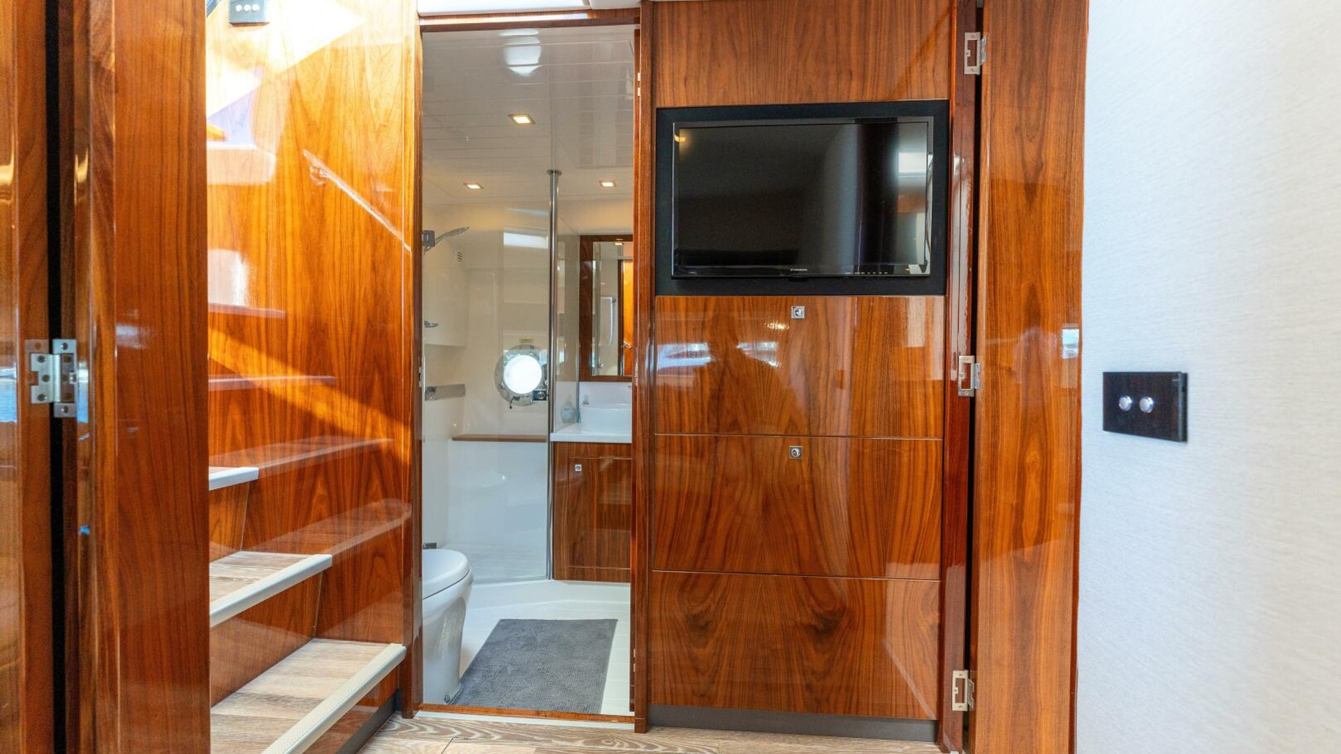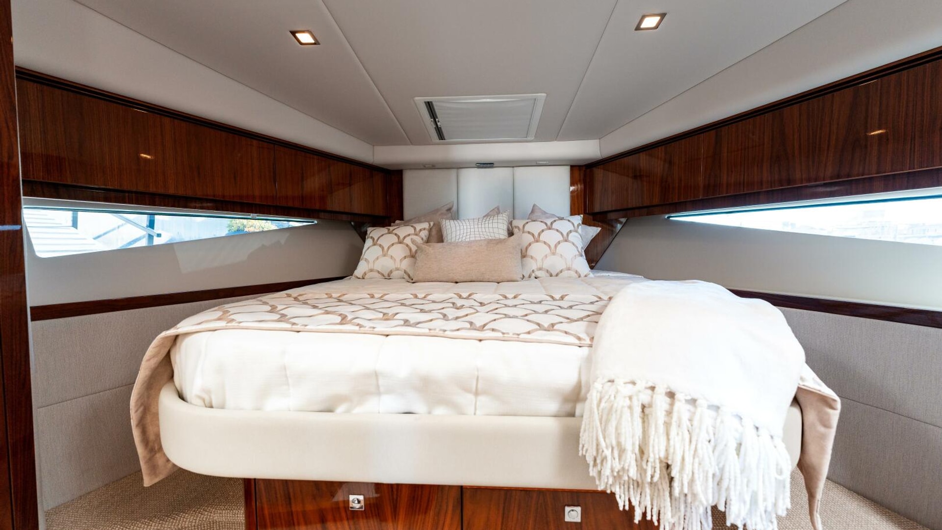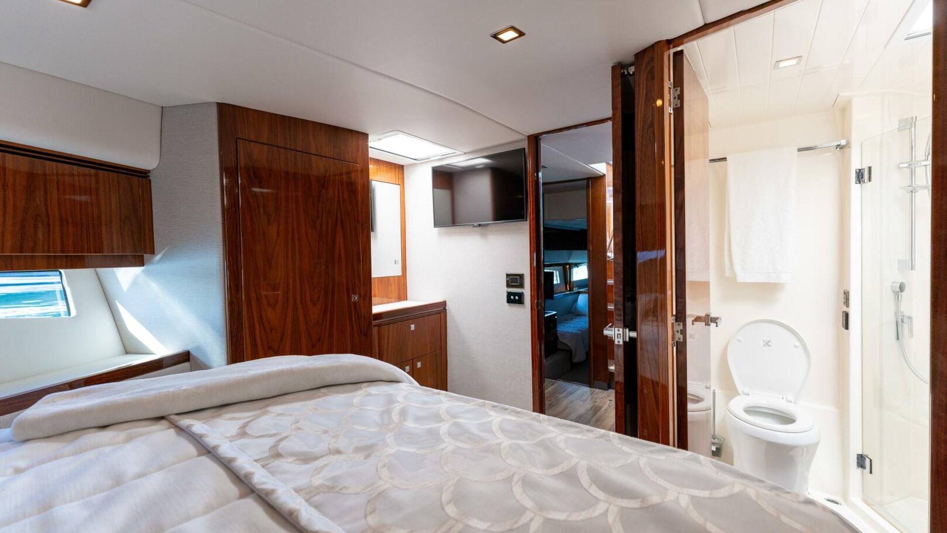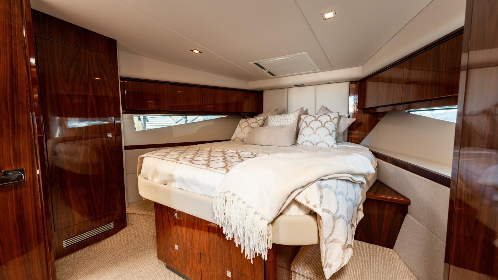 A master in every sense masterfully designed. Meticulously appointed. Riviera designers have relished the challenge and made the master of the 4800 Series II the next level in sport yacht accommodation luxury. The master is positioned forward for maximum privacy and can be optioned to considerably larger. Series II features a king sized bed with innerspring mattress and yes, it remains walk around. Storage space available beneath is also larger but gas struts make access easy. Plush pile carpet covers an increased overall floor area. The master’s handsome cabinetry is finished in grain-matched walnut with generous storage space and includes a larger starboard hanging locker and three drawer bureau with mirror. Integrated entertainment system with a 32" LED TV. Sweeping hull windows frame a panoramic views. Just next lies the master ensuite with designer vanity, sink, large shower and complementary luxury ambience.