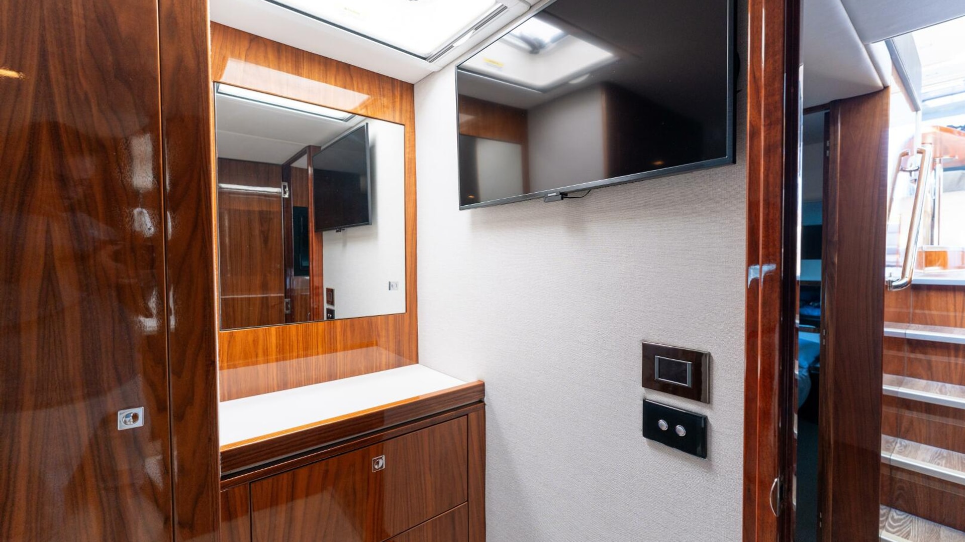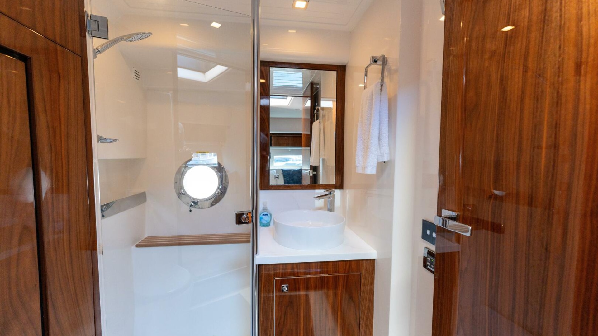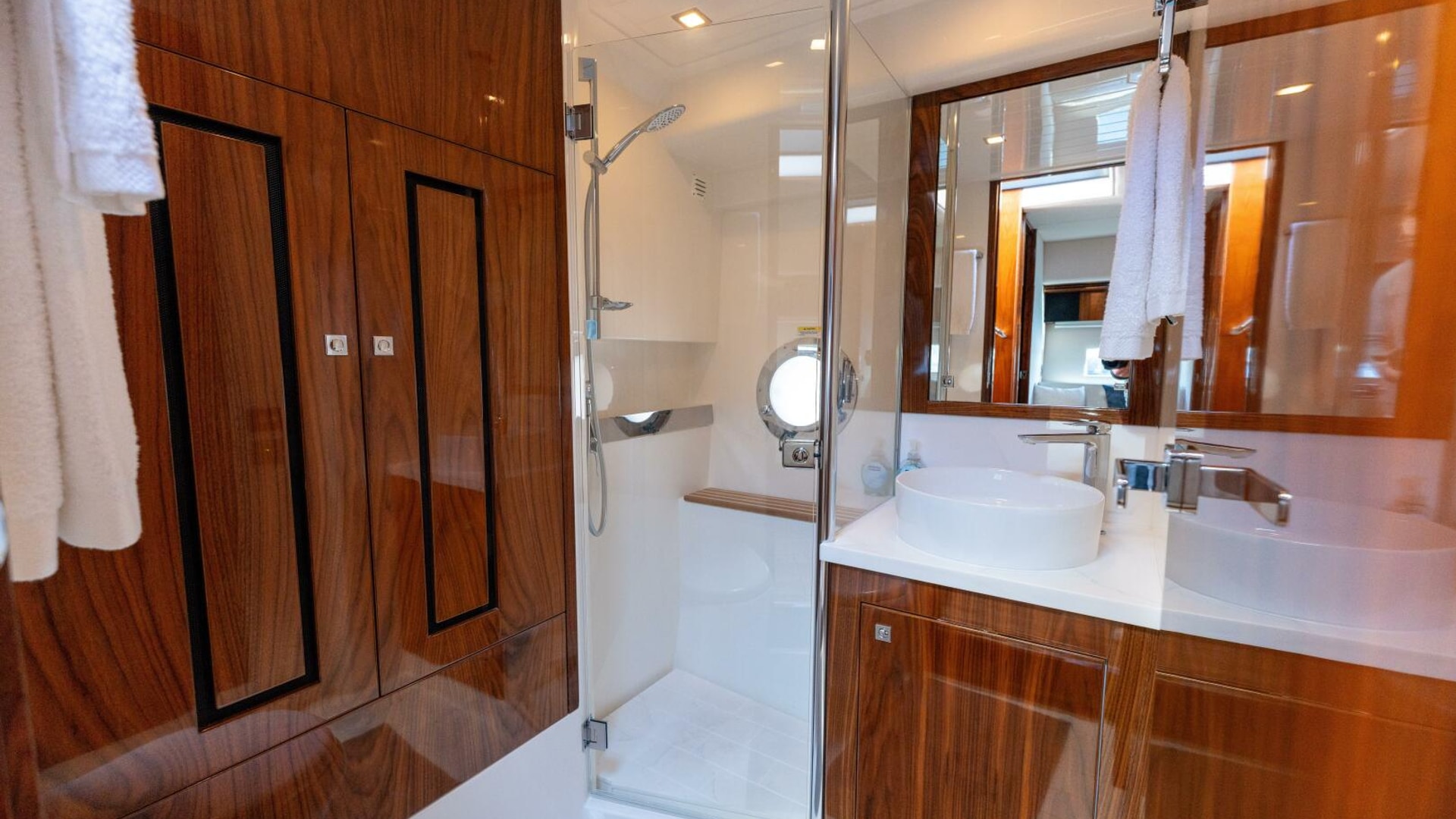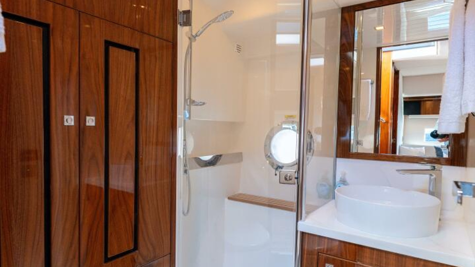 A master in every sense masterfully designed. Meticulously appointed. Riviera designers have relished the challenge and made the master of the 4800 Series II the next level in sport yacht accommodation luxury. The master is positioned forward for maximum privacy and can be optioned to considerably larger. Series II features a king sized bed with innerspring mattress and yes, it remains walk around. Storage space available beneath is also larger but gas struts make access easy. Plush pile carpet covers an increased overall floor area. The master’s handsome cabinetry is finished in grain-matched walnut with generous storage space and includes a larger starboard hanging locker and three drawer bureau with mirror. Integrated entertainment system with a 32" LED TV. Sweeping hull windows frame a panoramic views. Just next lies the master ensuite with designer vanity, sink, large shower and complementary luxury ambience.