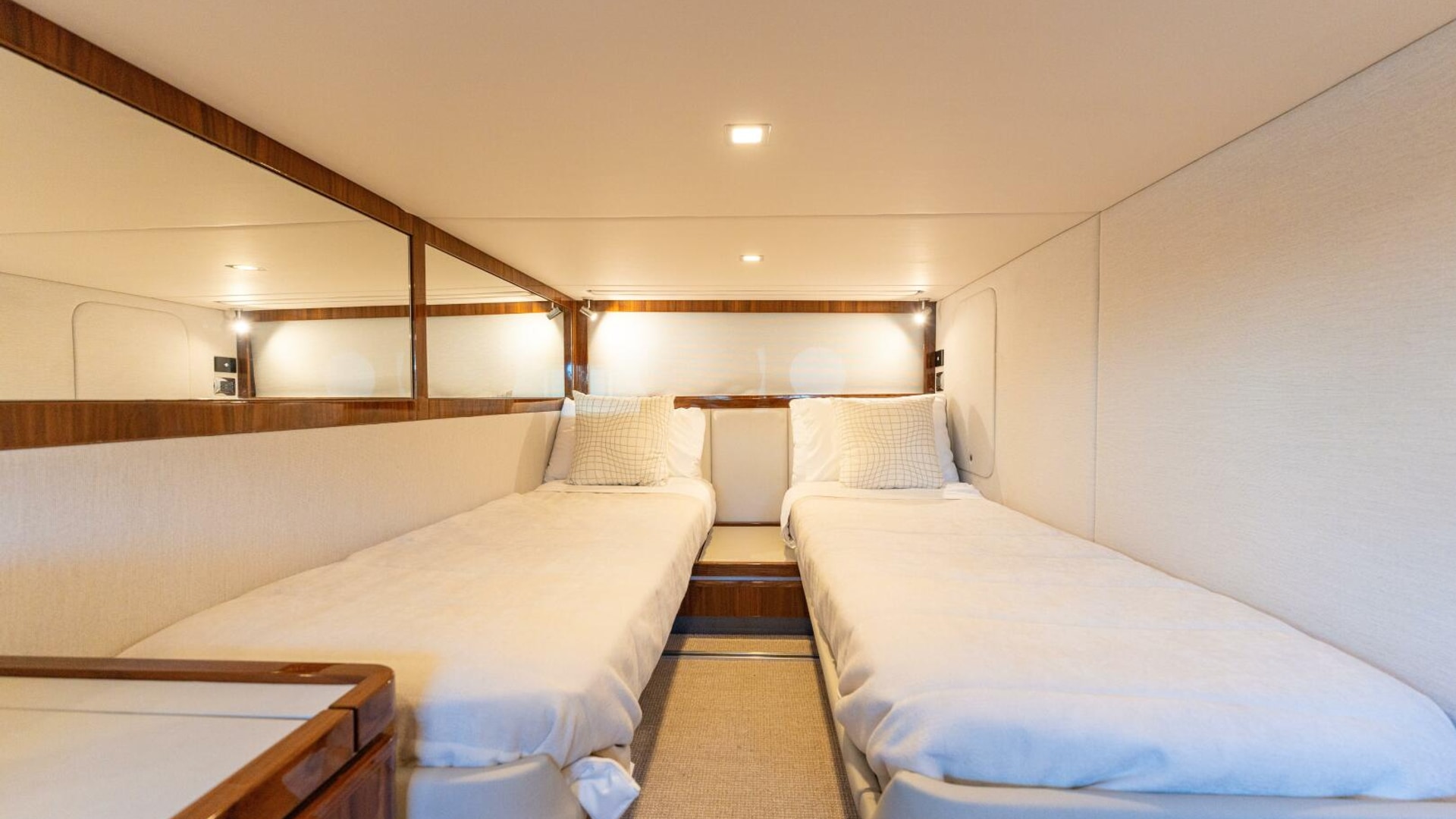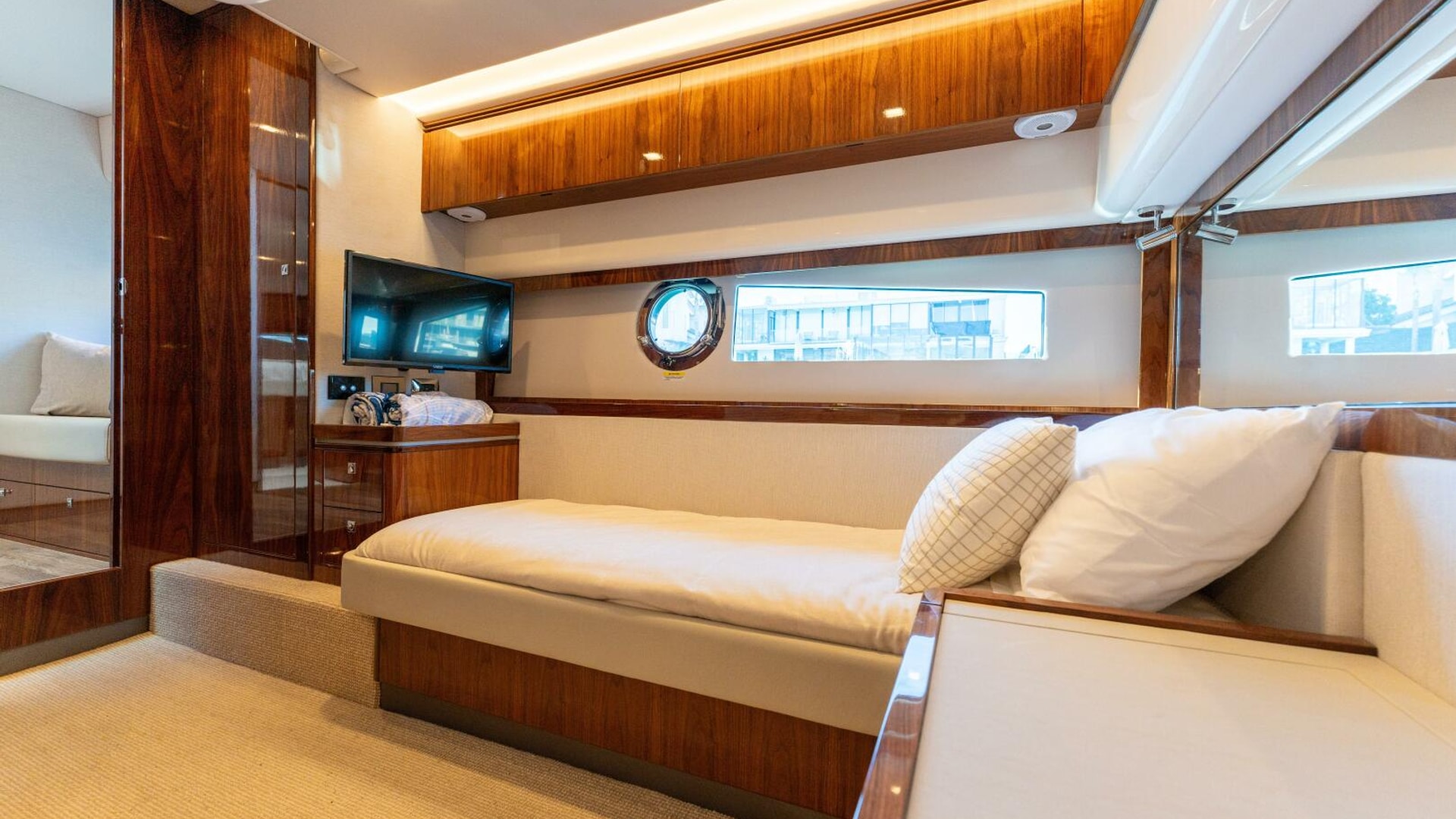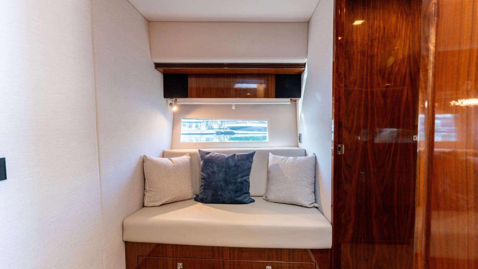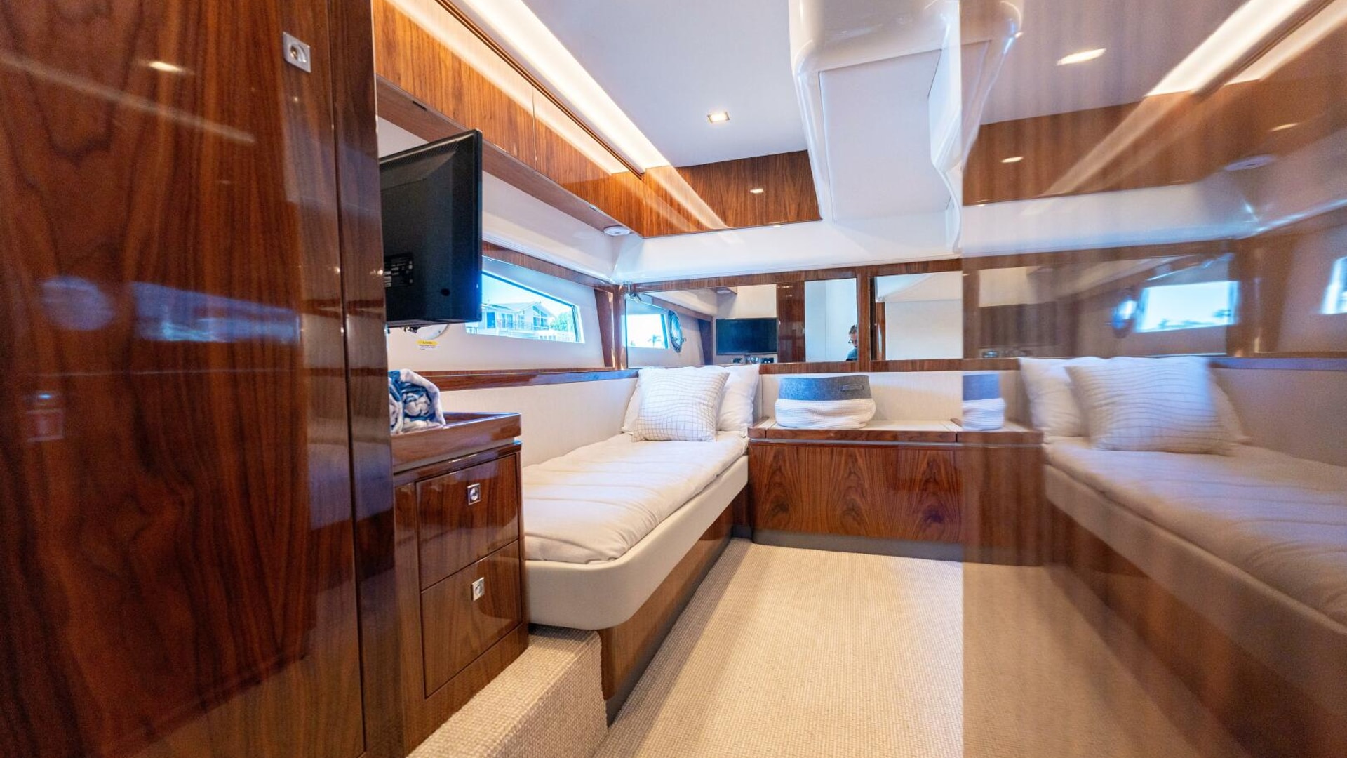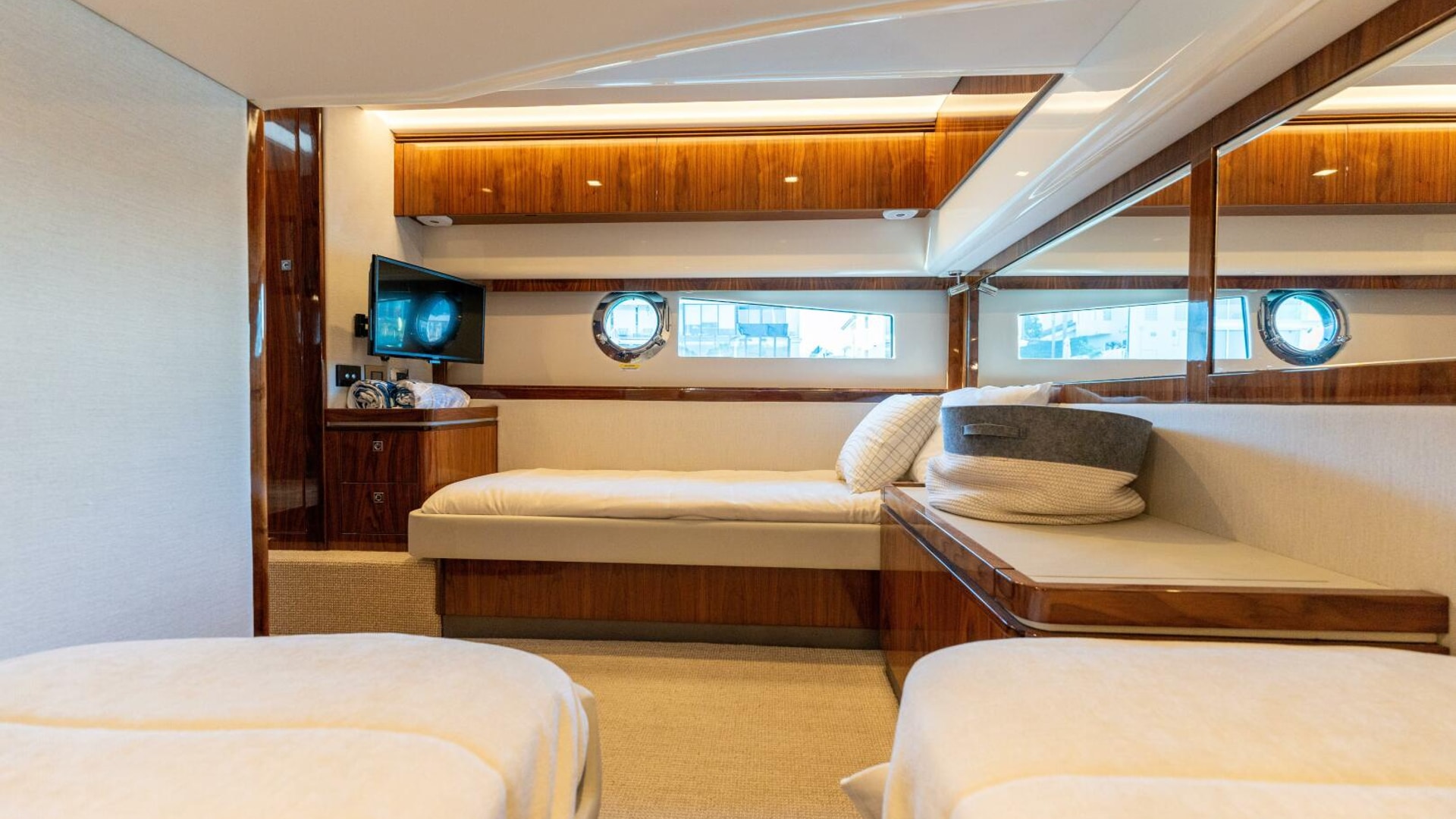 Here the Riviera team's attention to detail shines. In the aft stateroom, your guests will want for nothing. Their needs have all been carefully considered and duly accommodated with style and flair. They’ll have LED lighting overhead, plush pile carpet at their feet, reverse cycle air conditioning to warm and cool them and a fragrant cedar-lined locker to hang their clothes. Their suitably luxurious ensuite is fit to grace the pages of Designer Bathrooms. Riviera designers have also built in a high degree of flexibility. The stateroom is large enough to accommodate three adult-sized single beds with ease. Your guests have the option of sliding together the two portside to form a double bed for couples.