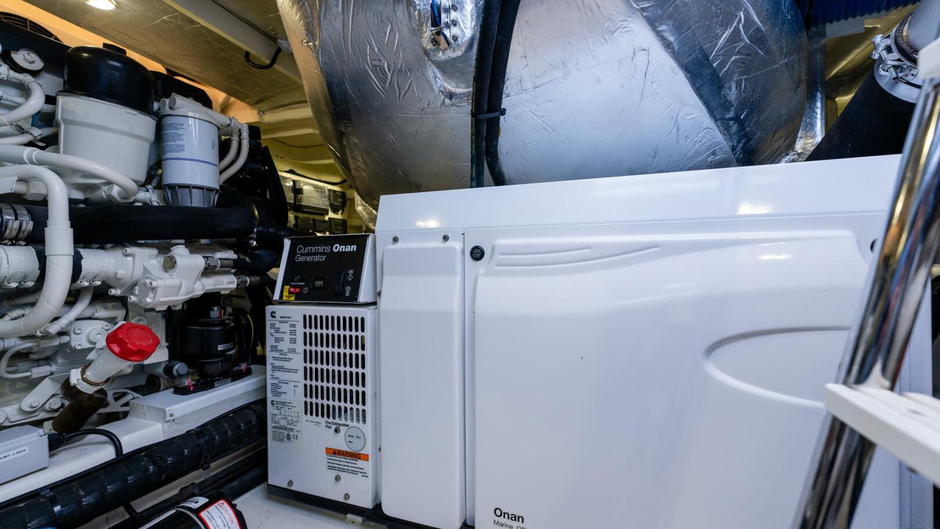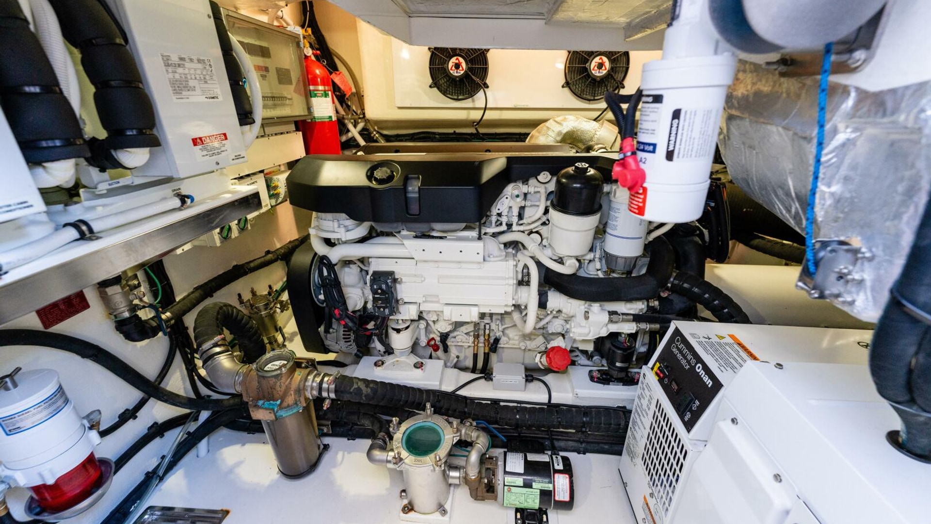 Access to the engine room - with acoustic and thermal insulation and LED lighting - is via a deck hatch from the cockpit. It's here that you will really begin to appreciate the careful consideration for which Riviera is renowned globally in terms of its engine rooms. The impressive commercial intake system helps to keep the engine room temperature well below the engine manufacturer's formal recommendation, reducing the fuel consumption even further, while the air-conditioning units are mounted high so gravity feeds condensation water into the common drain lines located on either side of the yacht and which drain aft and overboard. All onboard drains also feed into these common drain lines while the advances mist elimination system with veins draws moisture from the air and feeds directly overboard. Four automatic bilge pumps with manual override are located at various points throughout the hull and also pump directly overboard.